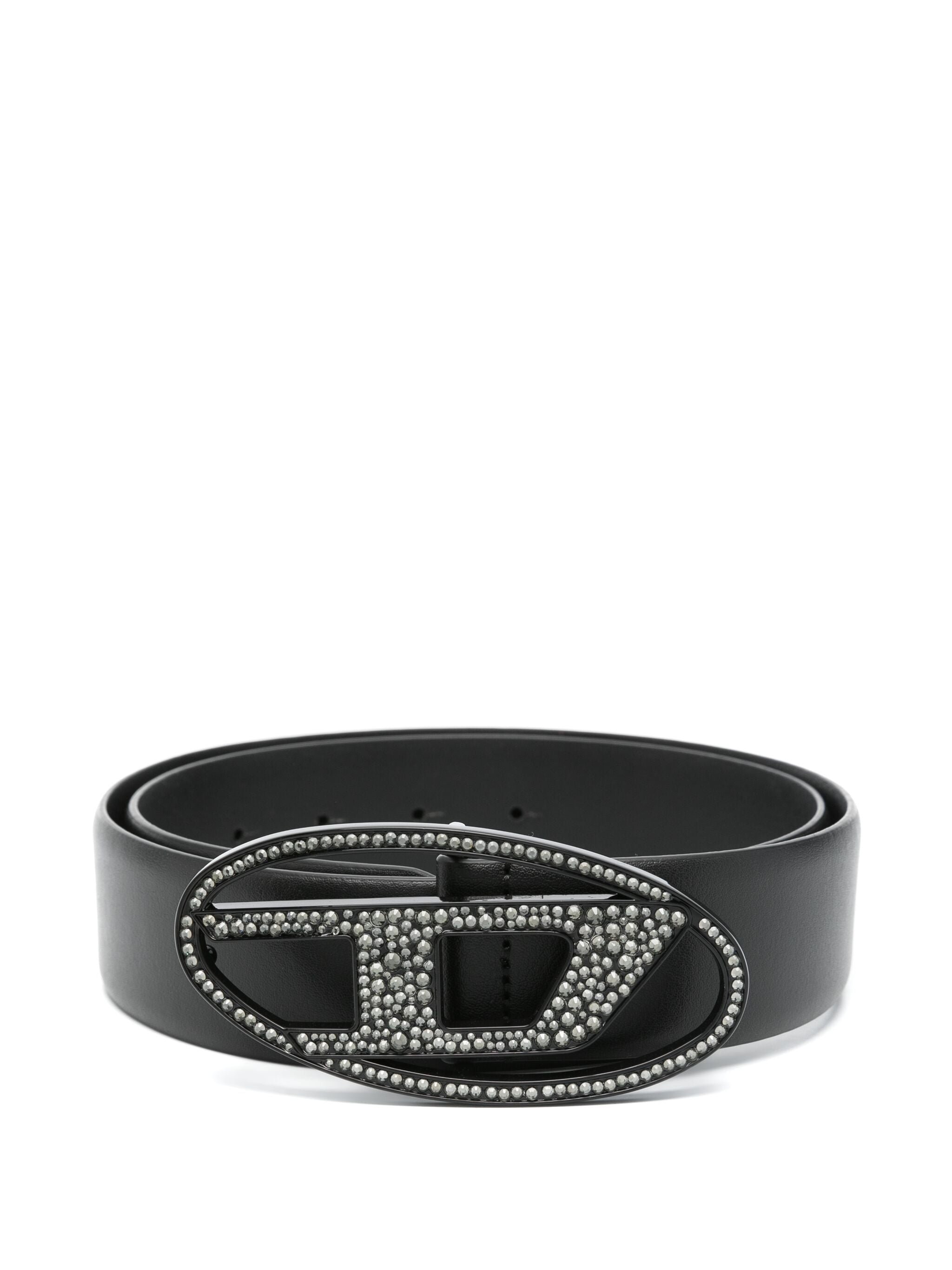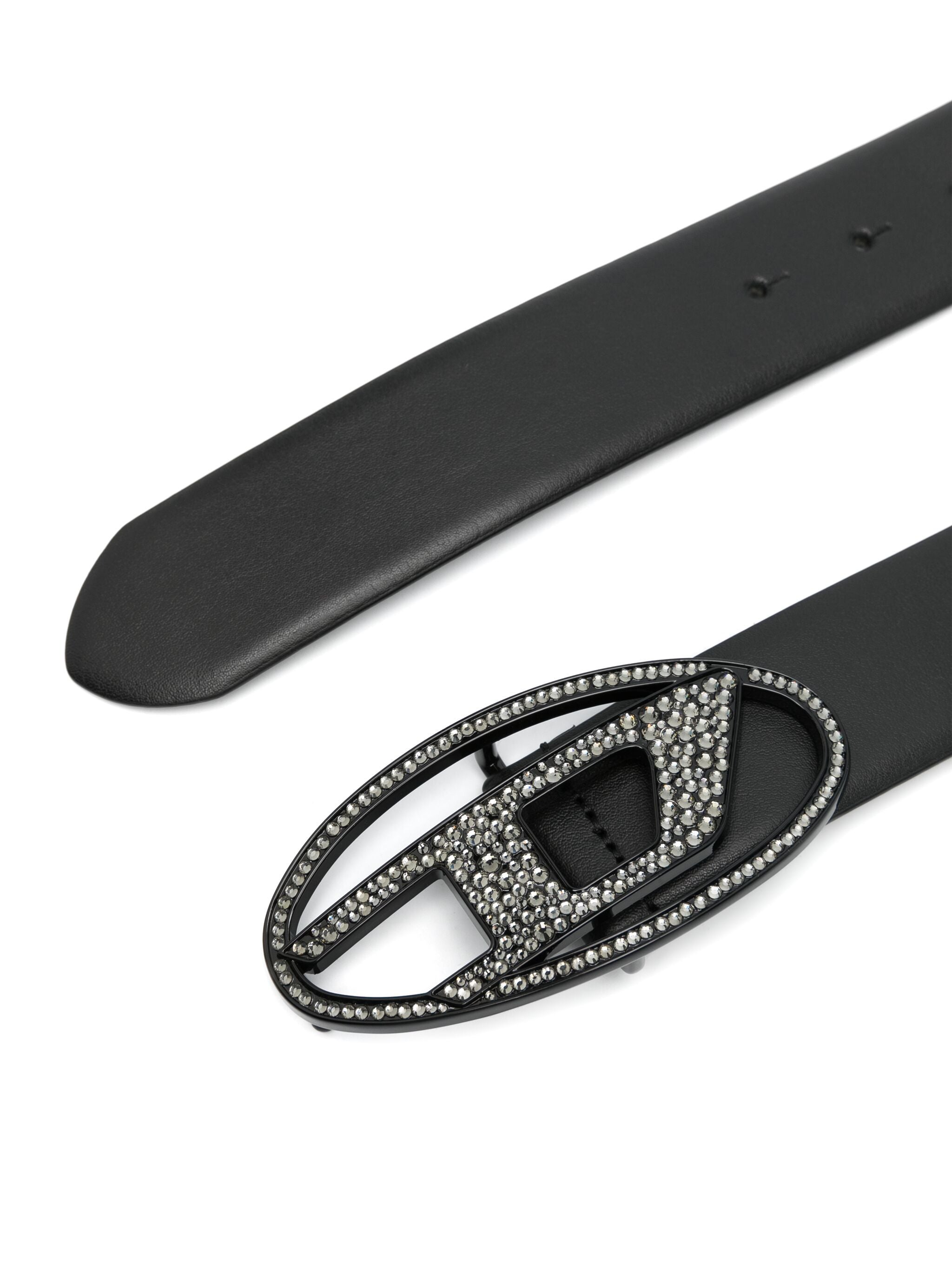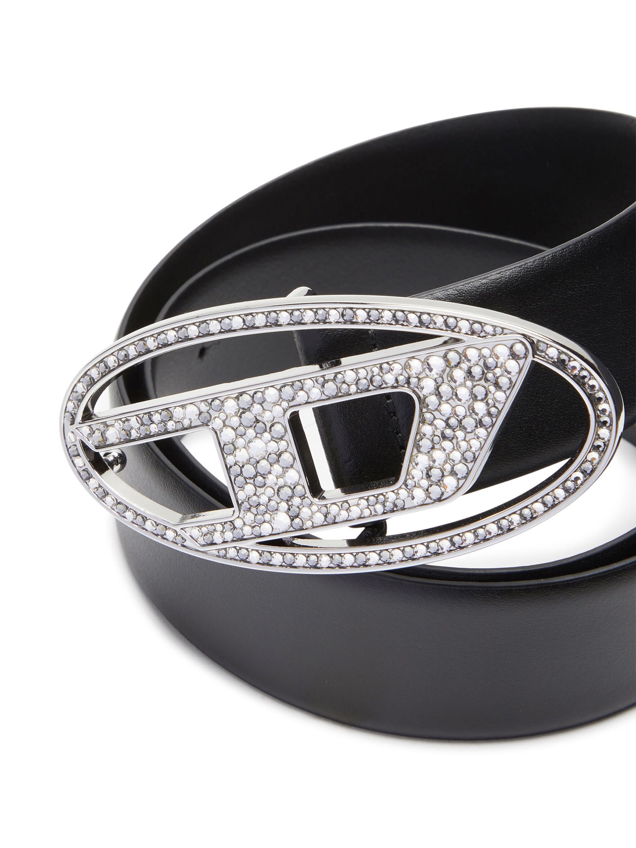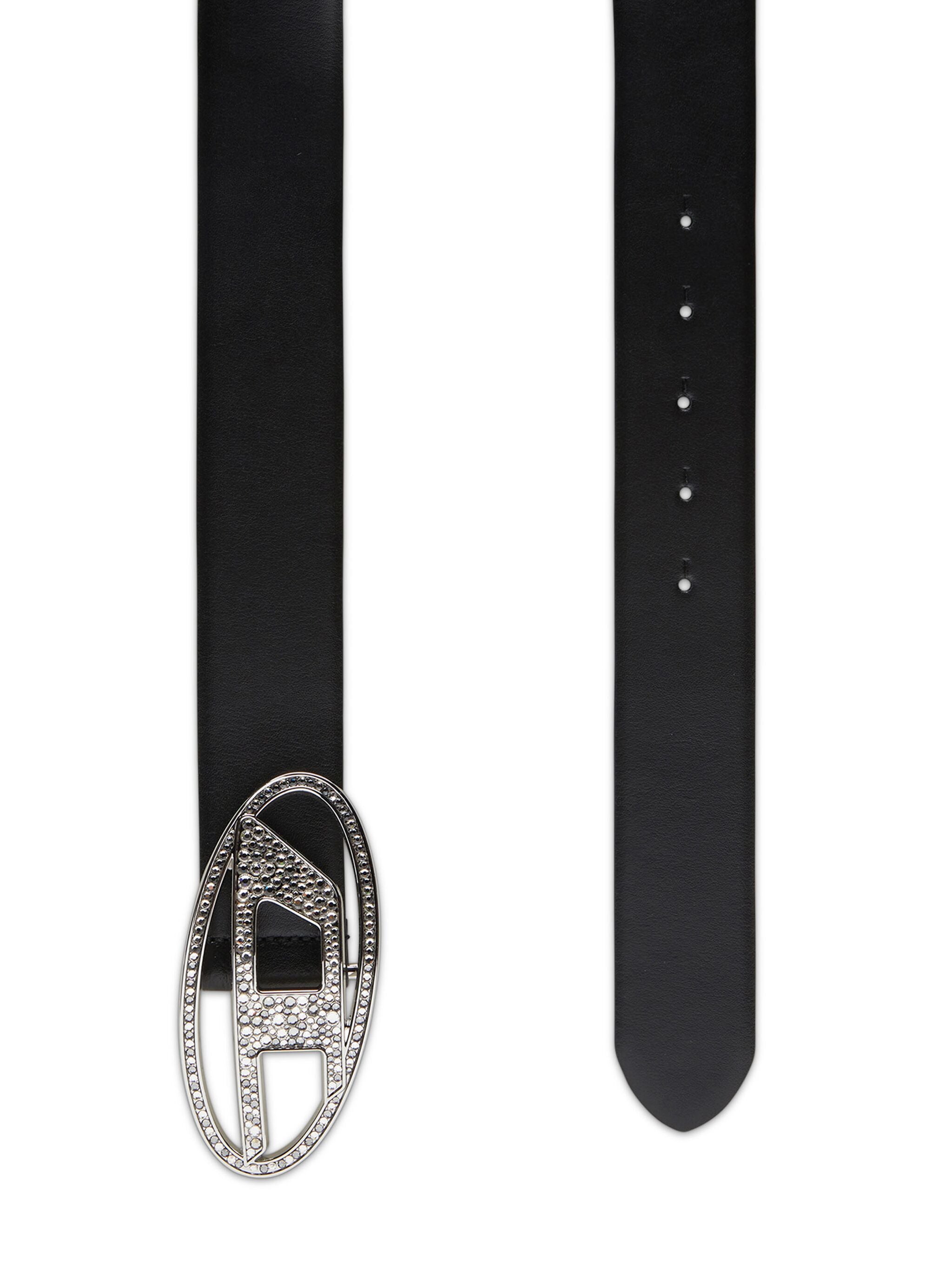 Cintura in pelle italiana impreziosita da una fibbia Oval D con cristalli.