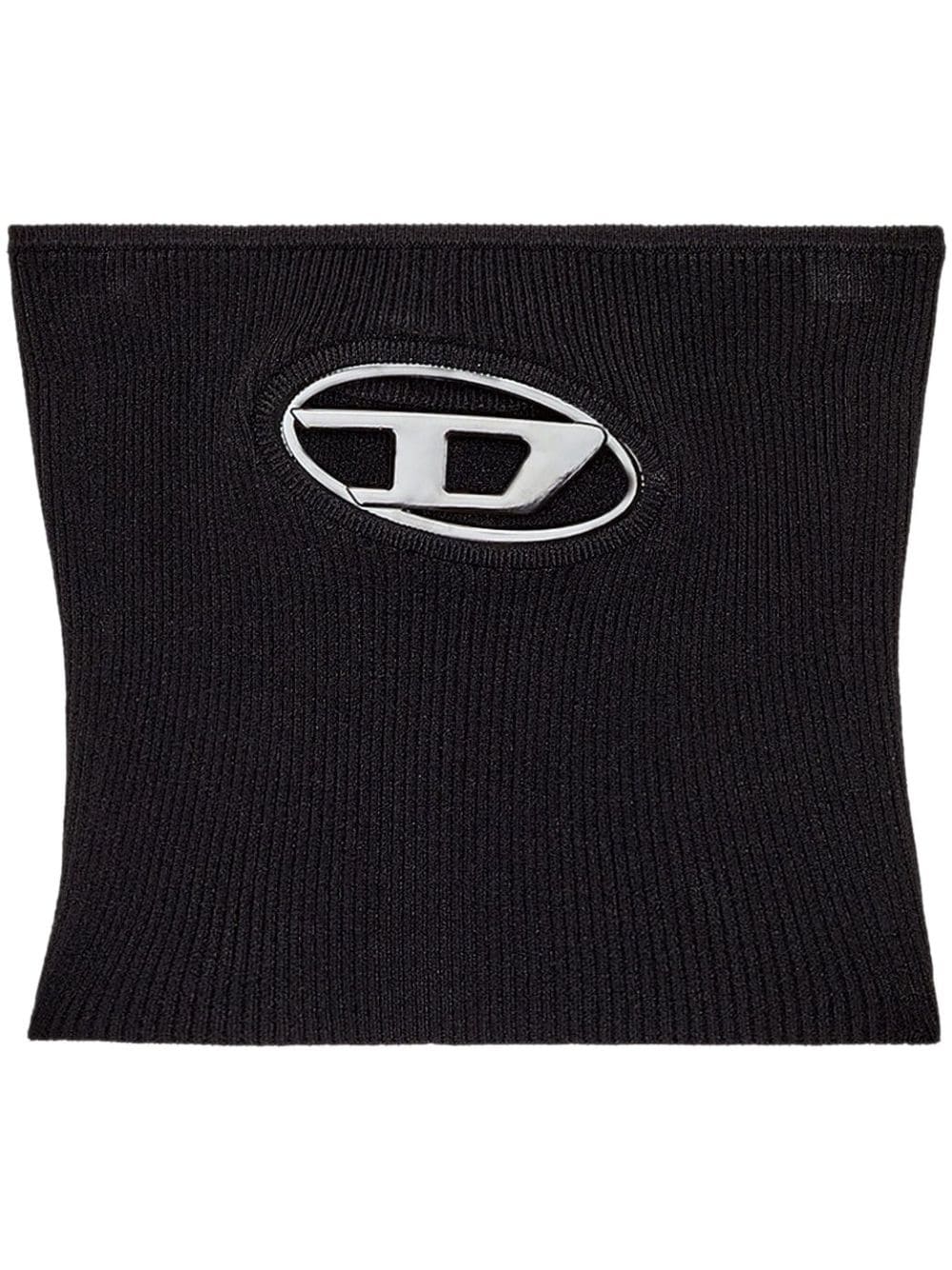 black stretch-design ribbed knit silver-tone logo plaque enamel detail cut-out detailing square neck strapless cropped