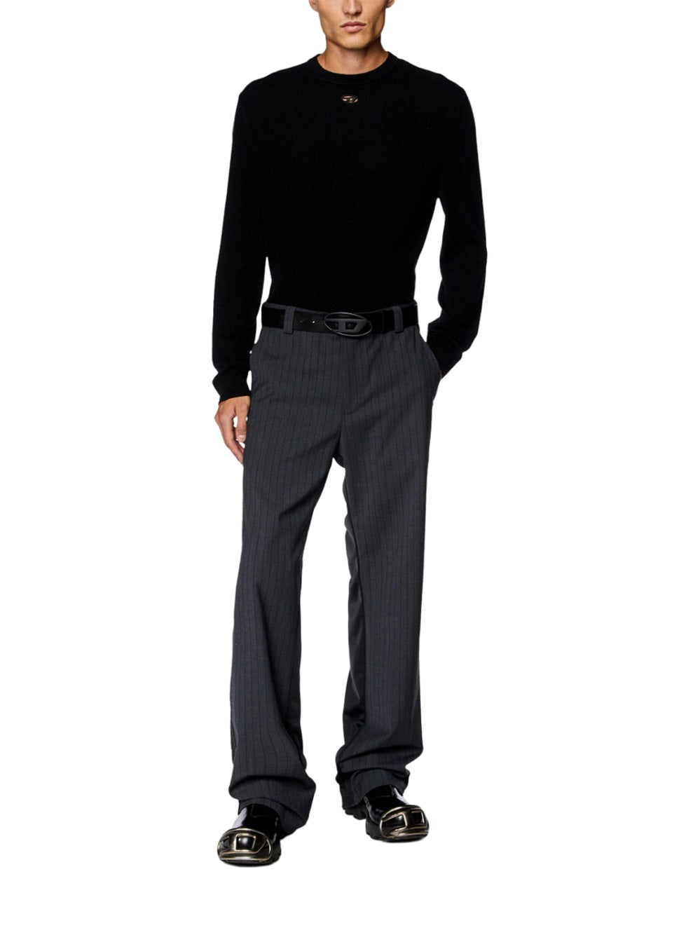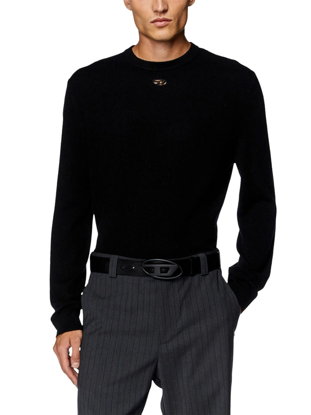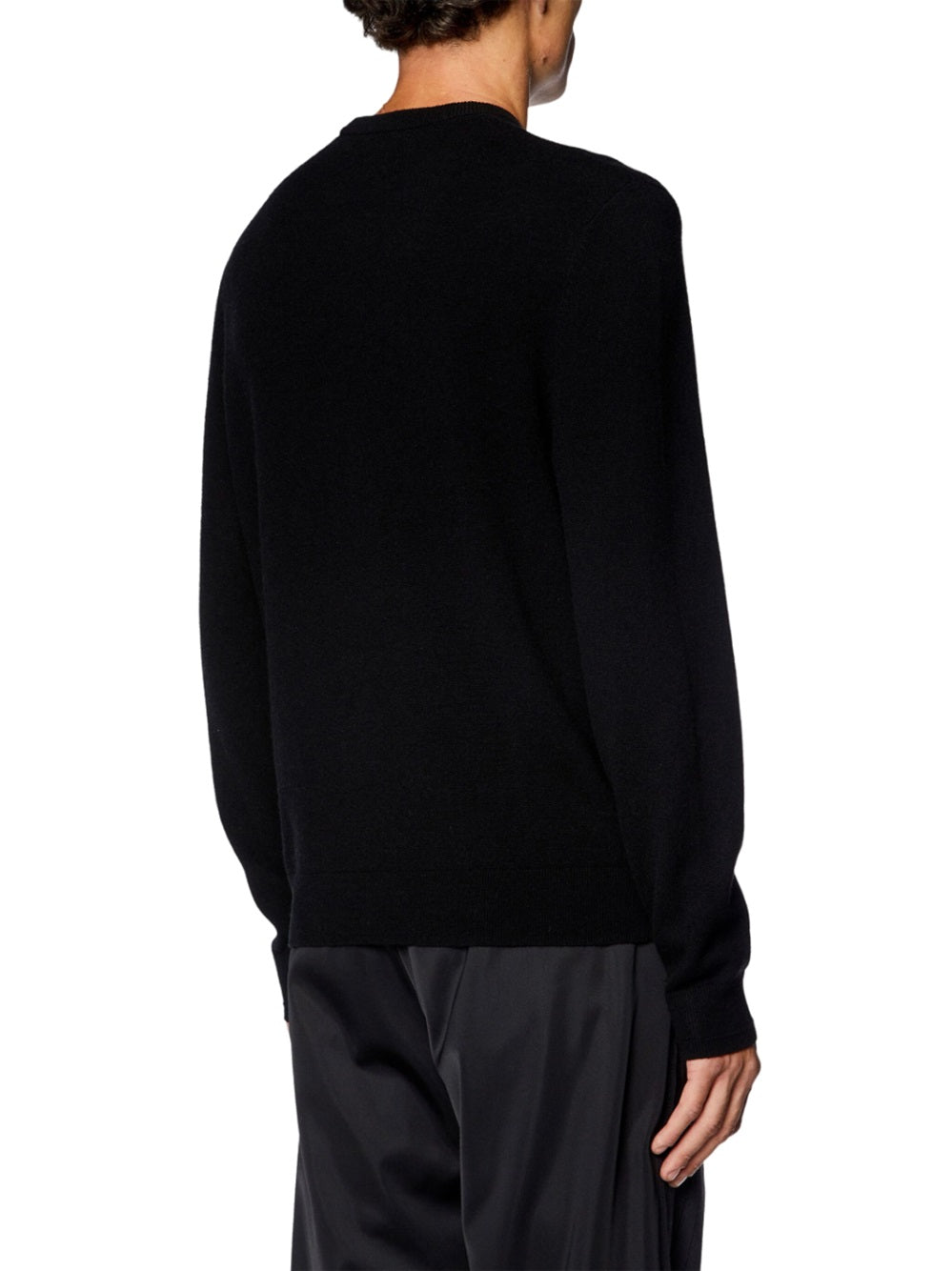 Black, fine knit, front logo embroidery, cut-out details, crew neck, dropped shoulder sleeves and long sleeves.