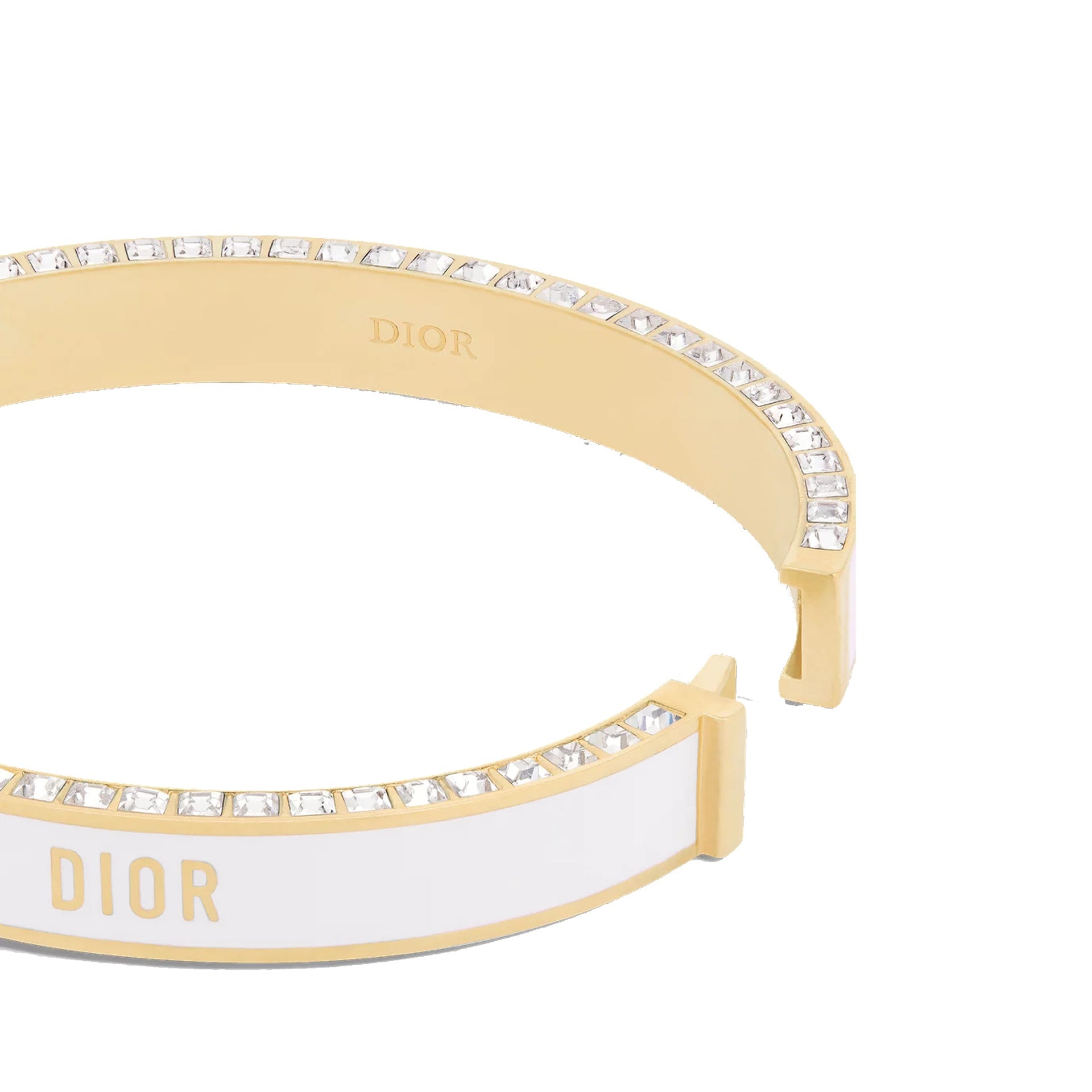- Composition: 100% Metal - Gold finishing - White crystals - Christian Dior signature - White milk lacquer - Hinged clasp - Width 0.7 cm - Size 6.7 x 6.1 cm - Made in EU -