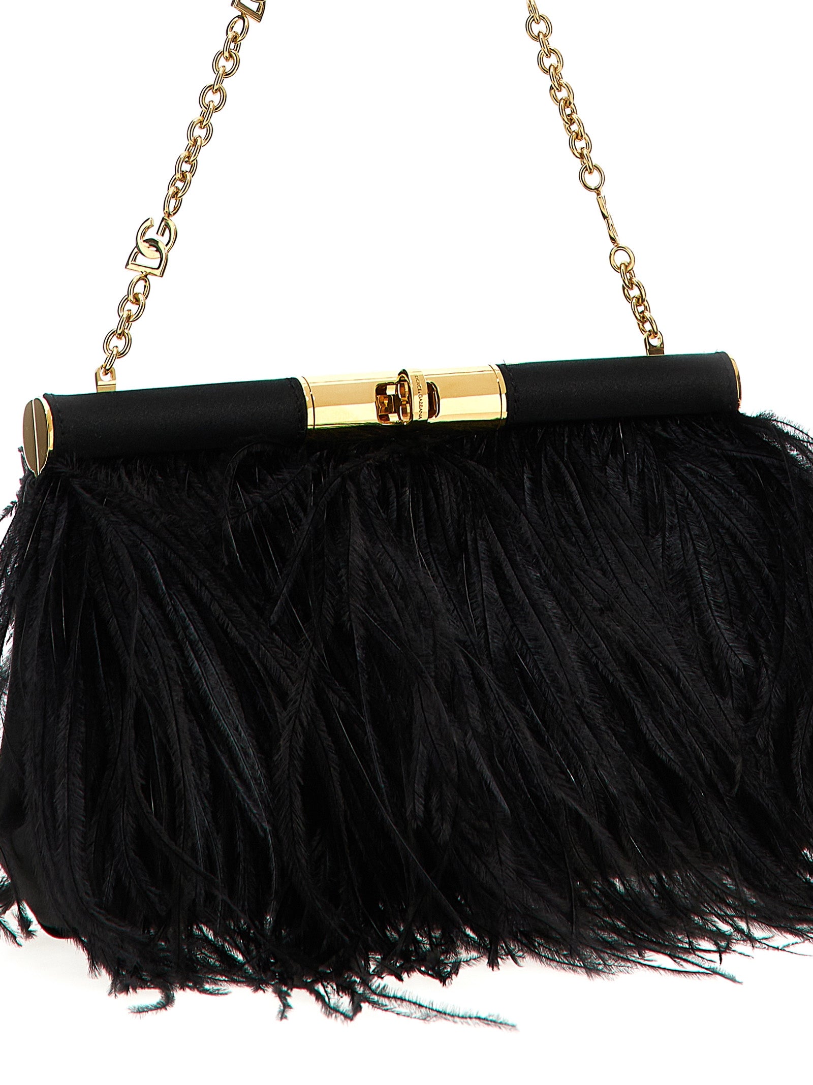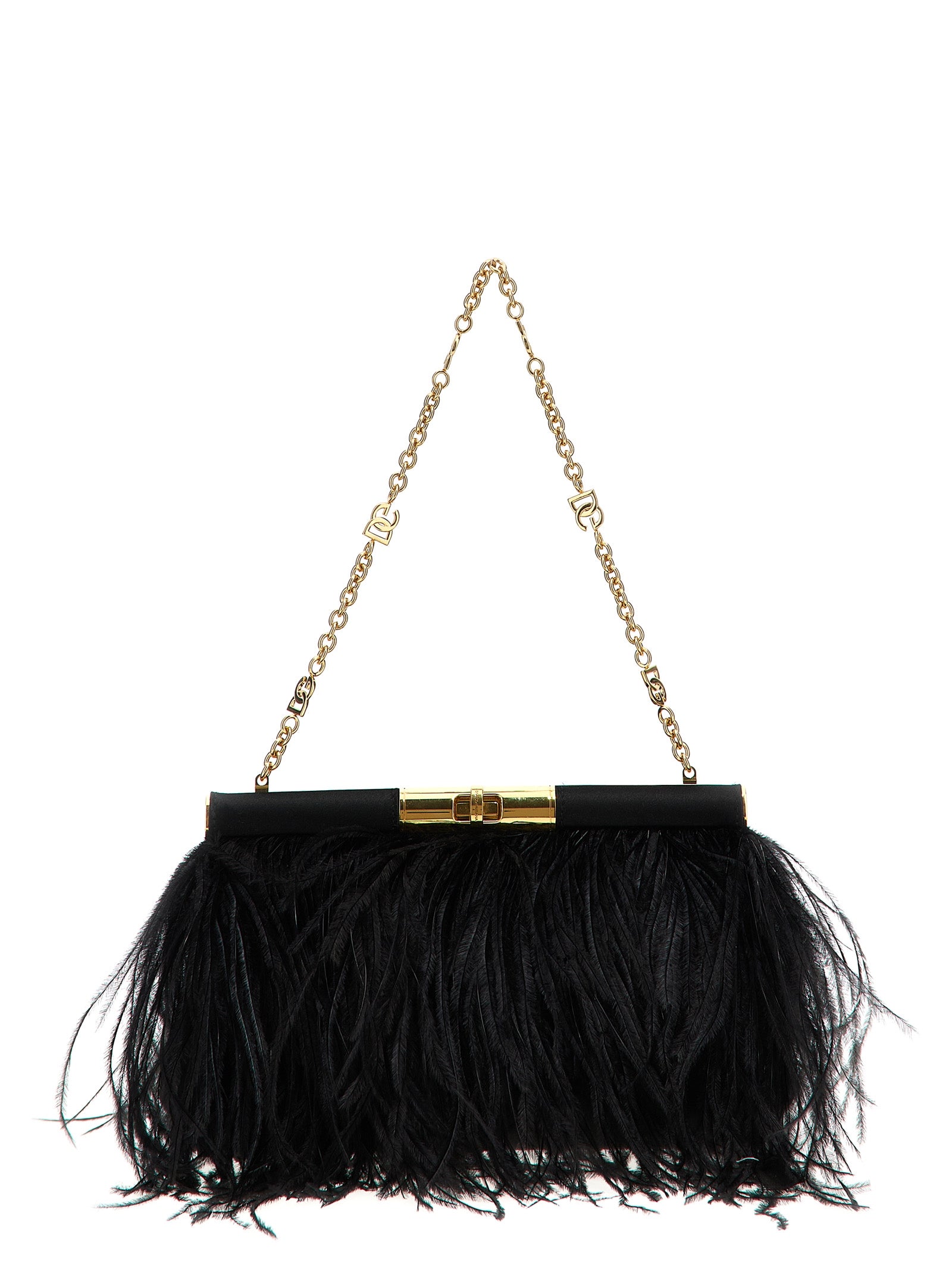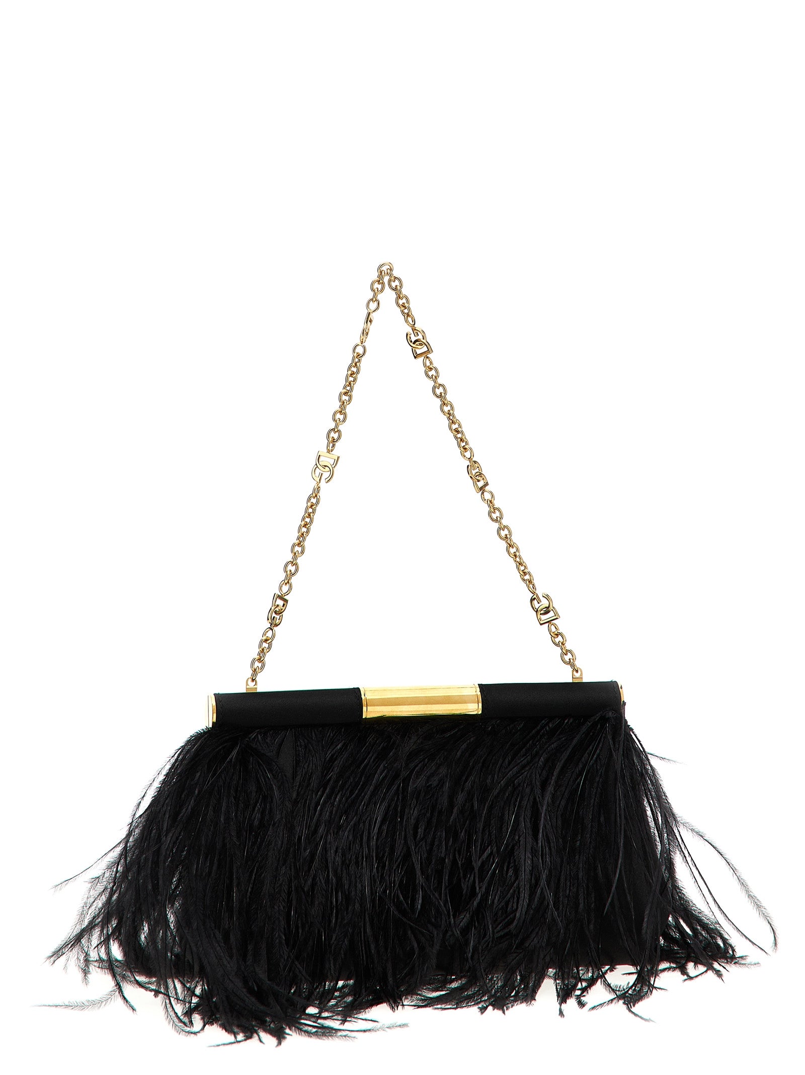 Marlene' medium shoulder bag in satin with ostrich feathers, vintage brass swivel closure, chain shoulder strap.