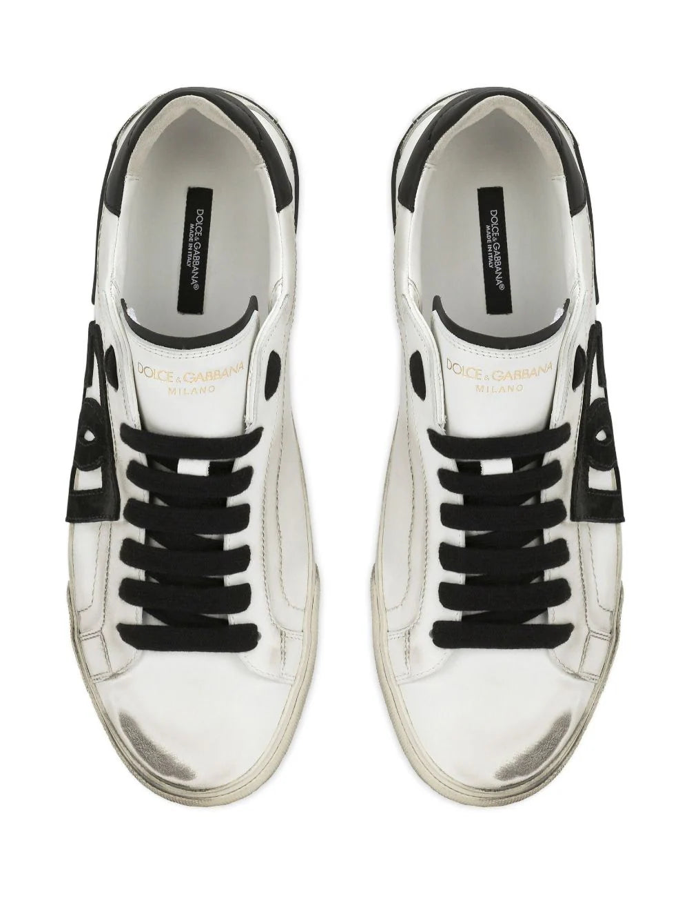 Calfskin, distressed effect, side logo patch, embossed logo tongue, rubber-coated logo detail, round toe, lace-up front fastening, logo insole and flat rubber sole.