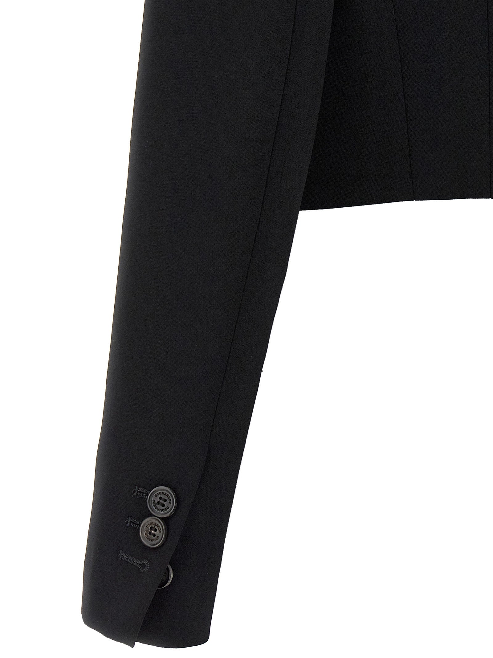 'D2 Jewel' short jacket, front jewel hook closure, structured shoulder straps, long sleeves.