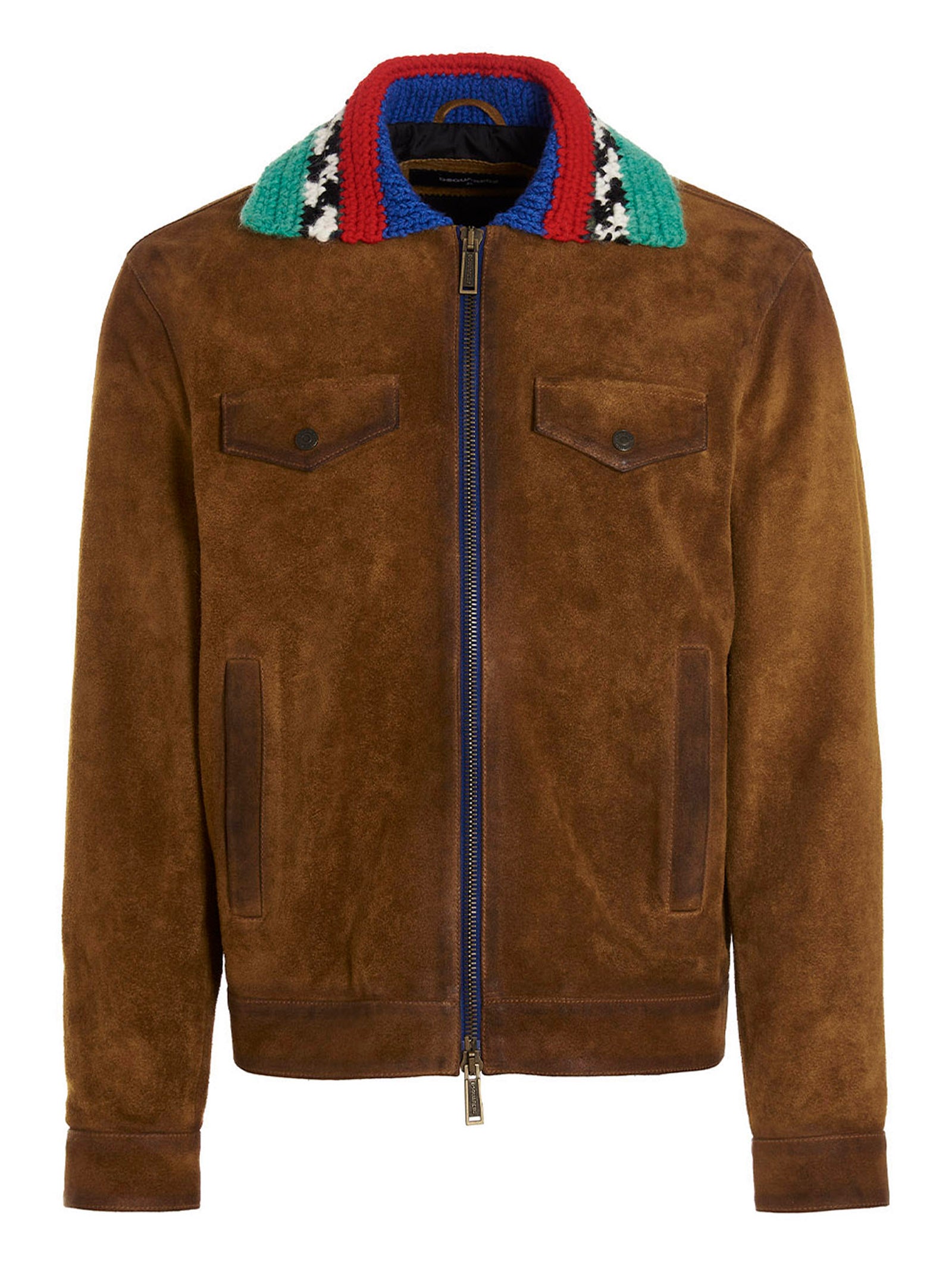 Suede jacket with a multicolor knit collar detail, a zip closure and pockets.
