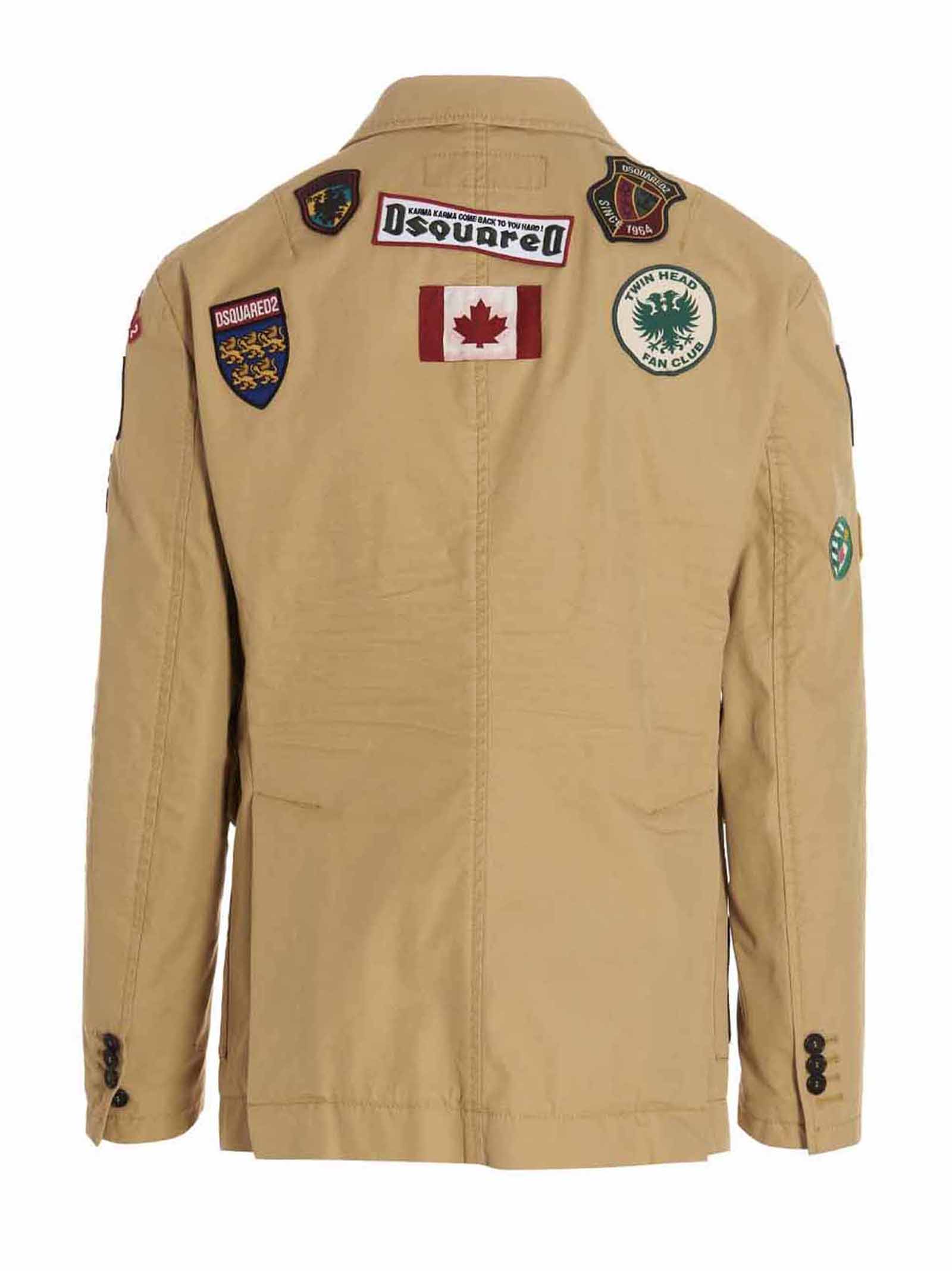 'Military' single-breasted cotton blazer with button closure, all-over patches, pockets, long sleeves, back vents.ts at the back.