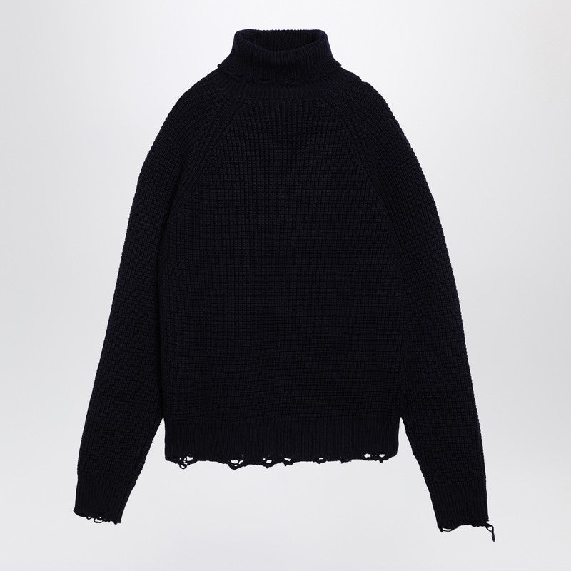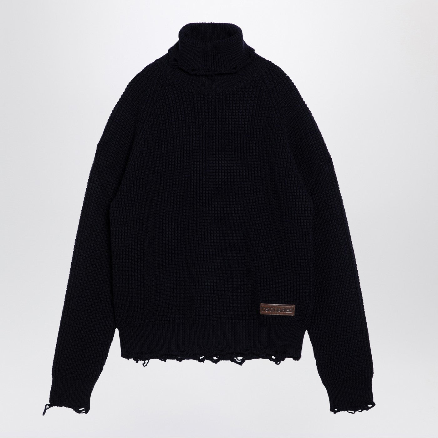 Navy blue wool sweater from Dsquared2 featuring long sleeves, a high collar, a leather logo patch on the front, ribbed edges, worn details and a regular fit.