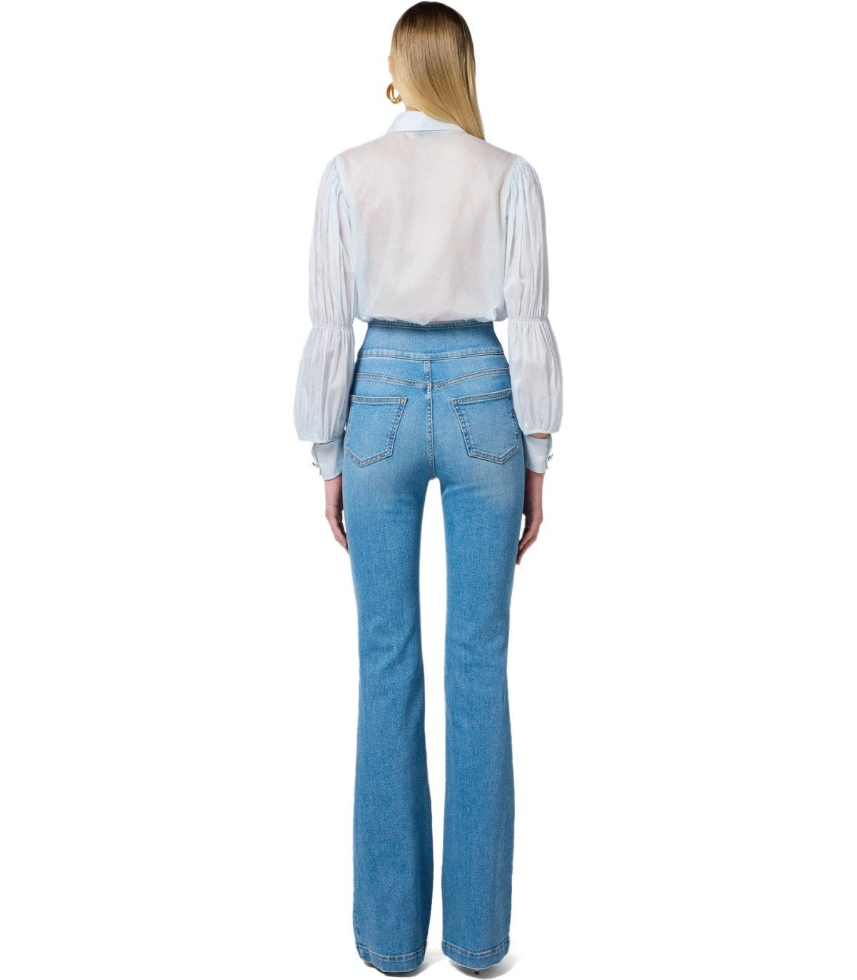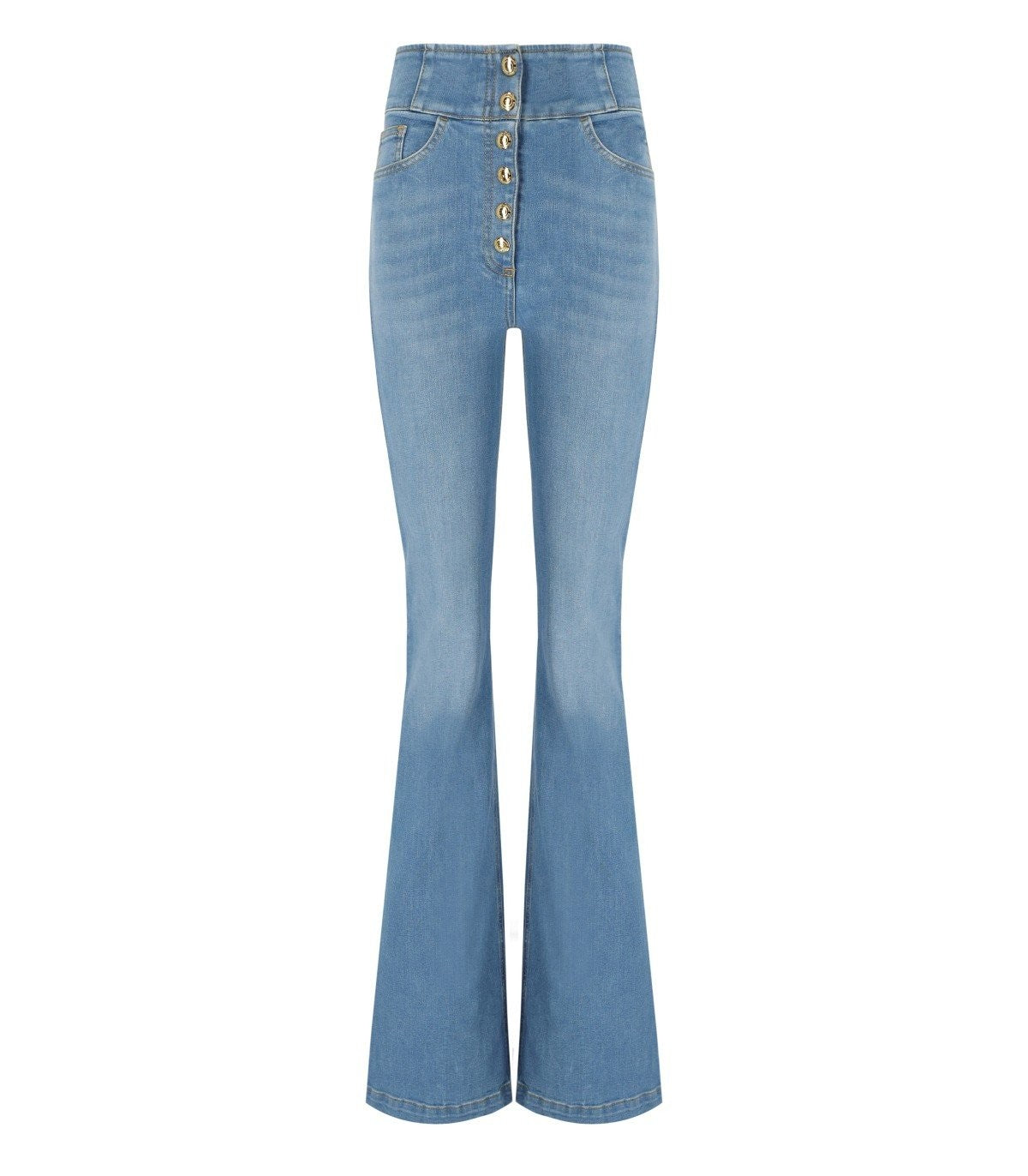 Elisabetta Franchi jeans made of cotton denim in light blue tones. Characterized by a high elasticized waist, it features five pockets on the front and back. With a flared leg at the bottom, it has a waistband that enhances the waist, embellished with a closure of branded golden metal buttons. Fitted fit. Composition: 79% cotton, 15% lyocell, 4% elastomultiester, 2% elastane.