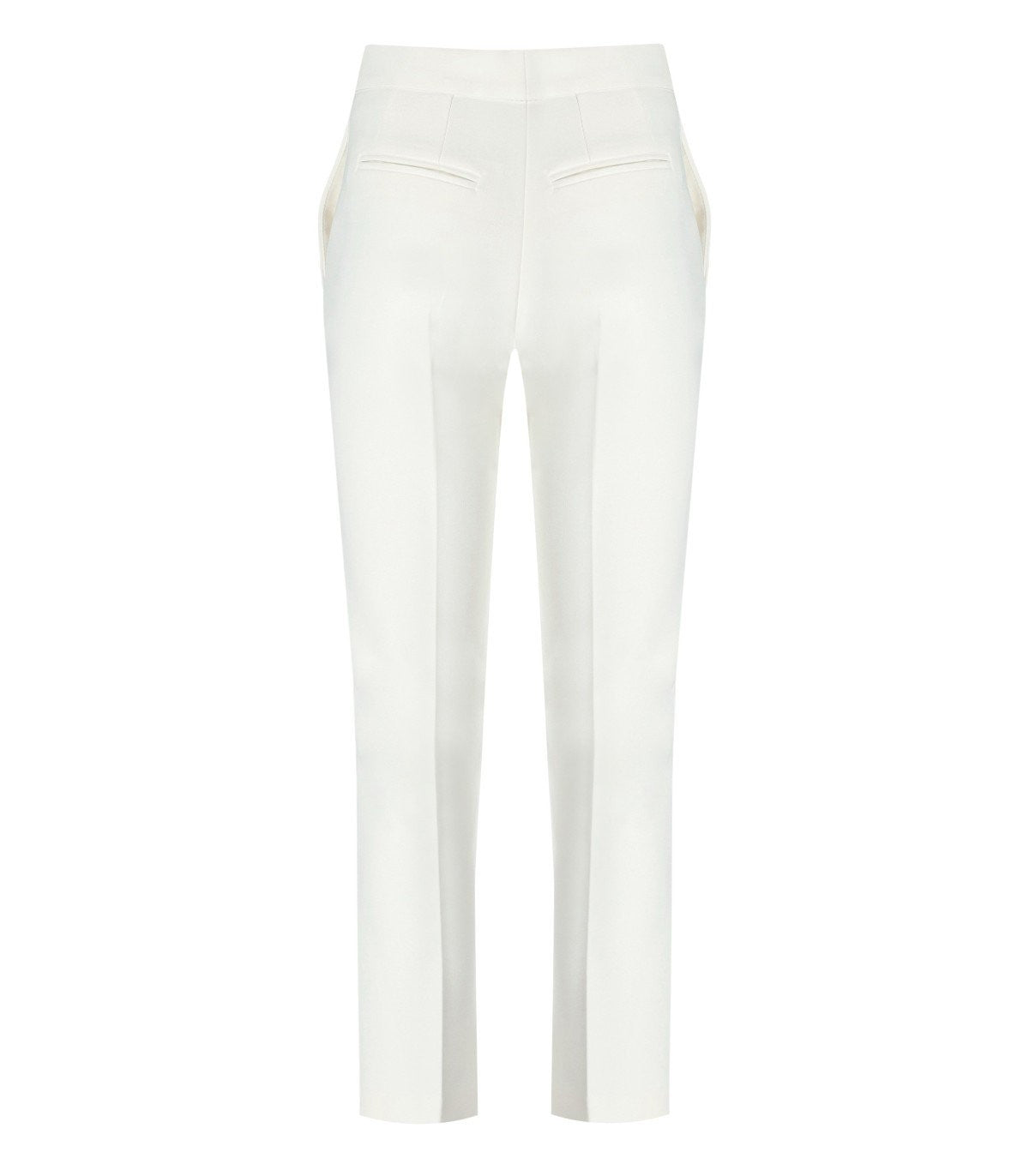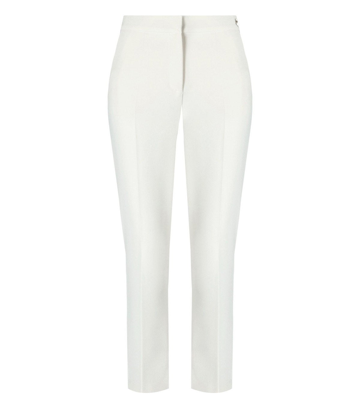 Elisabetta Franchi pants made of lightweight ivory crêpe. Characterized by a waistline adorned with a band featuring a gold logo plate. It has a crease at the front and slits at the bottom. Closure with a zip and hook. Regular fit. Composition: 95% Polyester 5% Elastane.