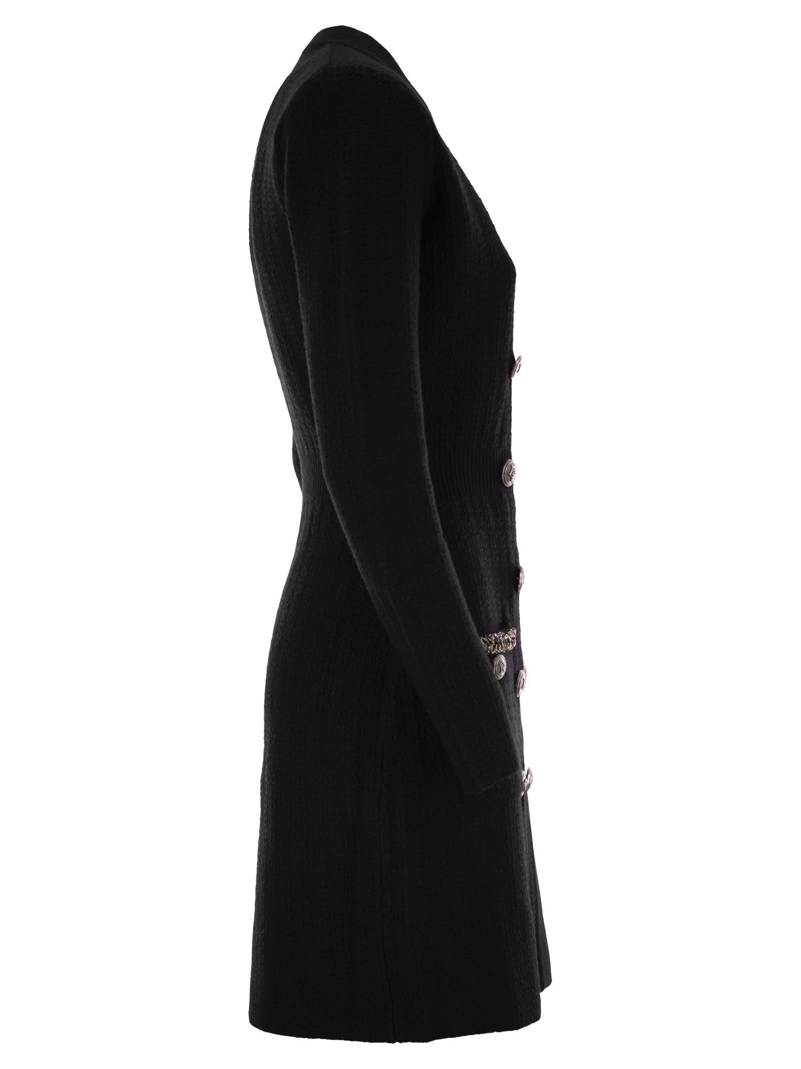 Double-breasted robe-manteau in bouclé wool blend with long sleeves. The waist is emphasised by a ribbed band over patch pockets finished with beaded embroidery, piping and silver metal logo buttons. - Padded shoulder straps - Silver metal buttons - Tight fit DESIGNER ID: AM27S47E2 110