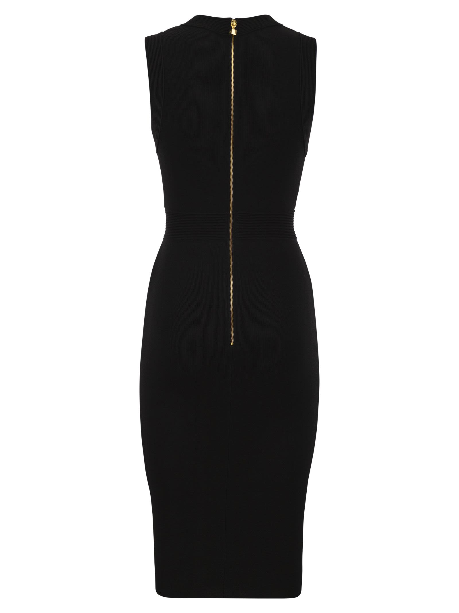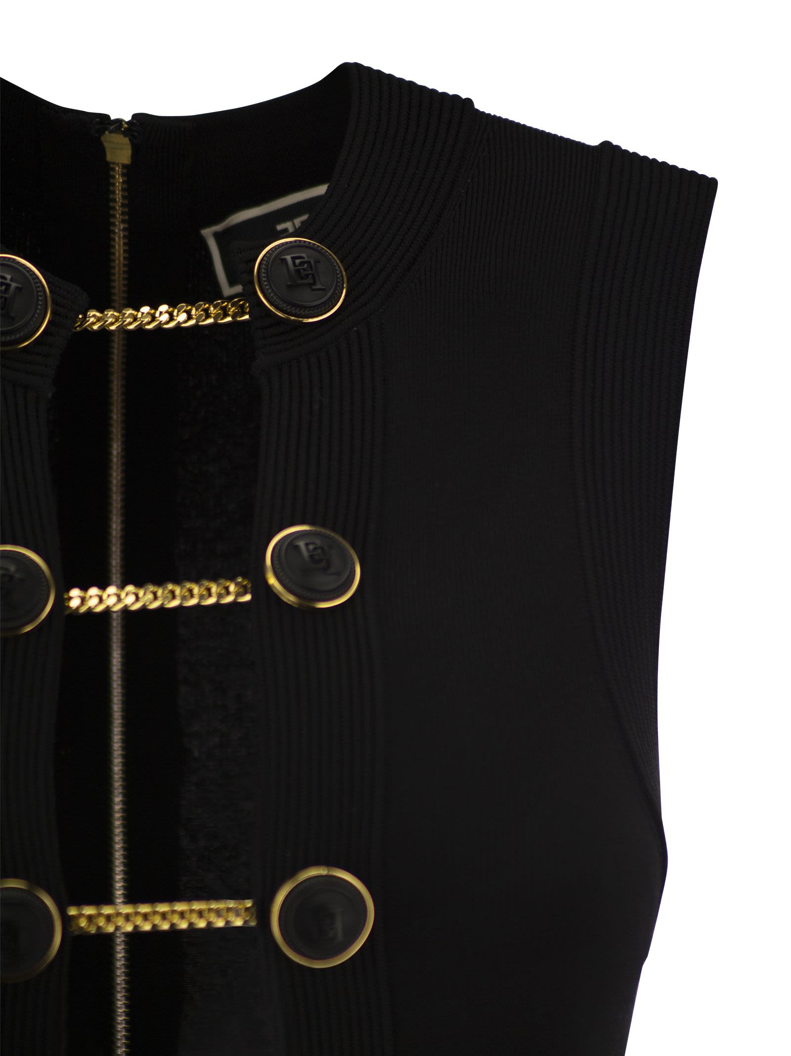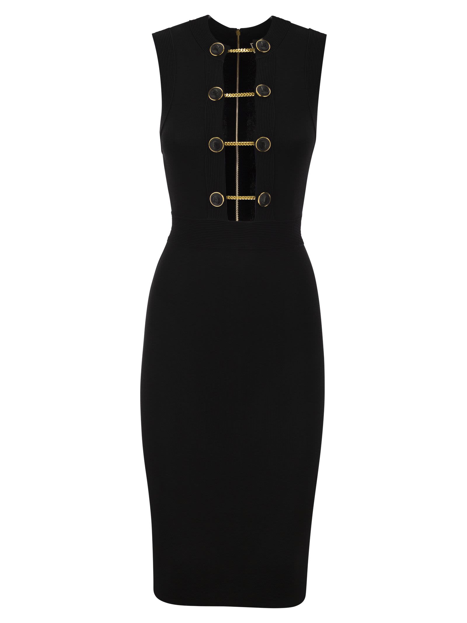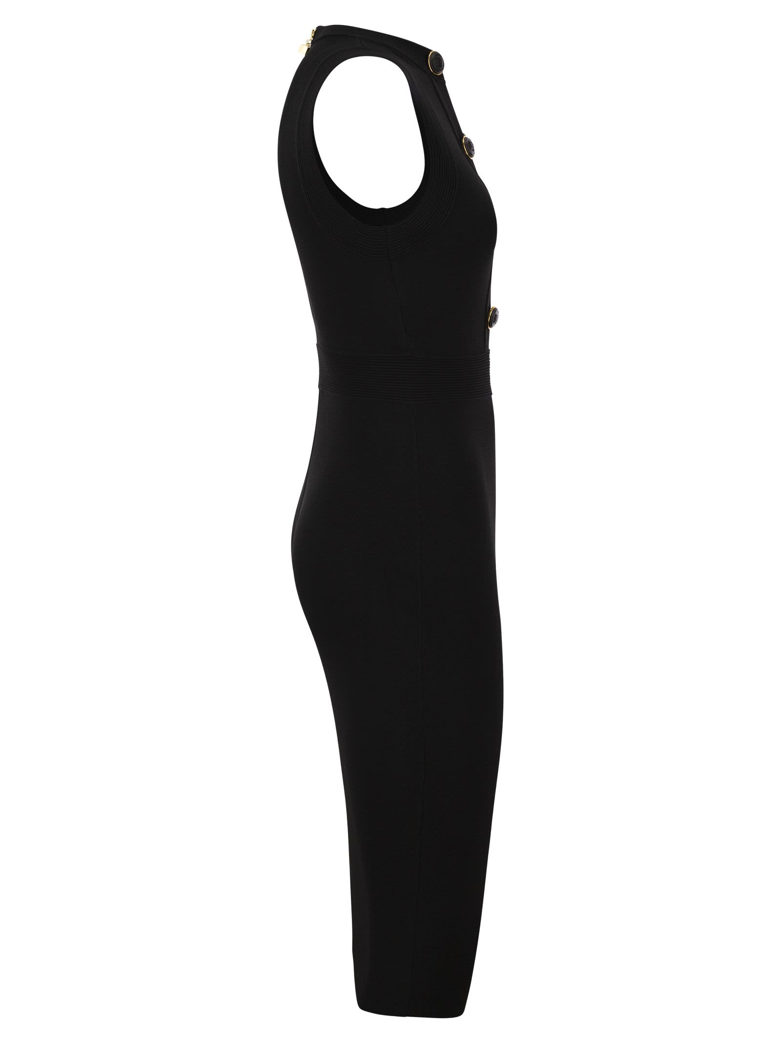 Shiny viscose sheath dress with plunging neckline closed by matching twin buttons. - Back zip - Matching buttons - Gold metal accessory - Tight fit DESIGNER ID: AM50S41E2 110