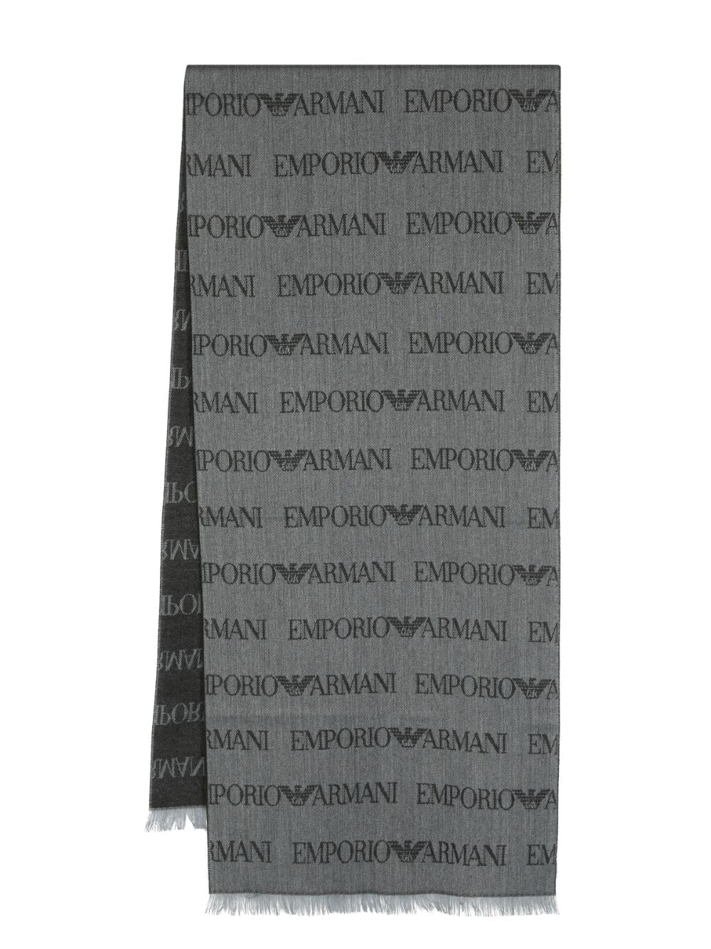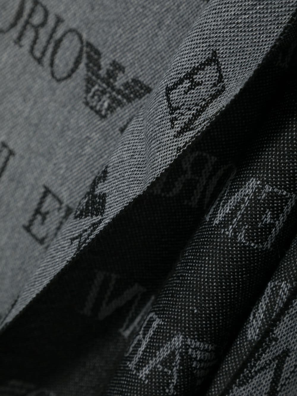 Black/ash grey virgin wool blend reversible monogram pattern frayed edge.