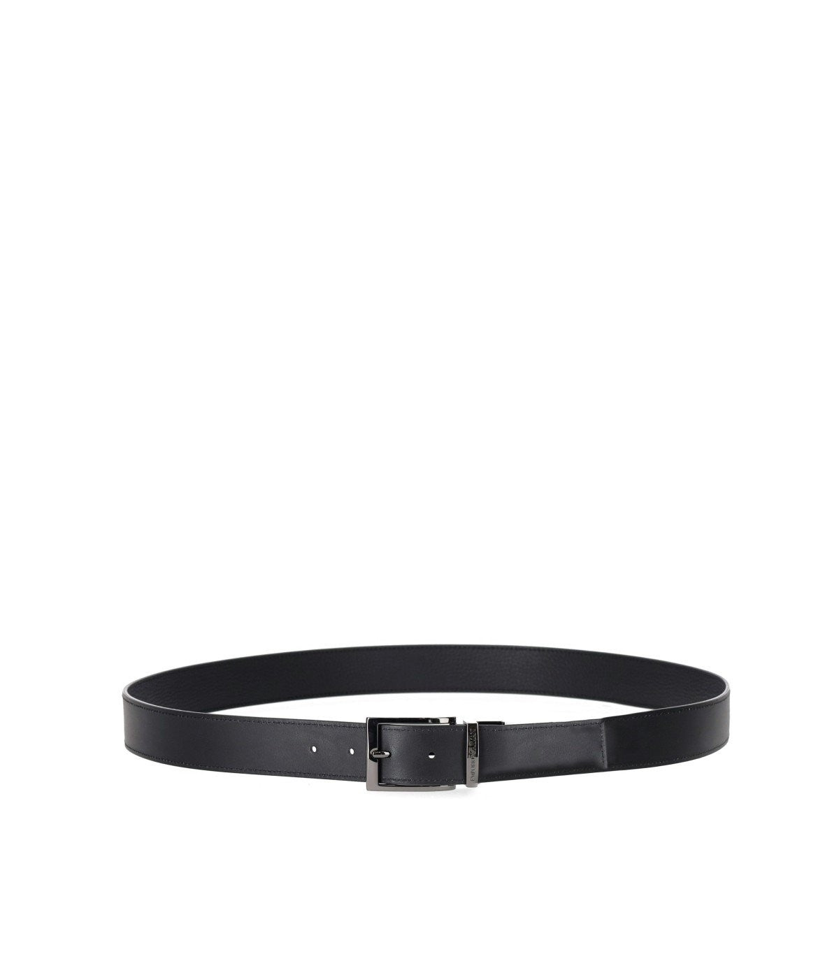 Emporio Armani belt made of leather in black. Characterized by a silver metal logo buckle and prong, it is a reversible model that can be worn on the smooth side and the hammered leather side. Measurements 125x3.5 cm. Front material composition: 100% bovine leather - crust finished with transfer sheets; outer coating: 100% polyurethane; back belt material: 100% bovine leather - crust finished with transfer sheets.