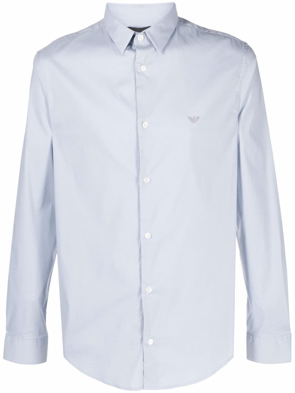 Light blue cotton blend classic collar embroidered logo at the chest front button fastening long sleeves curved hem.
