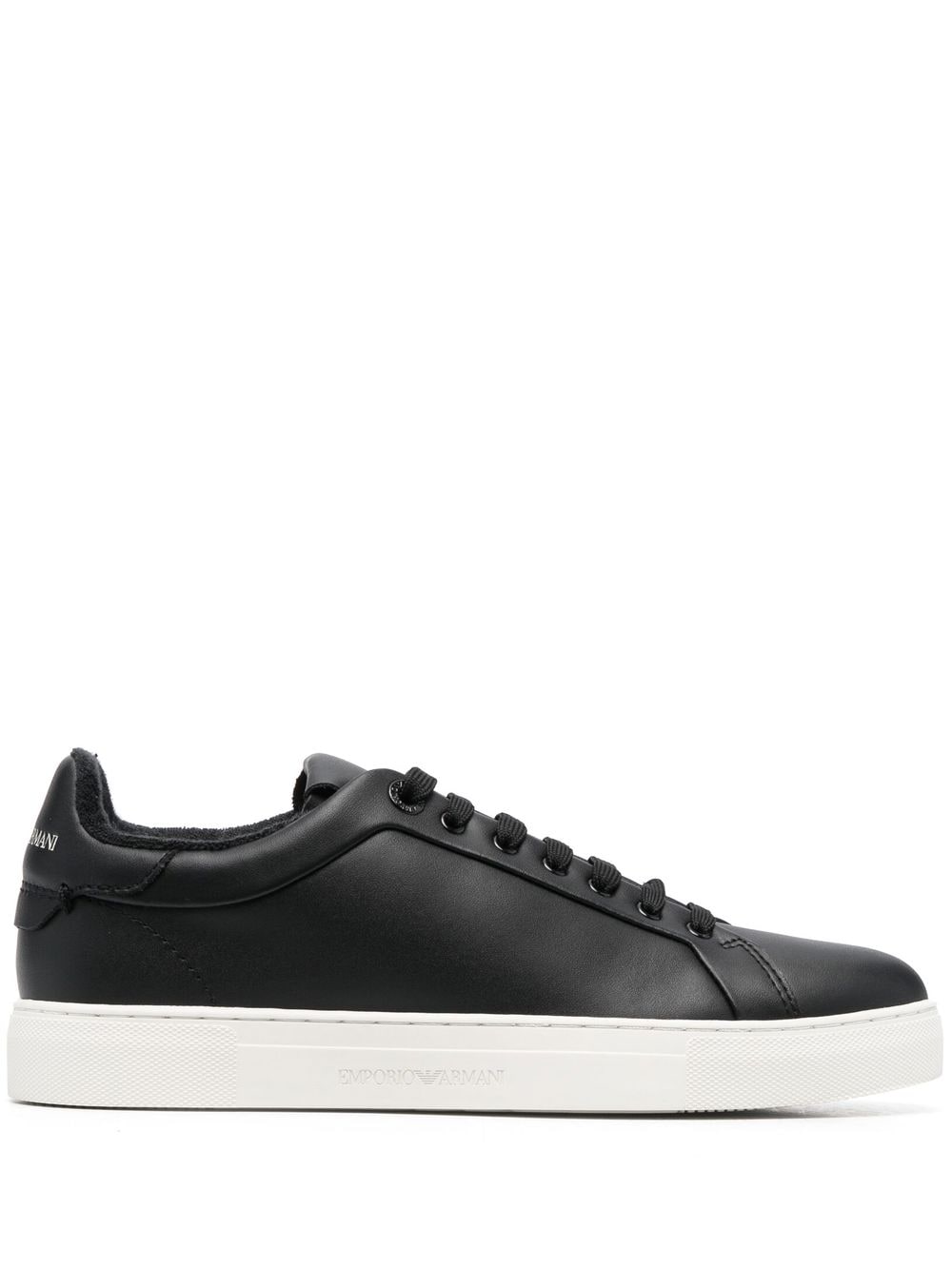 logo-print lace-up sneakers from EMPORIO ARMANI featuring black/white, logo print to the rear, front lace-up fastening, round toe, flat rubber sole and calf leather-blend.