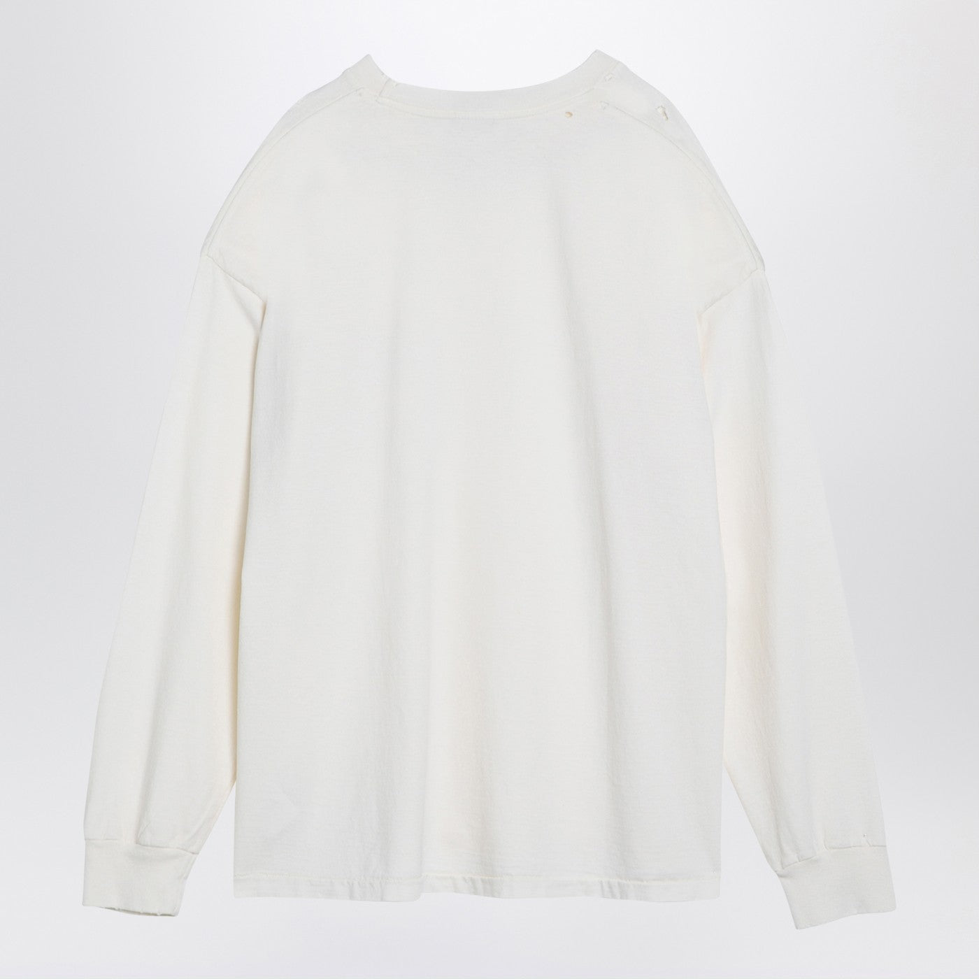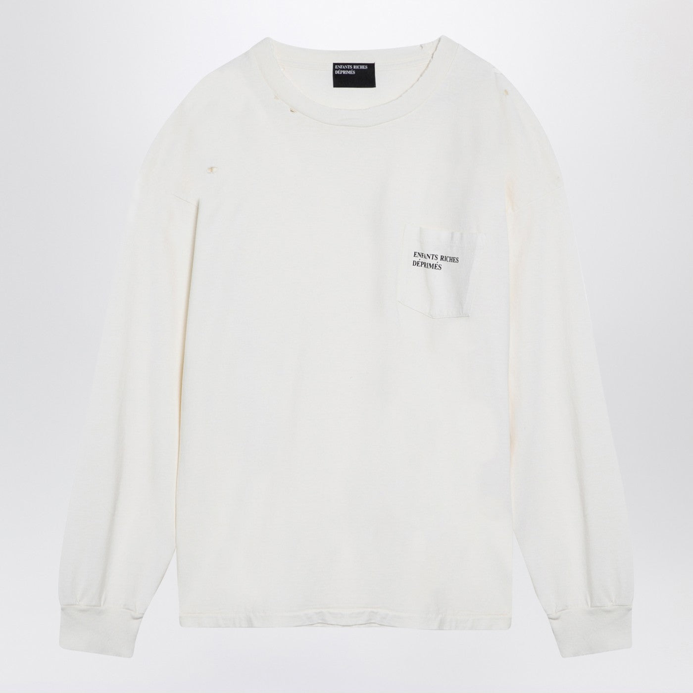 White cotton crewneck sweater from Enfants Riches Déprimés featuring a patch pocket on the chest with contrasting lettering logo, long sleeves, localised wear and a straight hem.