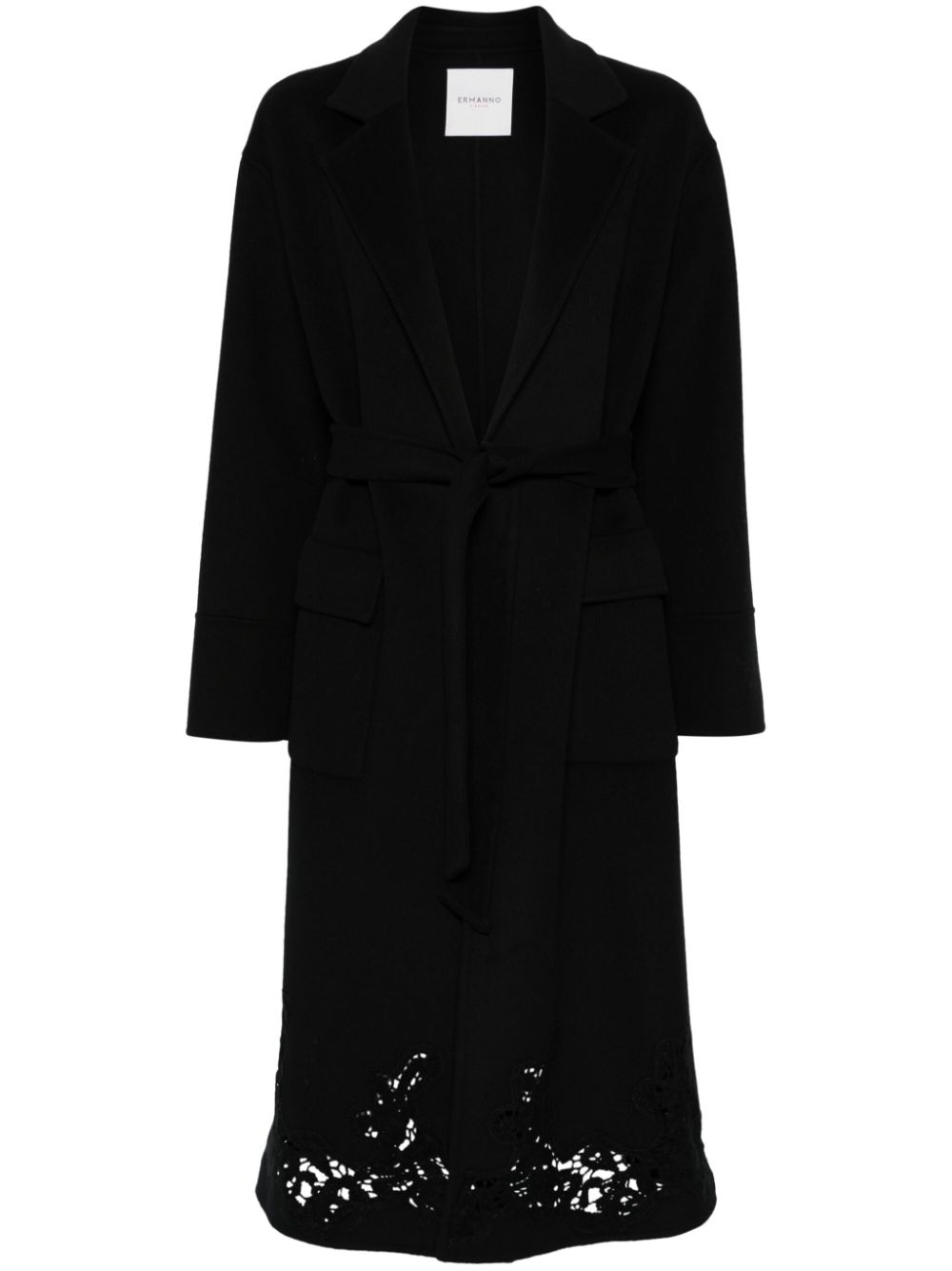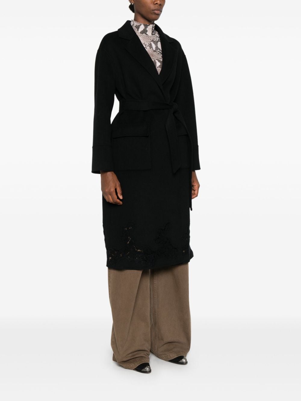 black wool blend textured finish knit lace detailing belted waist notched collar long sleeves two side flap pockets straight hem mid-length