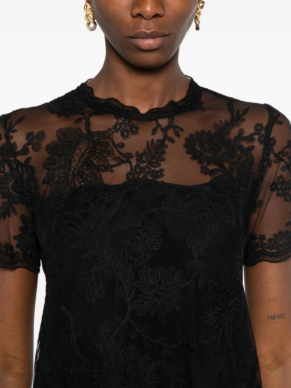 black floral lace design semi-sheer construction concealed rear zip fastening round neck short sleeves partial lining straight hem