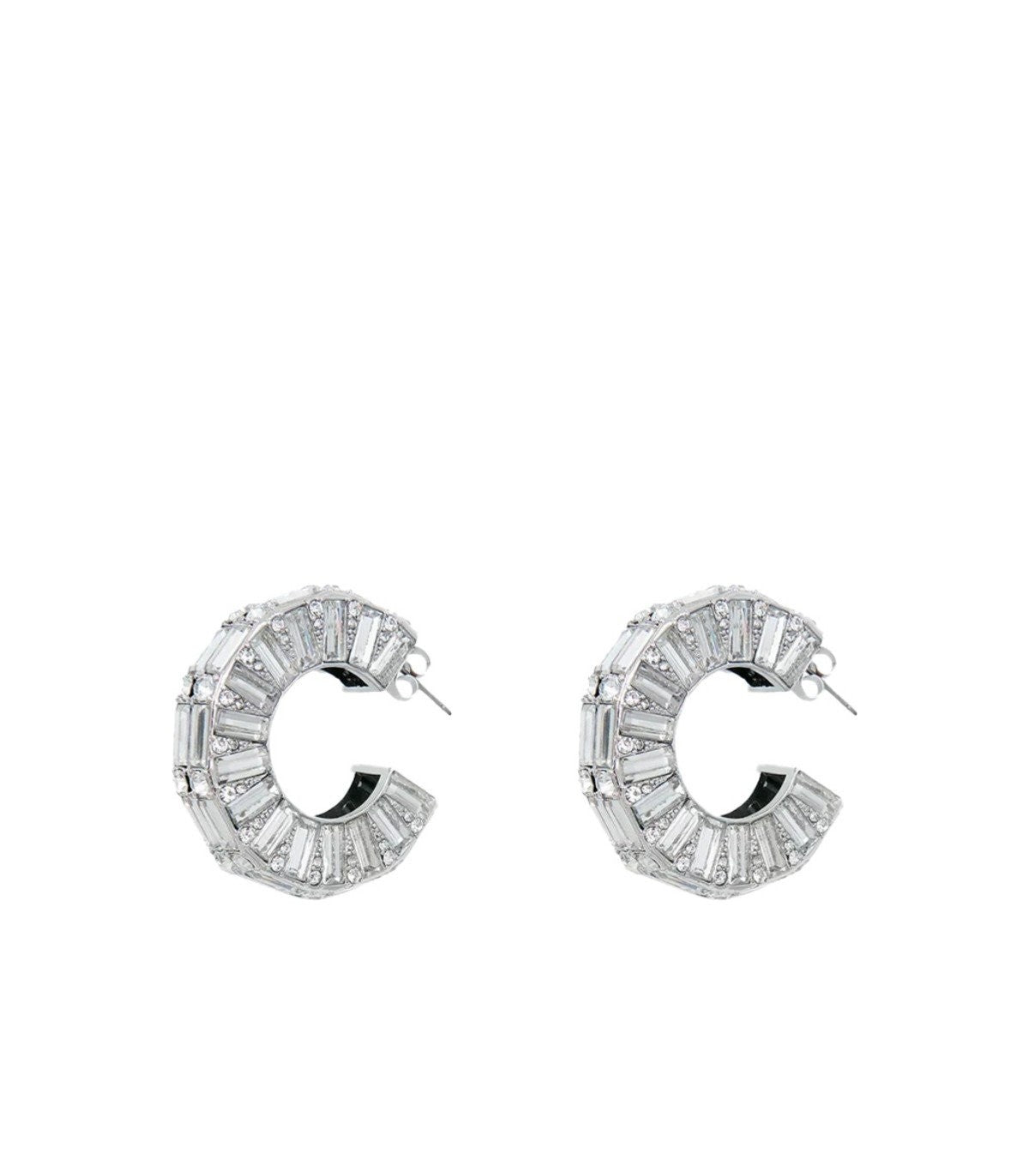 Essentiel Antwerp earrings made of mixed brass metal and glass, embellished with white crystals. Characterized by a hoop shape, they feature a needle and butterfly clasp. Size: 3 cm. Outer shell composition: 50% brass, 40% glass, 10% stainless steel.