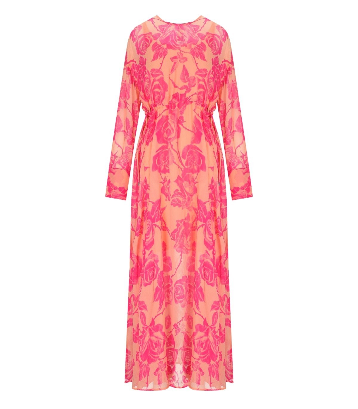 Long dress Hardware by Essentiel Antwerp made of viscose in shades of peach pink and fuchsia. Adorned with a printed rose pattern, it features a rounded neckline, voluminous long sleeves with buttoned cuffs, and a hidden zip closure at the back. Equipped with adjustable drawstrings at the waist and a peach viscose underdress. Finished with a side slit and a pleated hem at the bottom. Oversized fit. Composition: 100% viscose. Lining: 100% viscose. Metallic accessories: 100% glass.