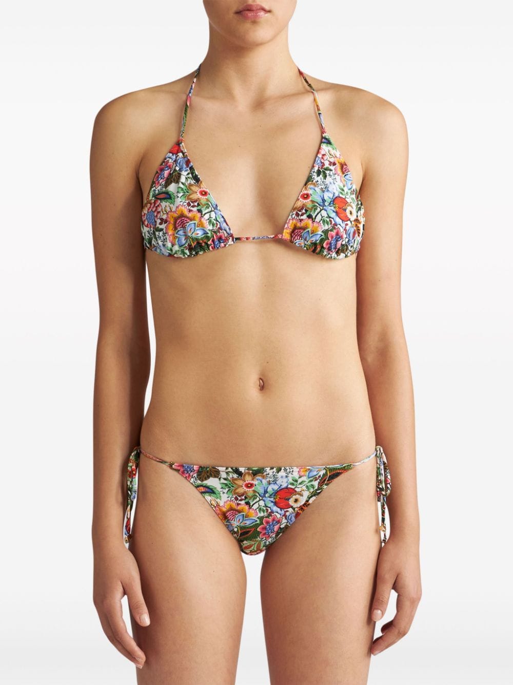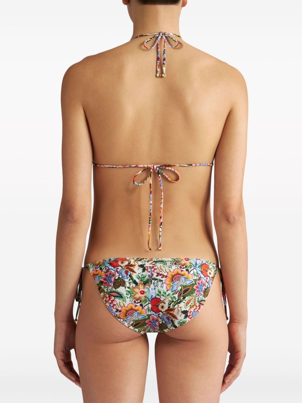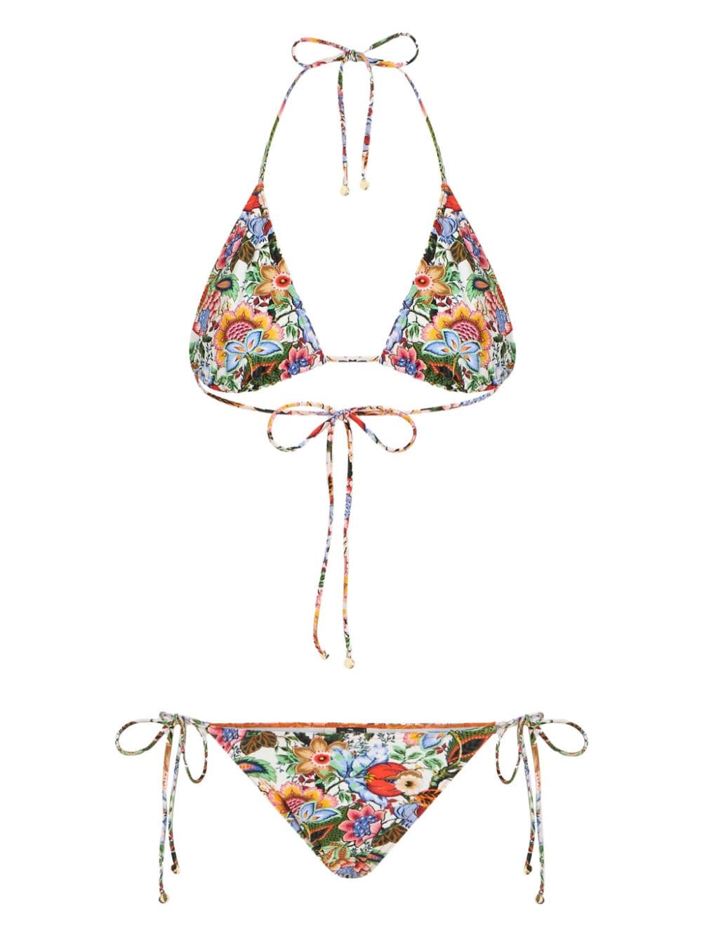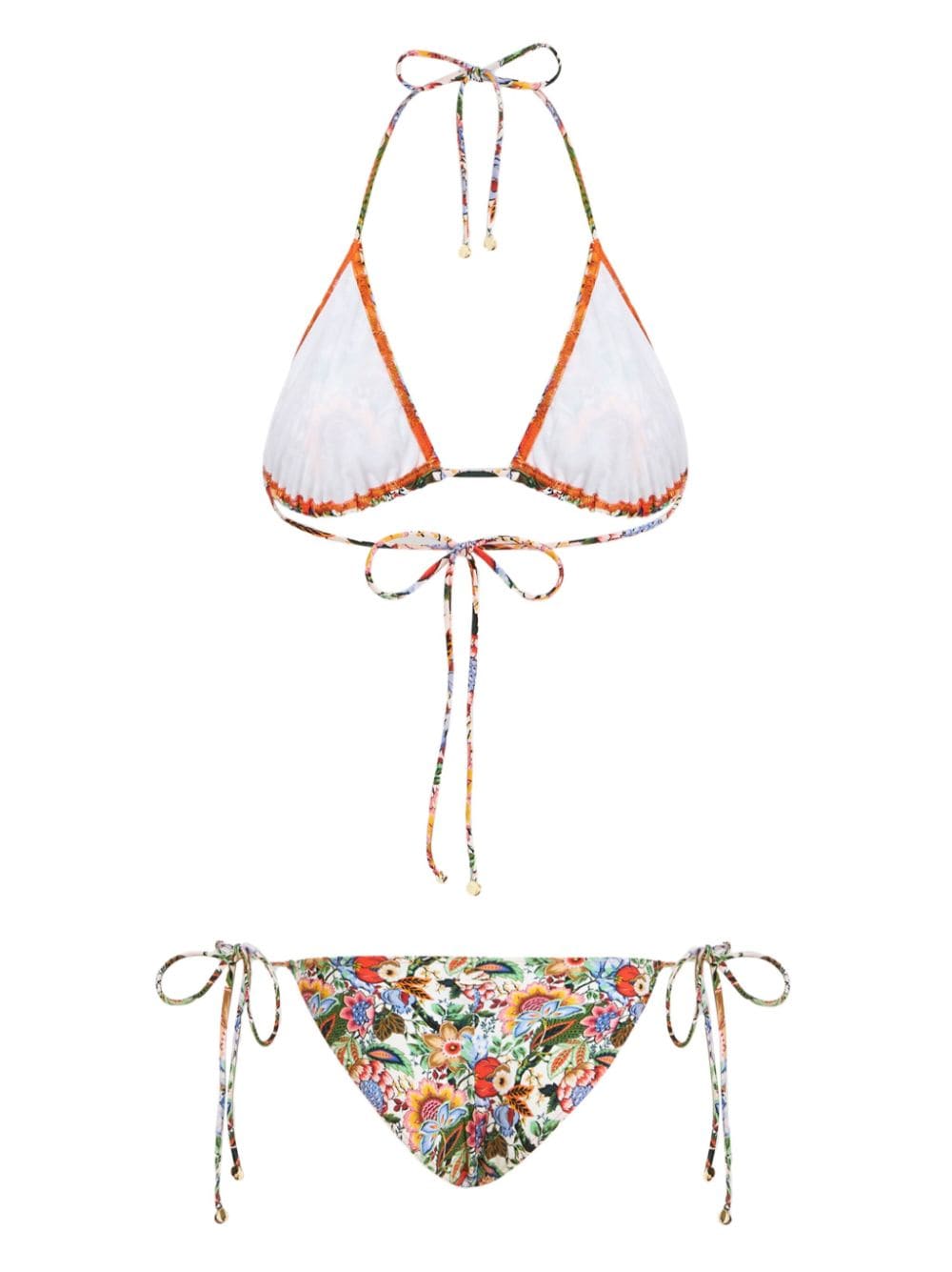 blue/multicolour all-over floral print Top: triangle cup halterneck tie fastening rear tie fastening Bottoms: low-rise side tie fastening Be mindful to try on swimwear over your own garments.