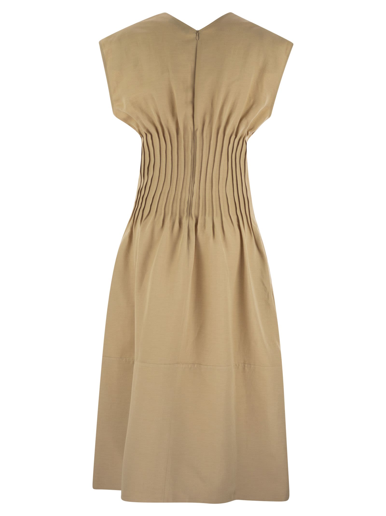 The narrow waist dress with cape sleeves is made of viscose and linen jersey. It features a V-neckline and a pleated waist. Made entirely in Italy by sustainable processes. - V-neckline - Cap sleeves - Pleats at waist DESIGNER ID: ABD275F639D544 1261