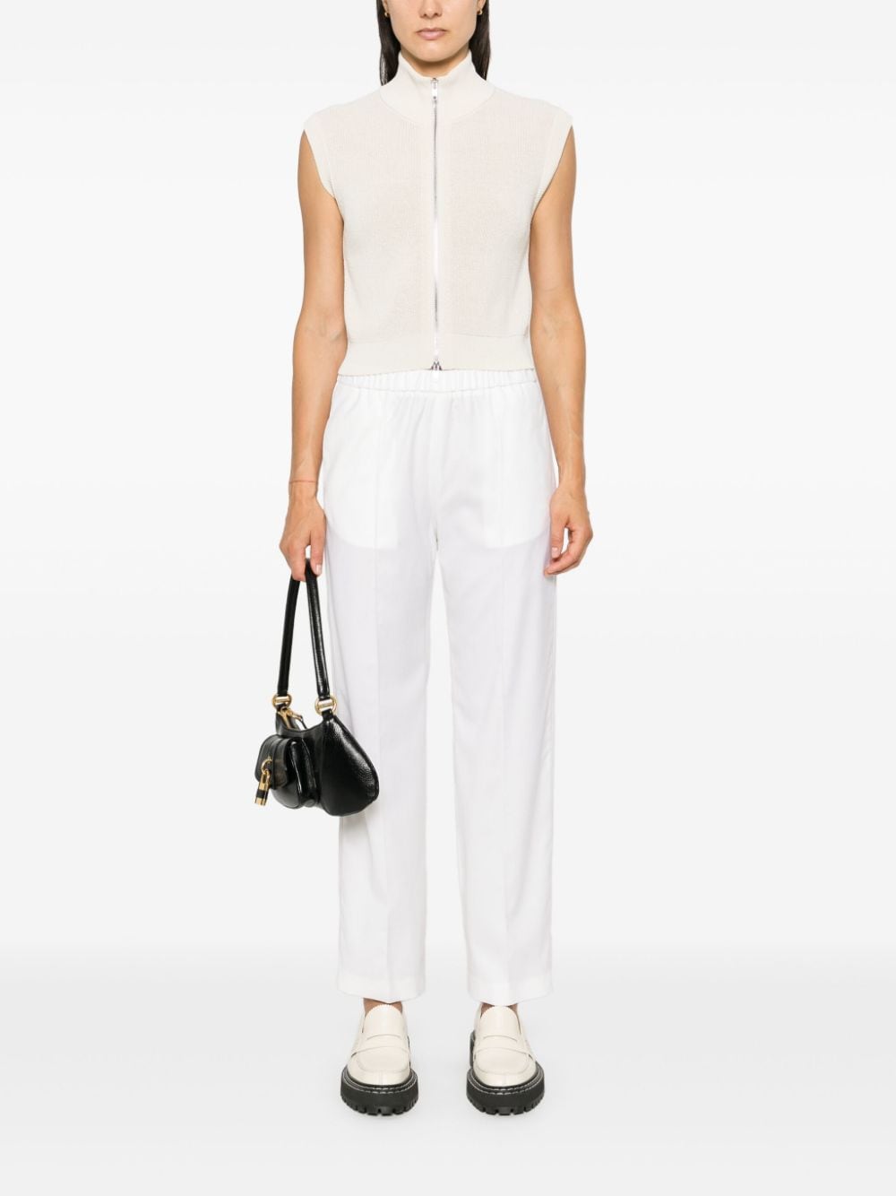 ecru virgin wool blend interlock twill weave mid-rise elasticated waistband bead embellishment two side slit pockets raised seam detail straight leg