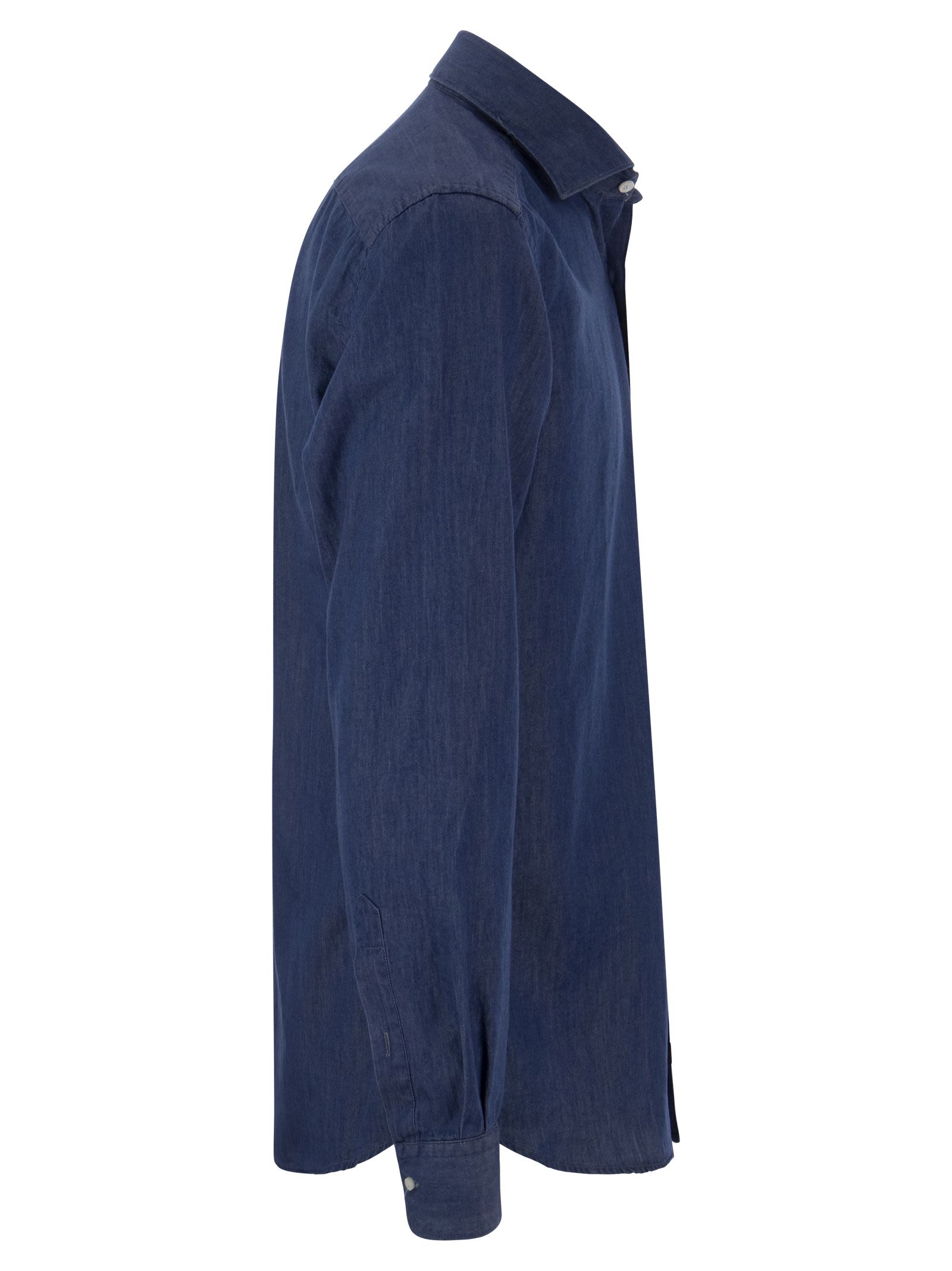 French neck shirt in washed denim. Featuring a small button placket and back darts, it is enriched by the Fay logo label applied to the bottom. - French collar - Regular fit DESIGNER ID: NCMA146115LMJPU210
