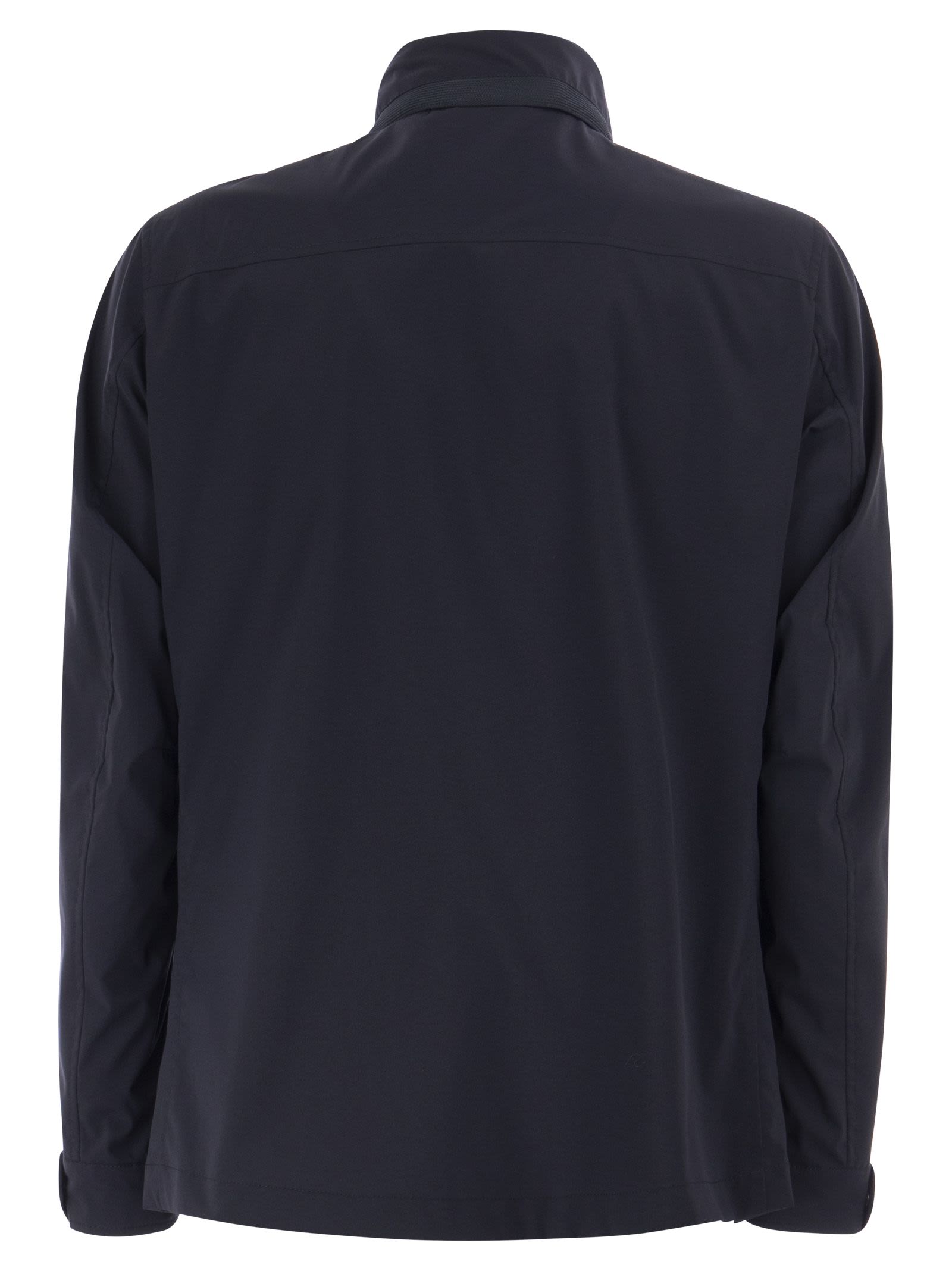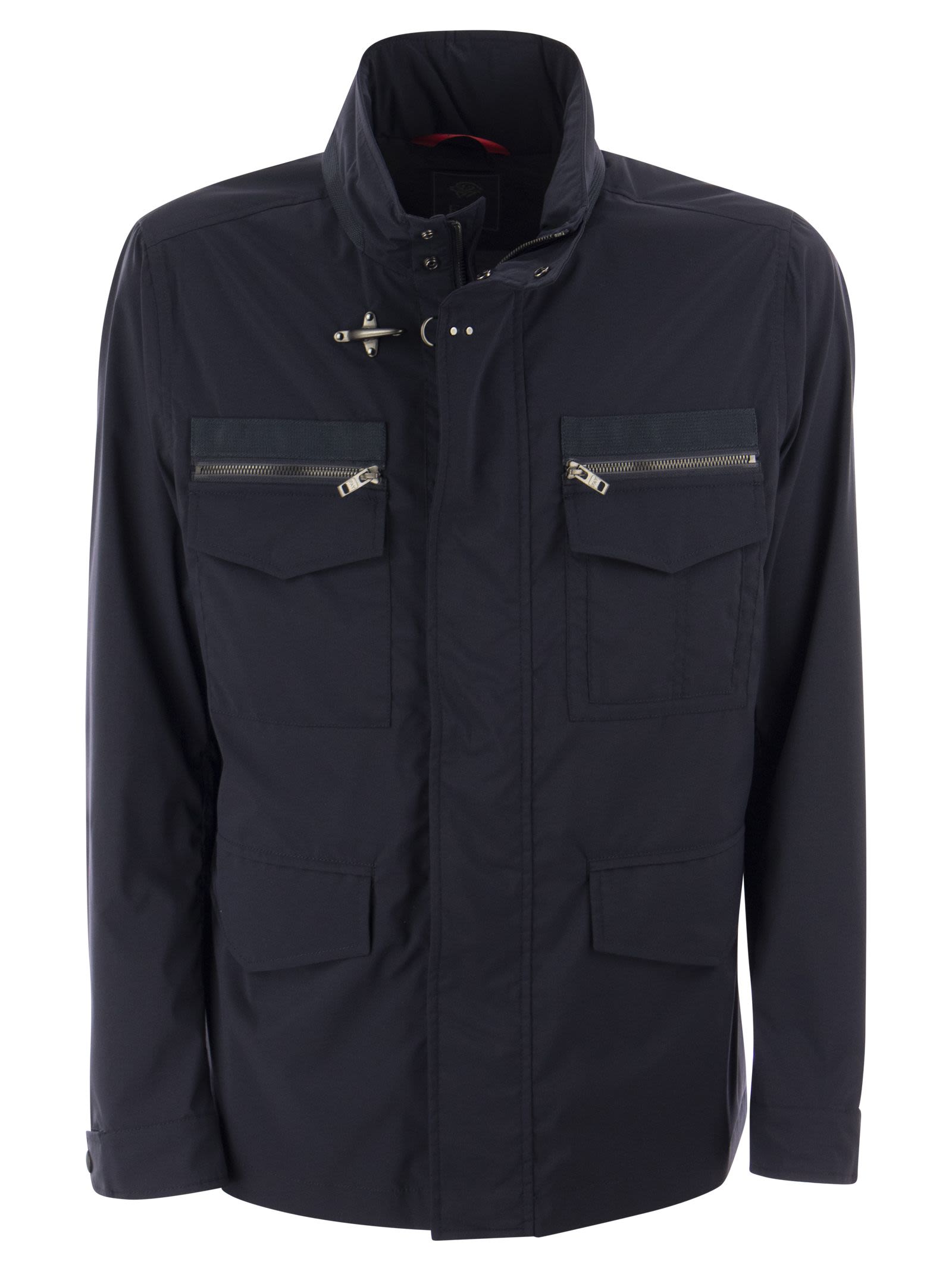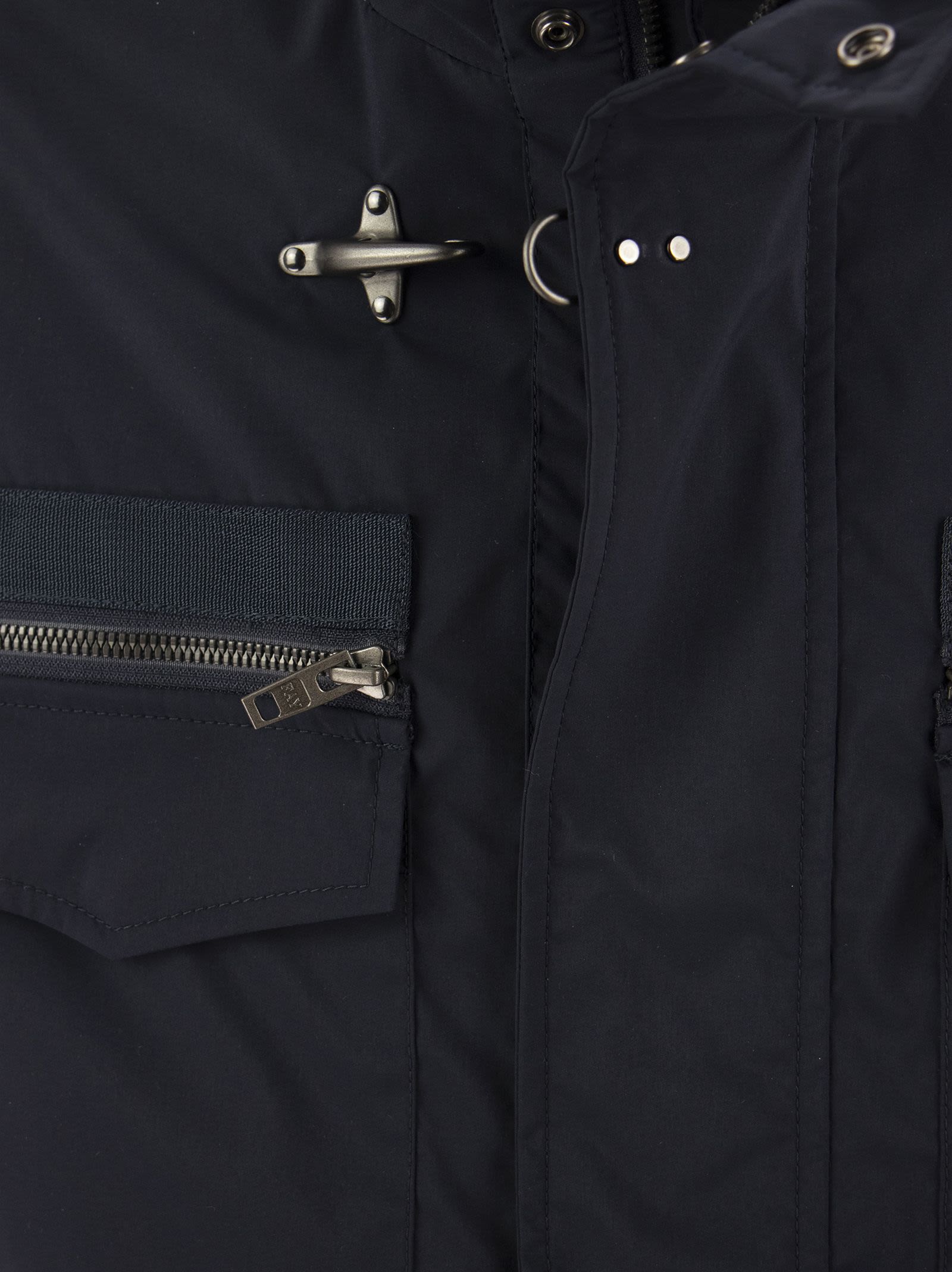 The allure of the field jacket is inseparable. Made of a comfortable, water-repellent technical fabric, this unlined version features a high collar with a removable hood. The pocket system is functional and assorted: two upper double patch pockets with zip and flap, two lower welt pockets with flap. The concealed zip and snap fastening is perfected by the iconic hook at the collar. - Fitting: regular DESIGNER ID: NAM1946027STIBU807