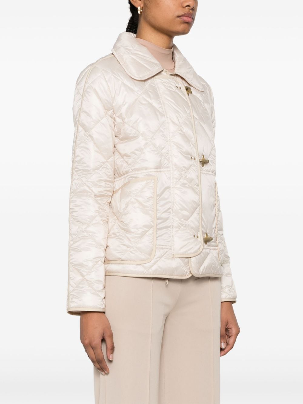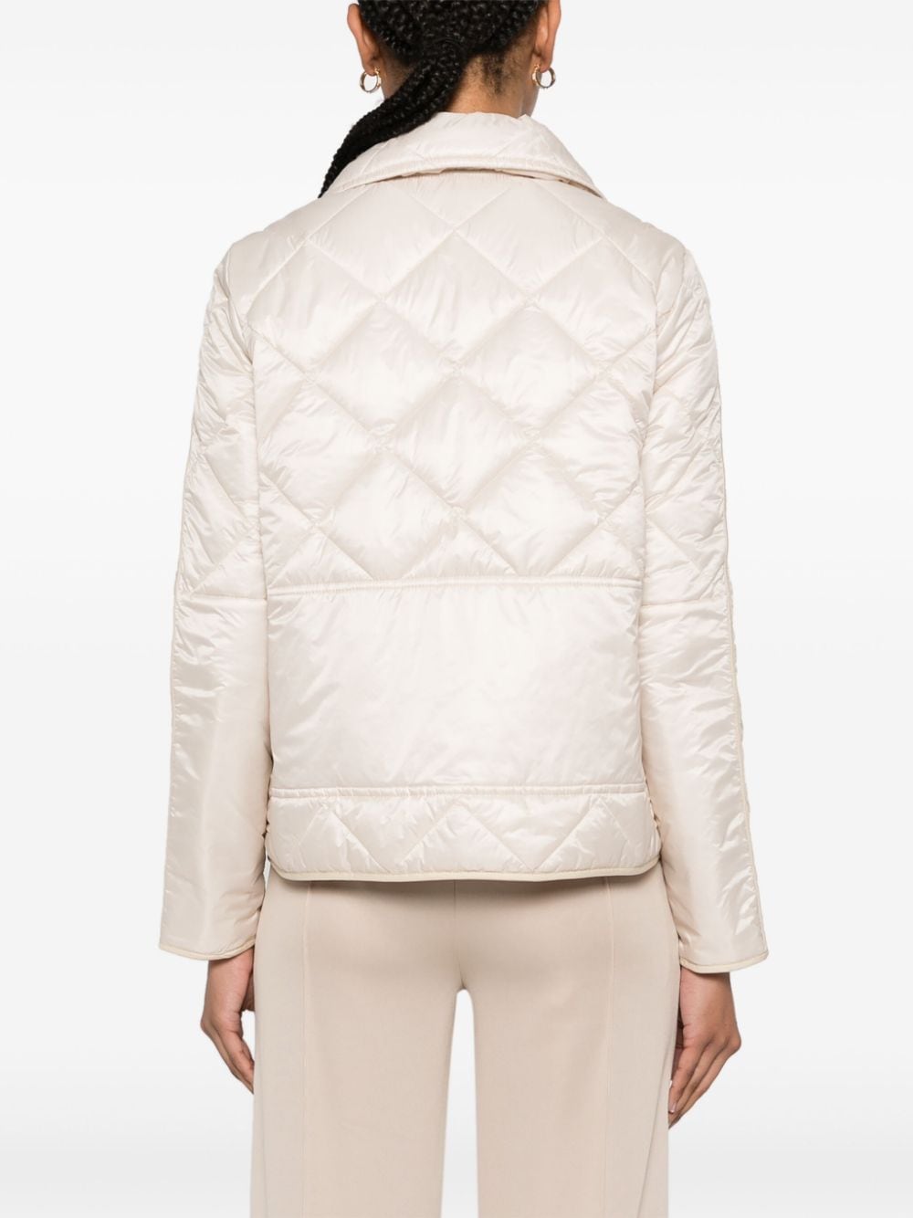 light beige padded design quilted rounded collar long sleeves two front patch pockets straight hem full lining hook fastening and front press-stud fastening with logo studs