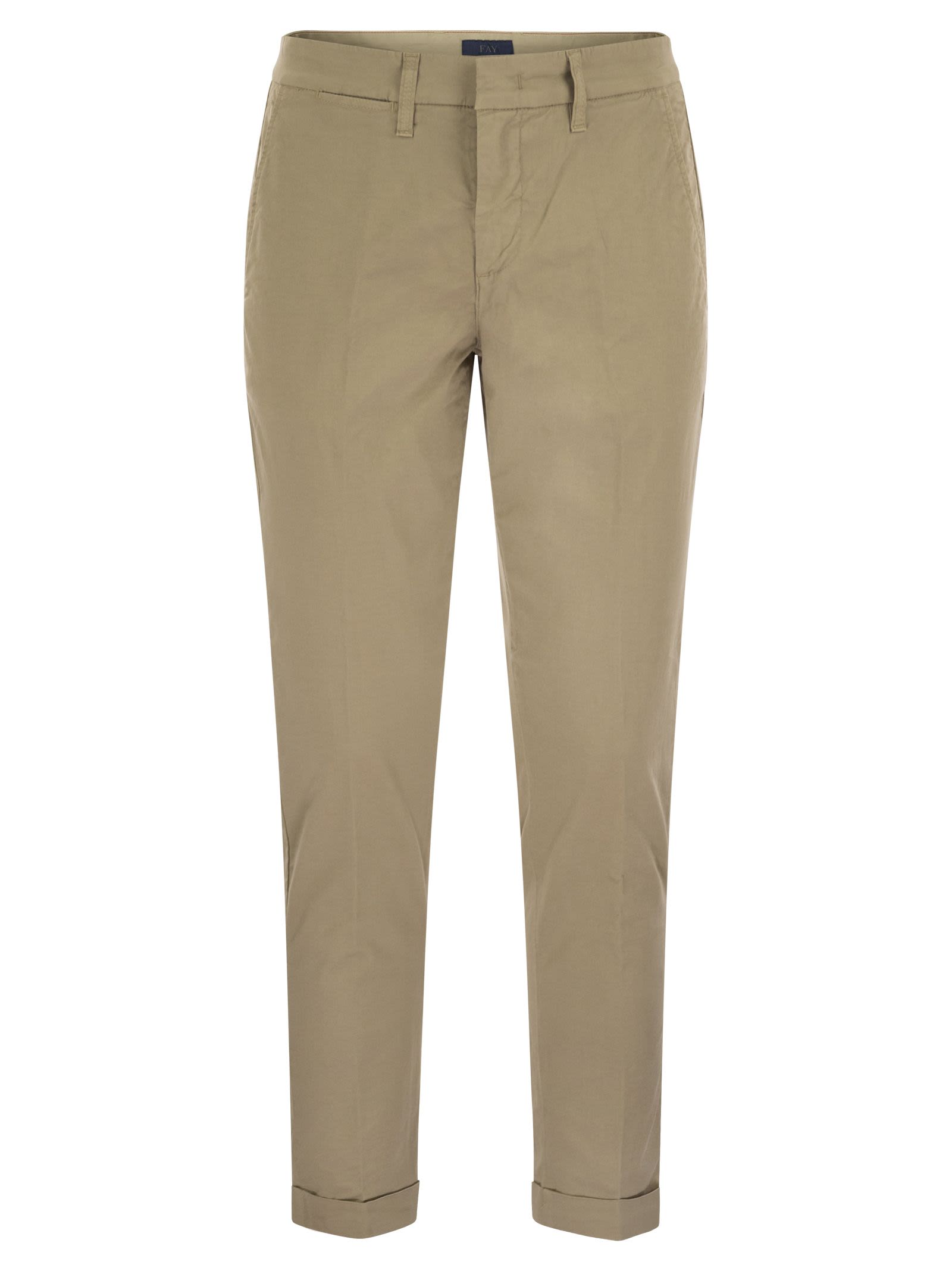 Slim fit capri trousers in garment dyed stretch cotton gabardine, with personalised Fay label on the back and turn-up hem. Featuring slanted front pockets, a coin pocket and welt back pockets with button, they have a zip and button fastening. - Slim fit - Front pleat - Label on back DESIGNER ID: NTM8650187TGURC210