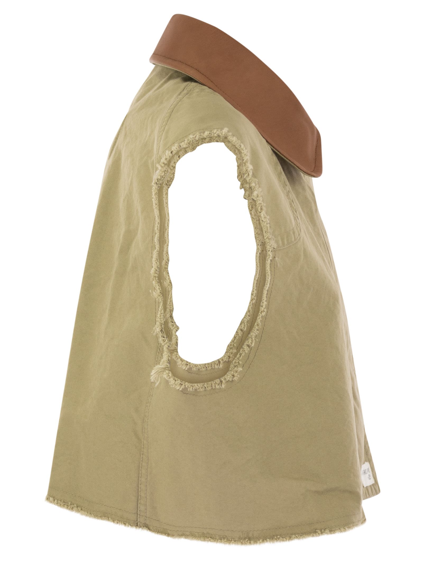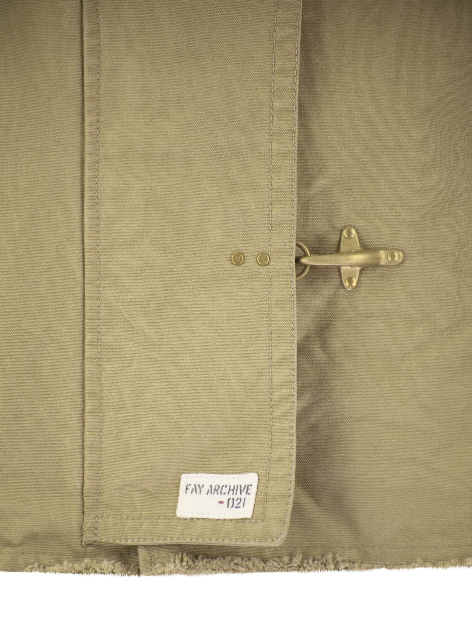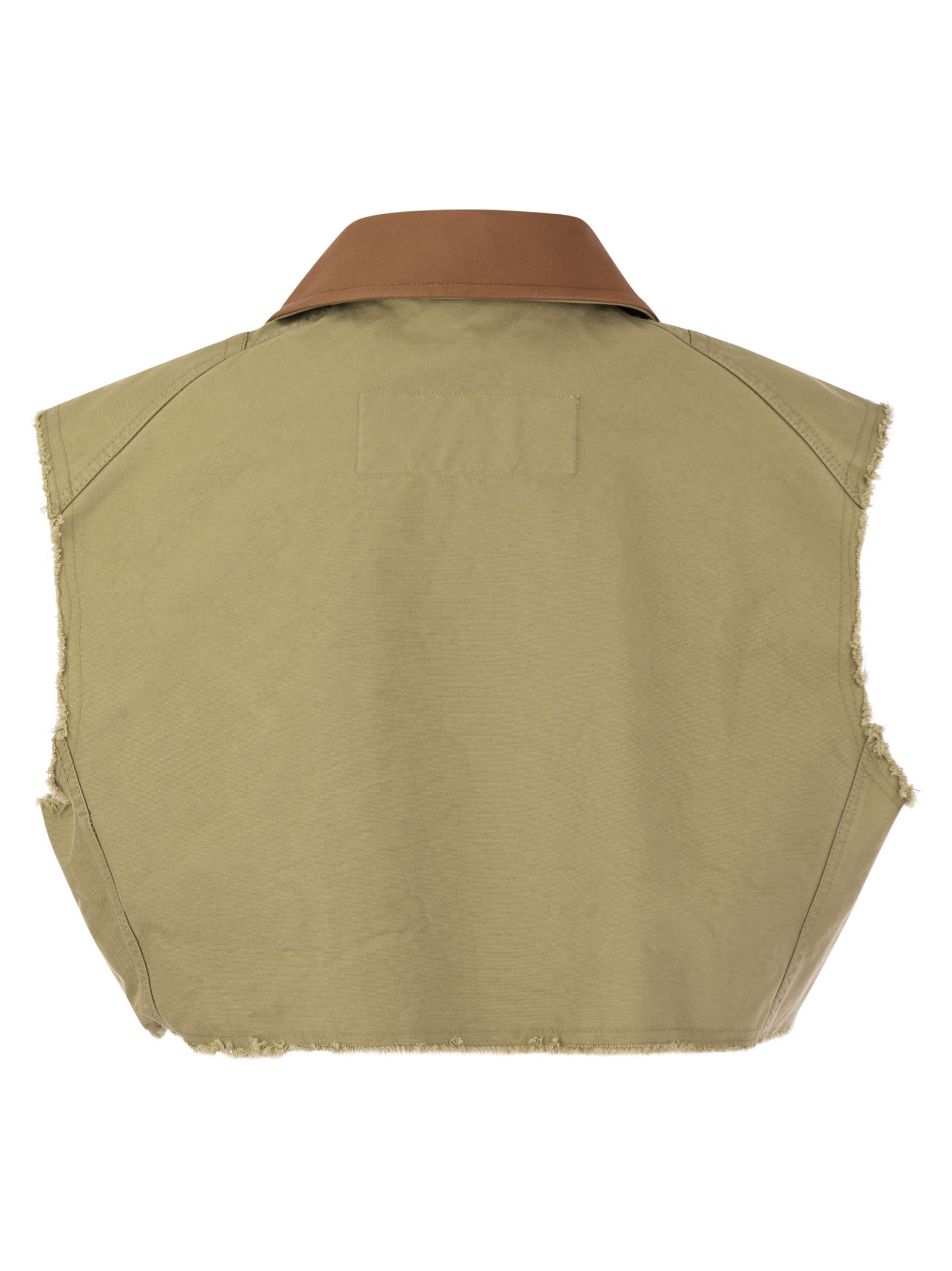Unlined cropped over-fit waistcoat, made of stone washed canvas. Fastened with two iconic hooks and customised snaps, it features the characteristic velvet collar. A model that combines femininity and an adventurous appeal, emphasised by the frayed profiles. - 2 Hooks - Fay Archive - Fitting: over DESIGNER ID: MAW1048401LUC3C602