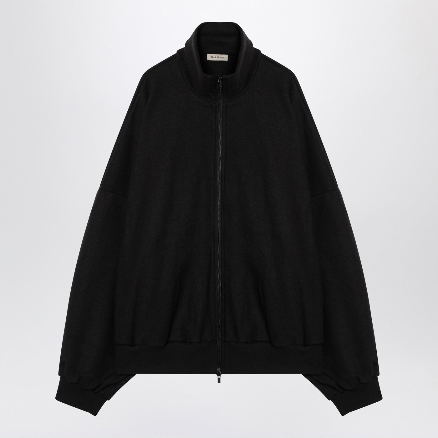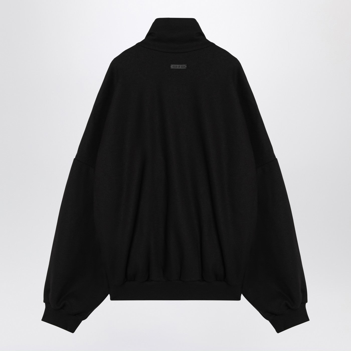 Black cotton and wool sweatshirt from Fear of God featuring a high collar, a double-zip front fastening, two side welt pockets, a logo patch on the back, long sleeves, ribbed hems and an over fit.
