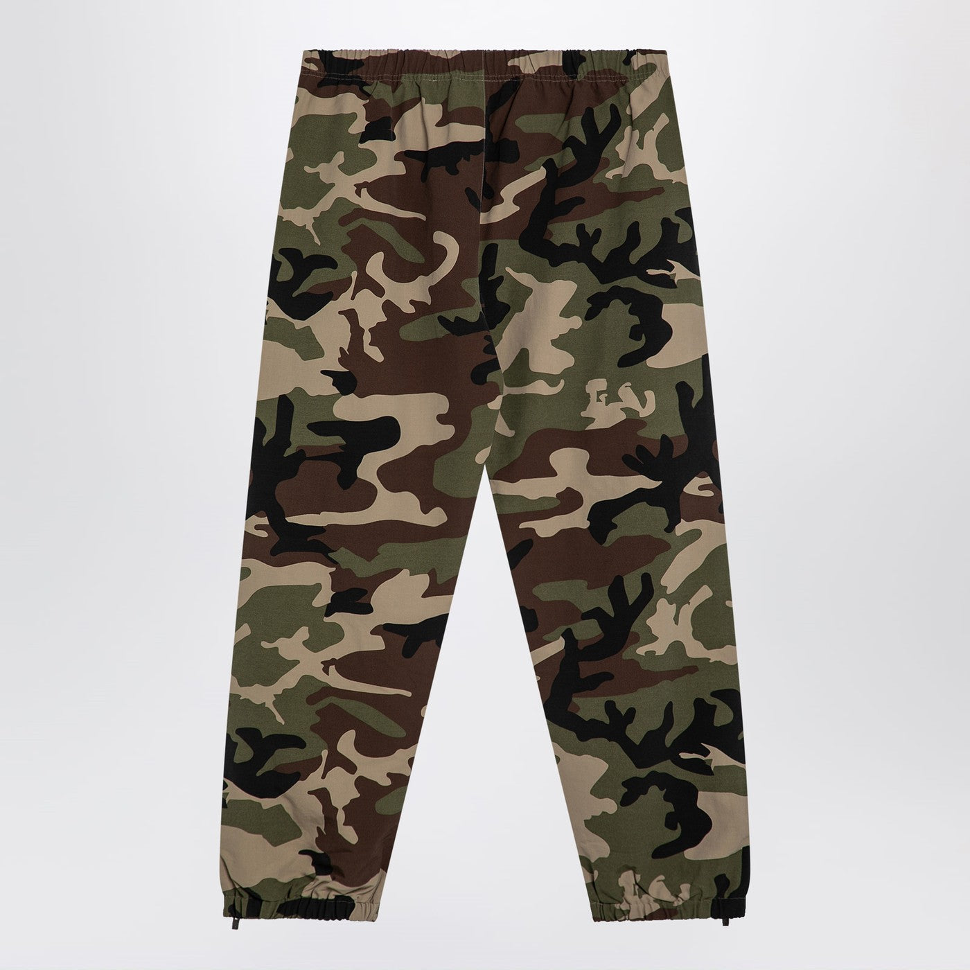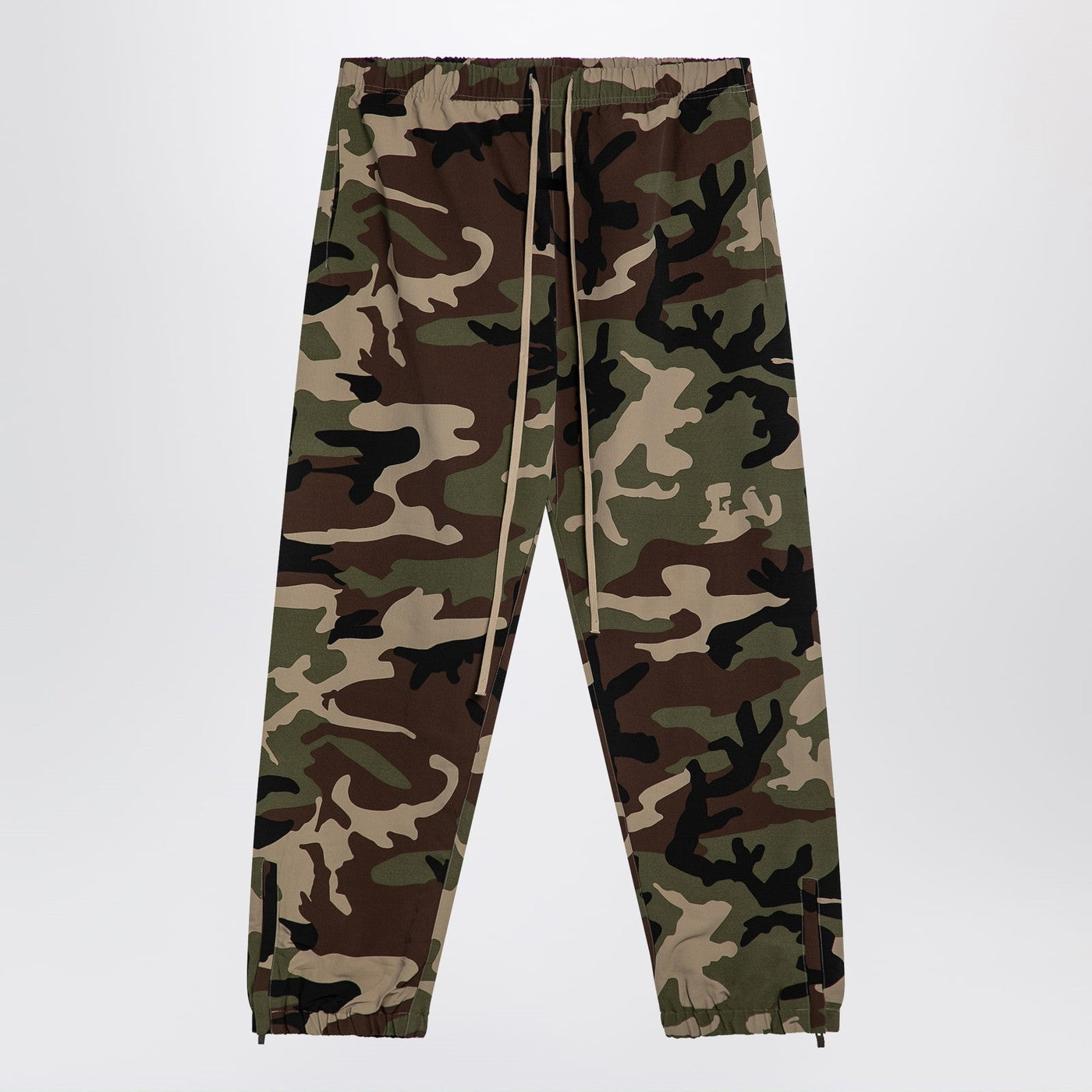 Camouflage-patterned recycled nylon blend trousers by Fear of God Essential, featuring an elasticated waistband with drawstring, two side welt pockets and an elasticated ankle with zip fastening.