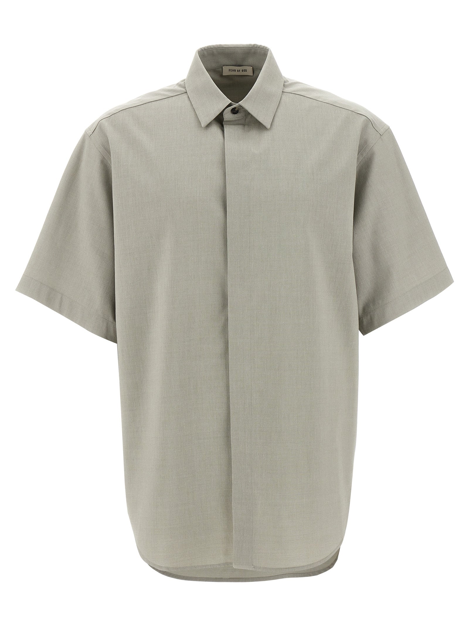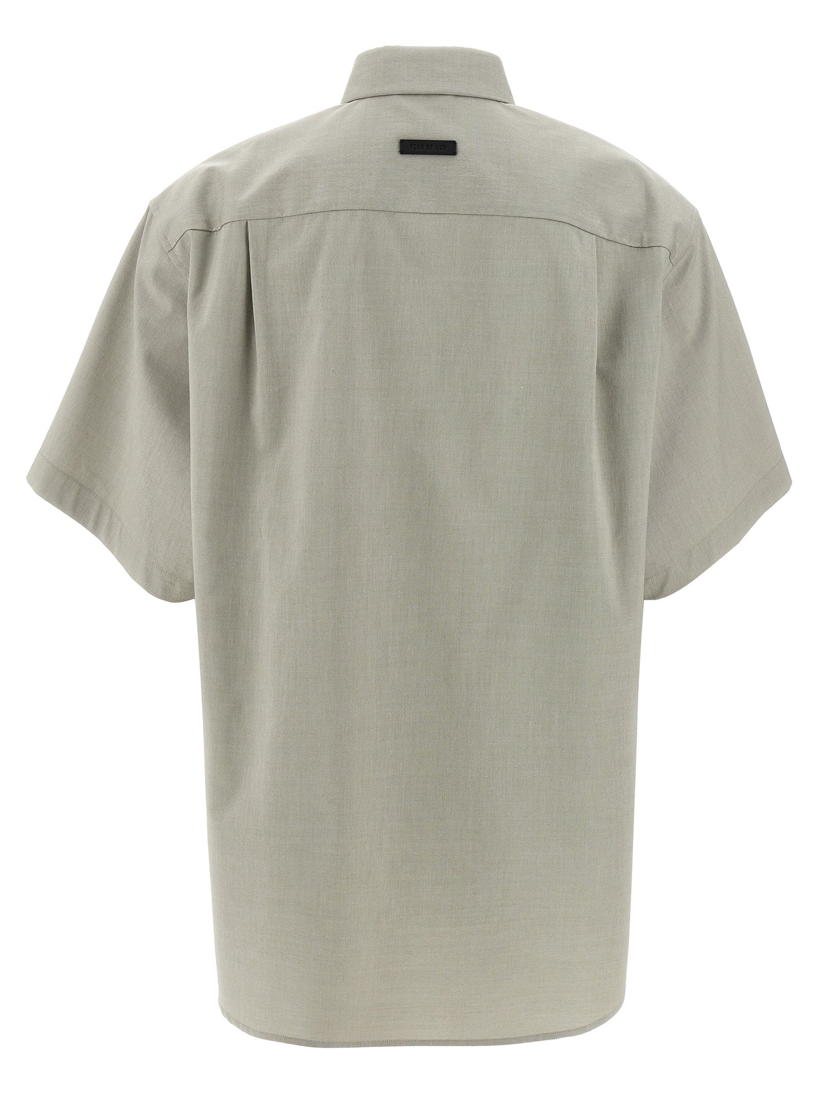 'Oxford' shirt in virgin wool and stretch cotton blend, front button closure, short sleeves with dropped shoulders, back leather logo patch.