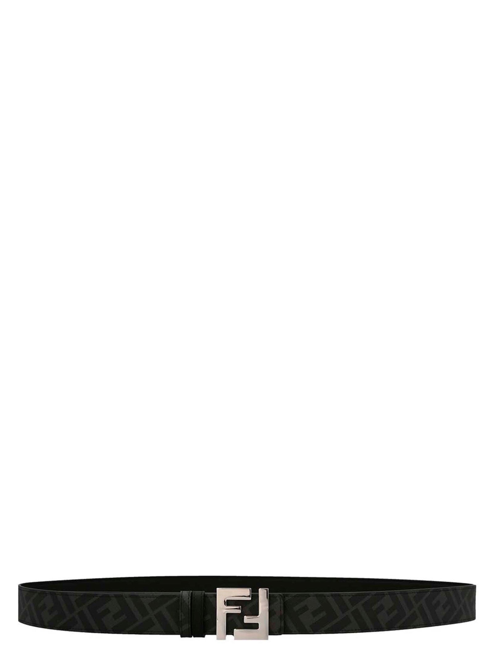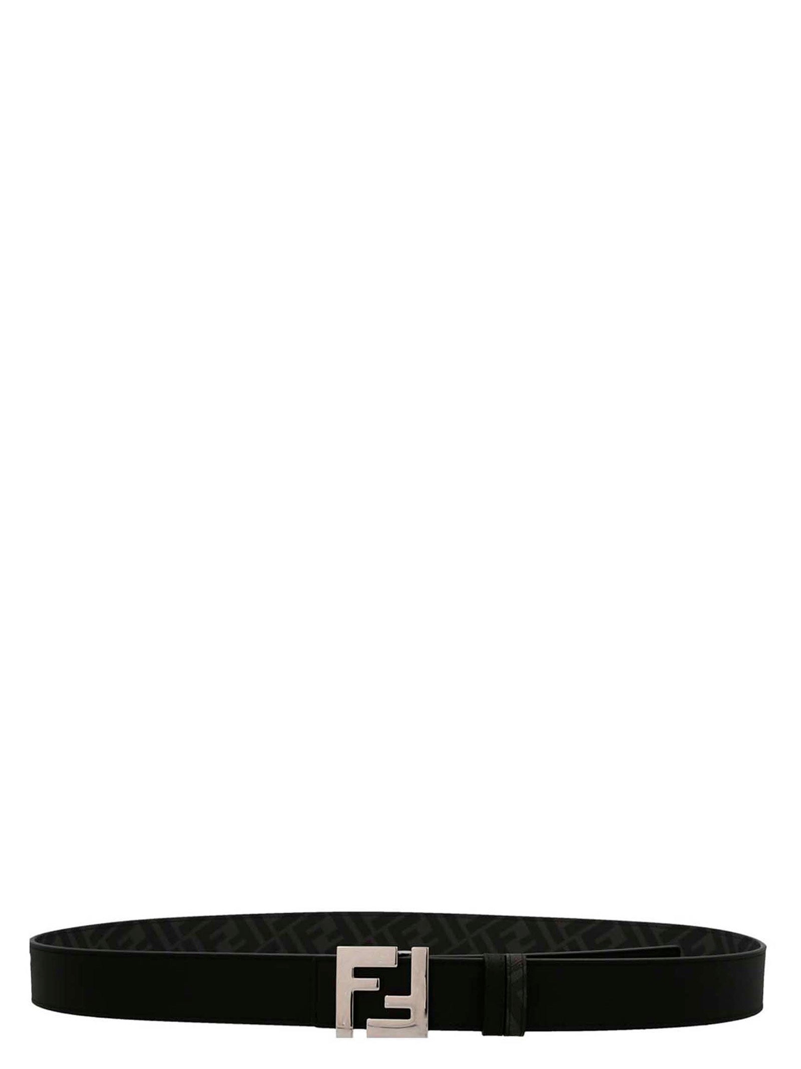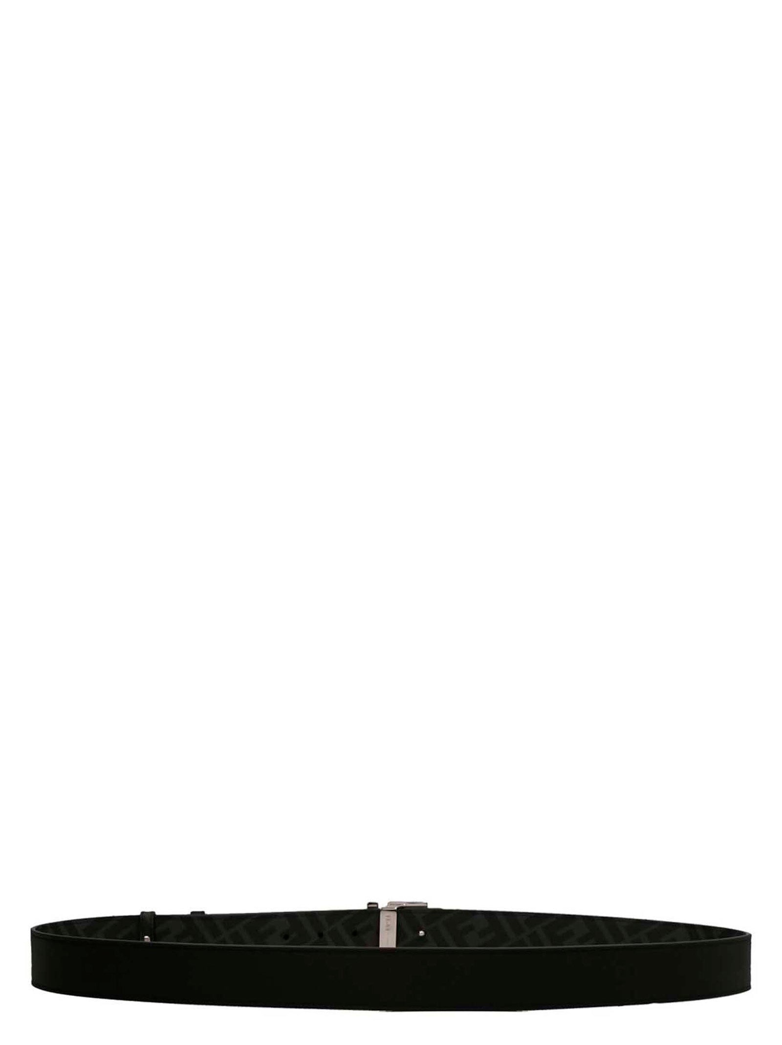 Reversible belt in black leather with 'FF' buckle with cufflink closure, fabric lining with black and grey FF pattern, palladium finish hardware.