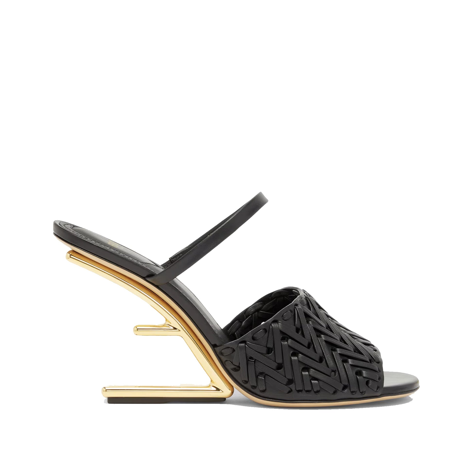 - Composition: 100% calf leather - Inner: 100% Leather - Insole: 100% Leather - Sole: 100% Rubber - Round toe - Elasticated side inserts - Heel 9,5 cm - Woven black leather - Diagonal F-shaped sculpture heel in golden metal - Made in Italy -