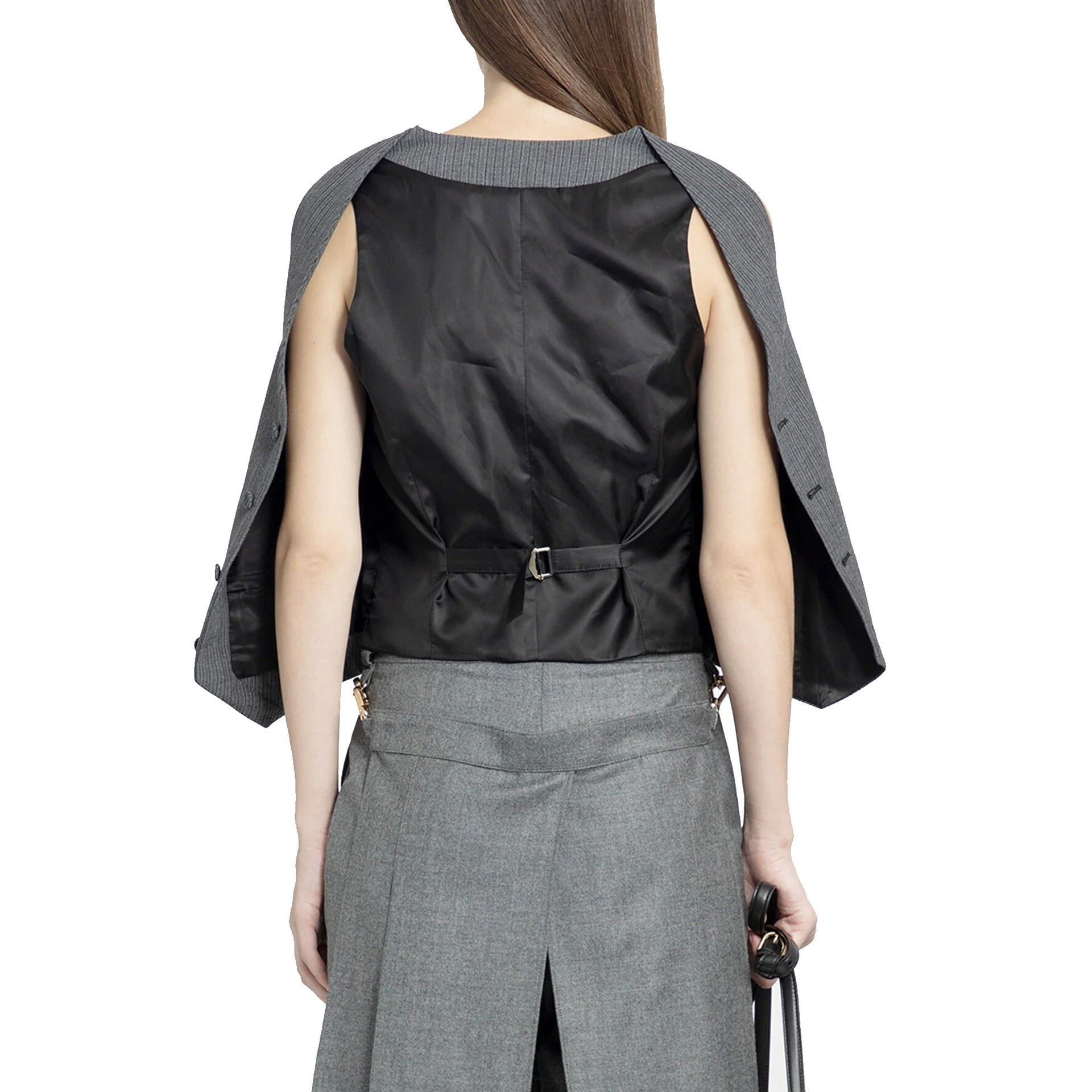 - Composition: 100% Virgin wool - Front button closure - The model is 177 cm tall and wears size IT 38 - Runway style - Cut-out shoulders - Back exposed satin lining - Back buckled strap - Pinstriped - Made in Italy -