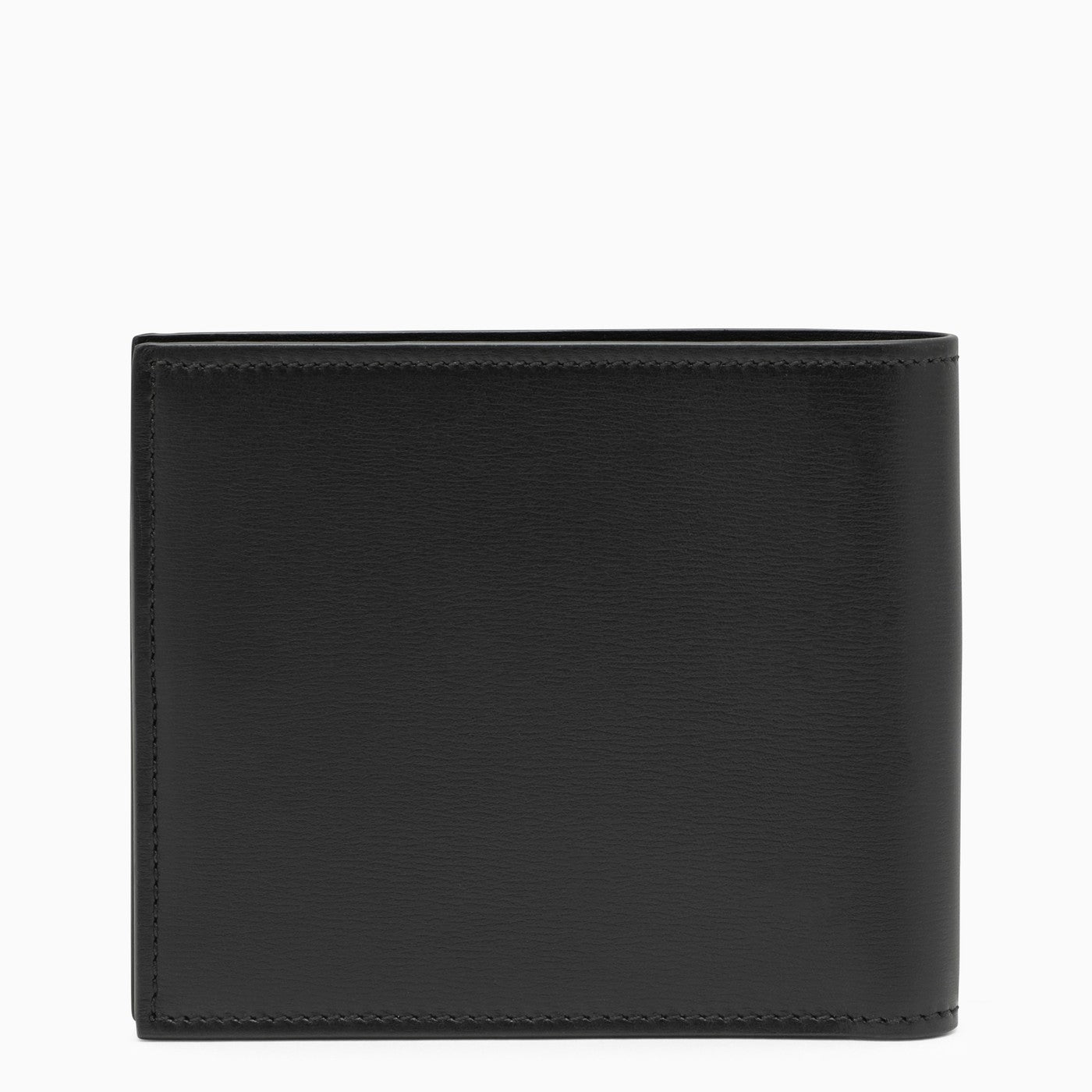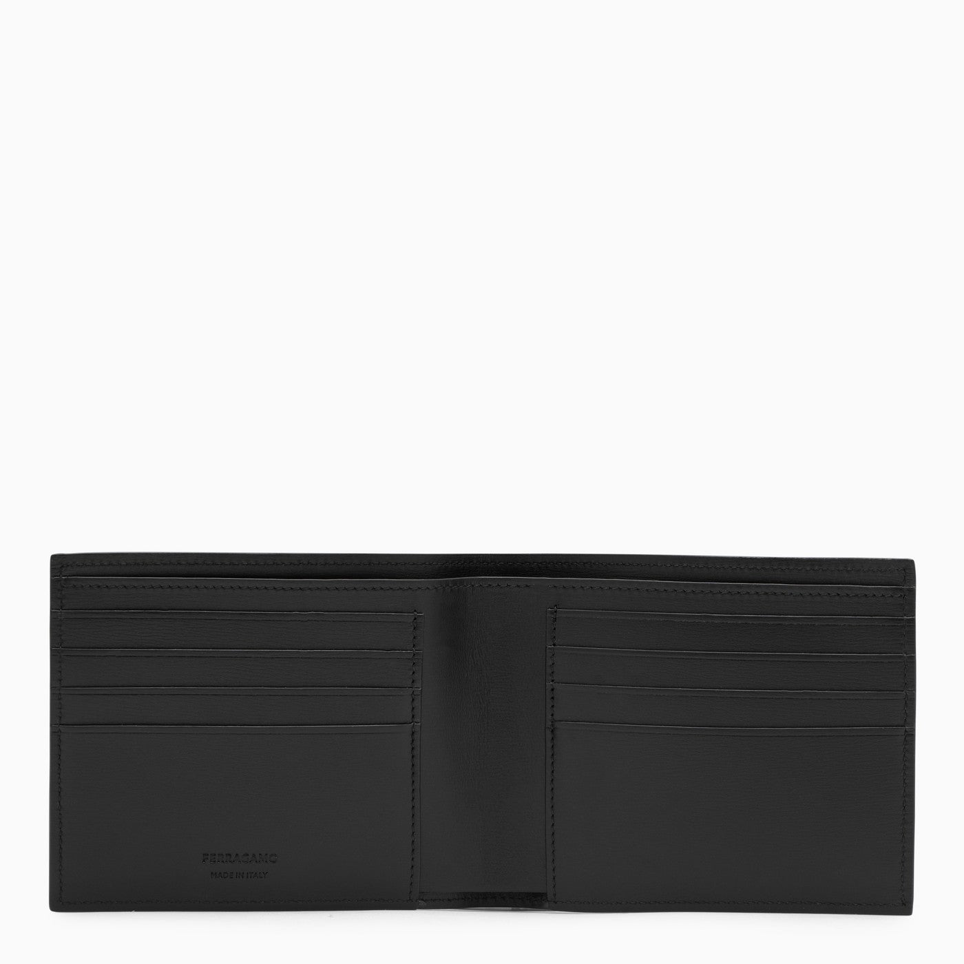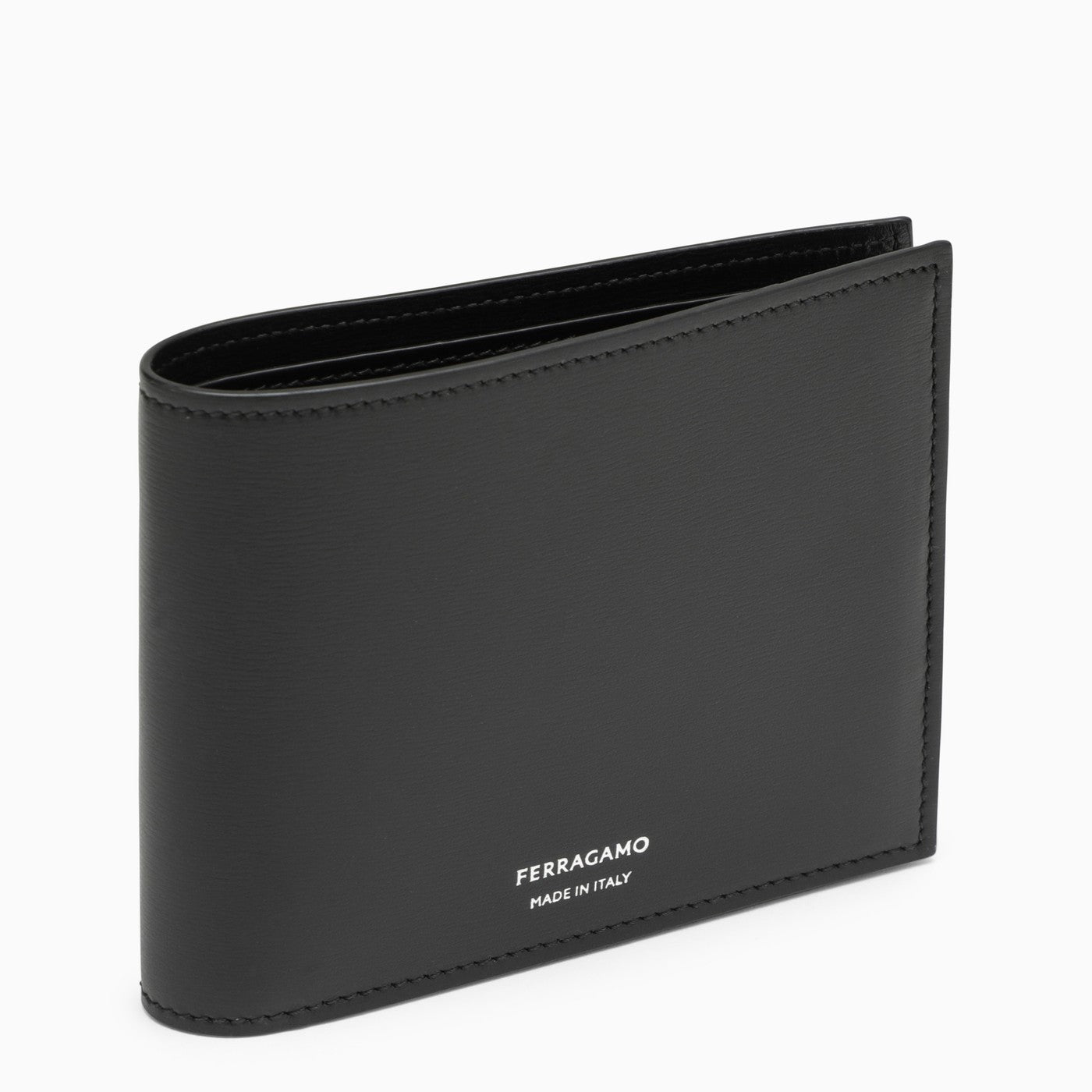 Black leather wallet by Ferragamo featuring contrasting front lettering logo, eight internal card slots and a banknote pocket.