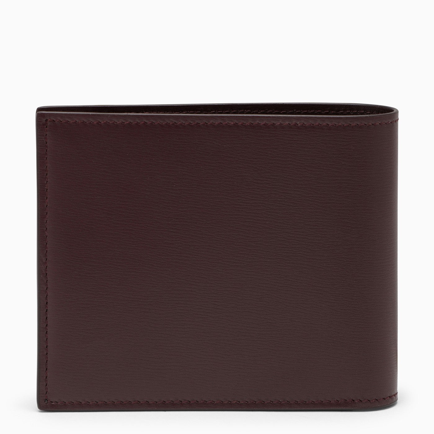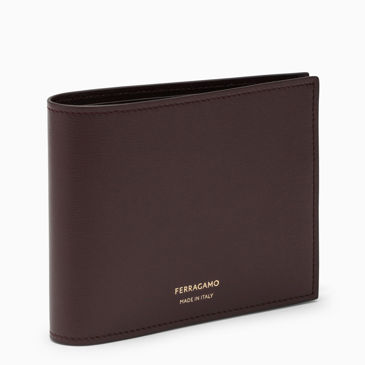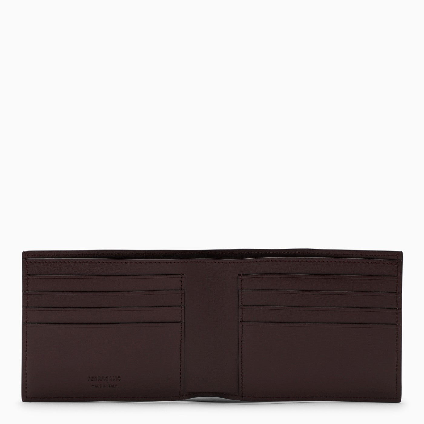 Wallet in dark Barolo-coloured leather by Ferragamo, featuring a contrasting front lettering logo, eight internal card slots and a banknote pocket.