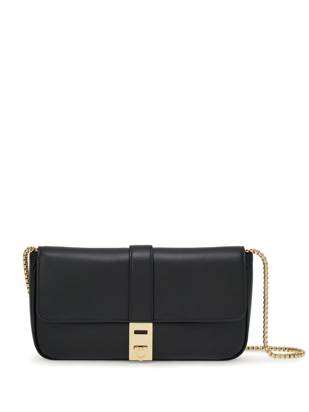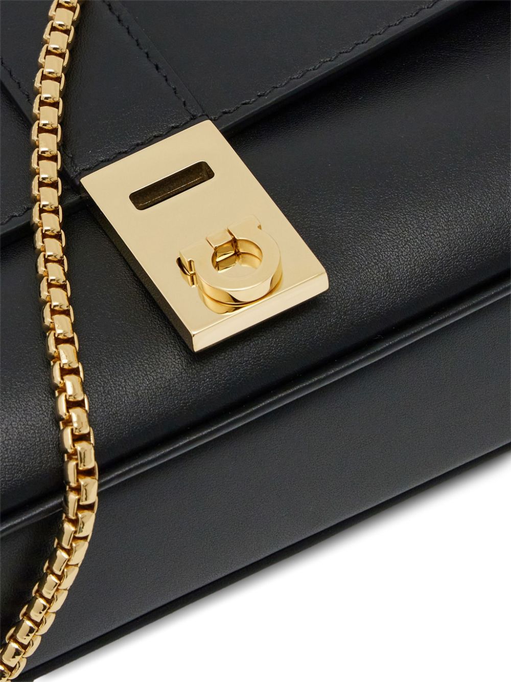 black calfskin Gancini plaque gold-tone hardware chain-link shoulder strap folded design twist-lock fastening main compartment internal card slots