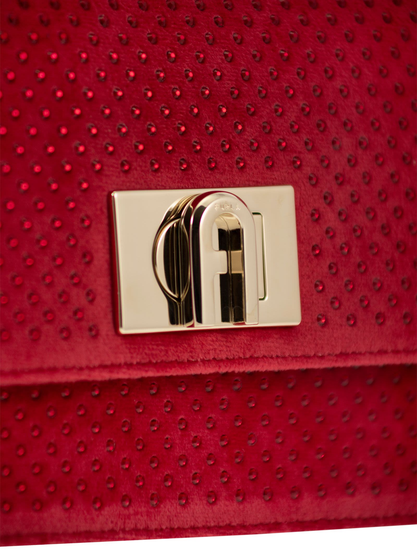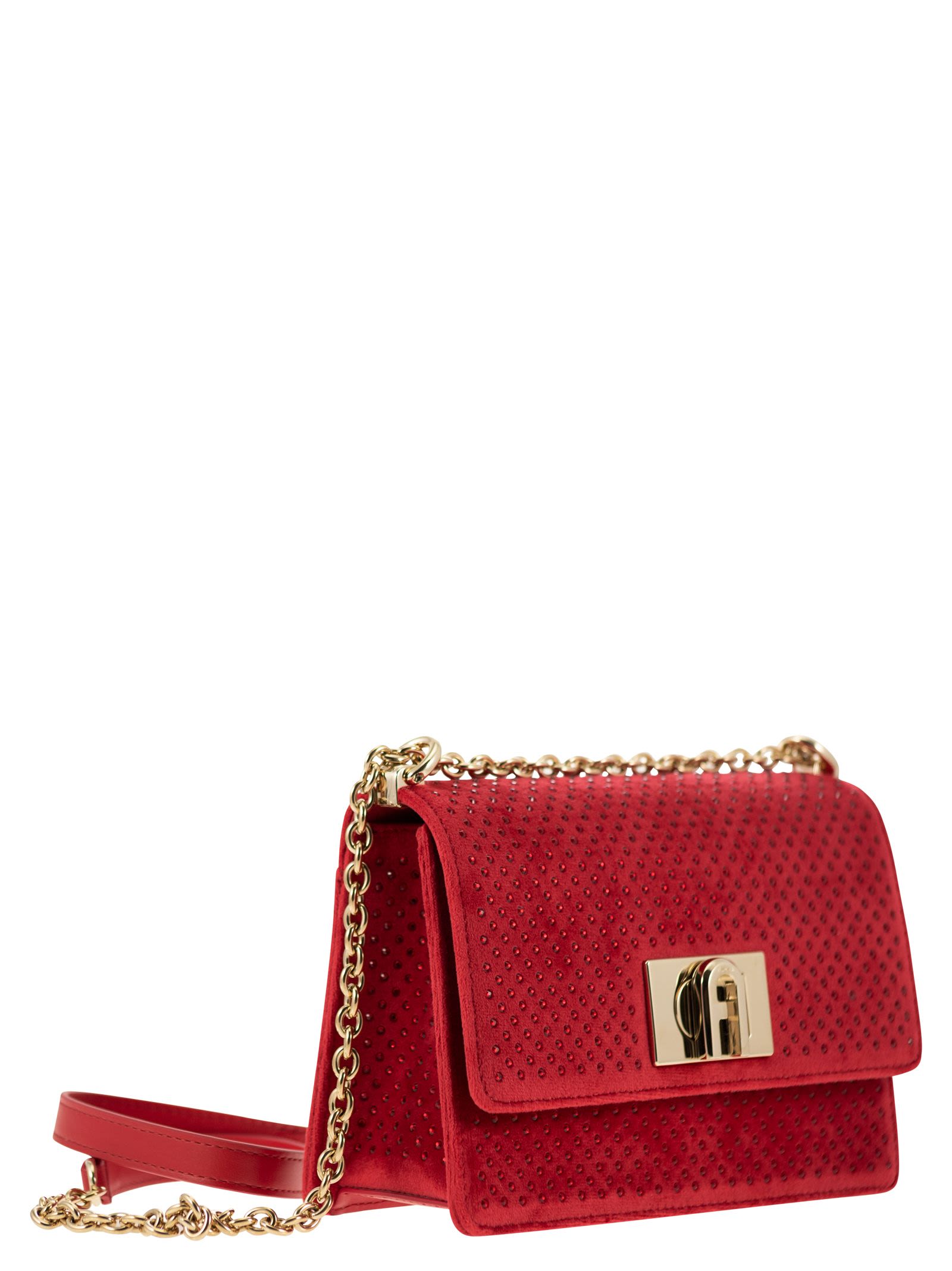Perfect capacity for small objects and personal effects: Furla 1927 is a mini bag to be worn on the shoulder or over the shoulder. Made of soft, silky-soft velvet, it stands out for its all-over applied tone-on-tone rhinestones, making it the perfect glittering accessory to brighten up any look. - Inside open pocket - Exterior open back pocket - Adjustable chain shoulder strap with leather split - Sling clasp with Arco logo DESIGNER ID: BAFKACO BX1472 2673S
