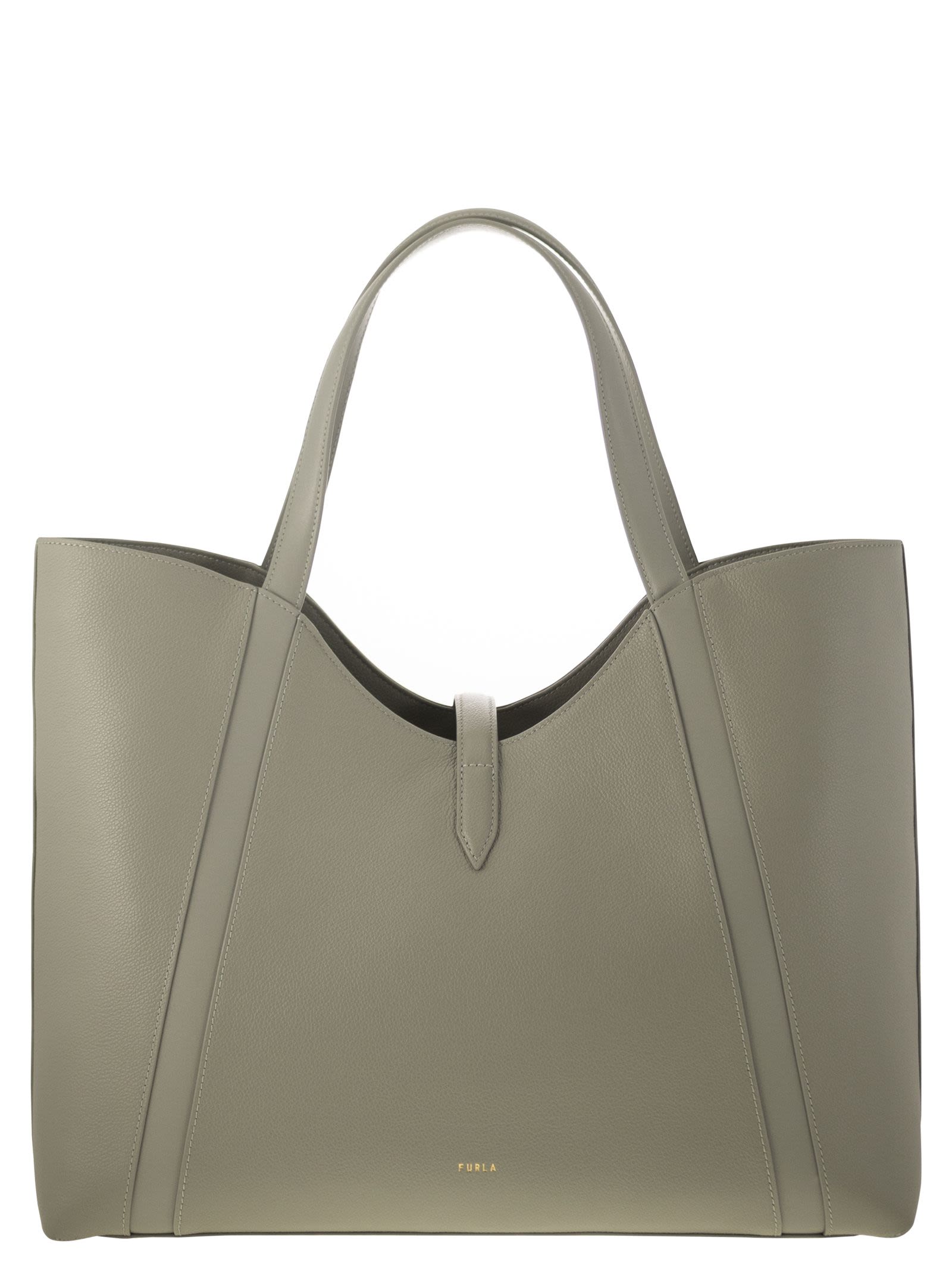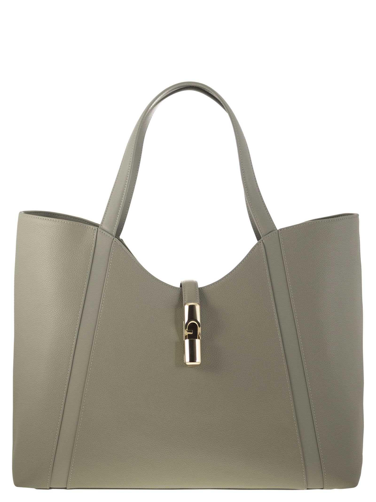 Fine grained leather creates a textural contrast with the details and double handles made of smooth leather that define the Furla Goccia bag. The soft, deconstructed silhouette is enriched by a strap embellished with the new cyclindrical hardware decorated with Furla's iconic Arco logo that holds the model closed. Proposed in an extra-large size, it is ideal for holding all the essentials and more. - Interior wall pocket with zip closure - Two open internal wall pockets - Metal feet - Furla logo printed on the front Interior details - 2 Open Flat Pockets/1 Zip Pocket Exterior details - Furla Logo Punched/Double Shoulder Handles DESIGNER ID: WB01498 BX3353 AG700
