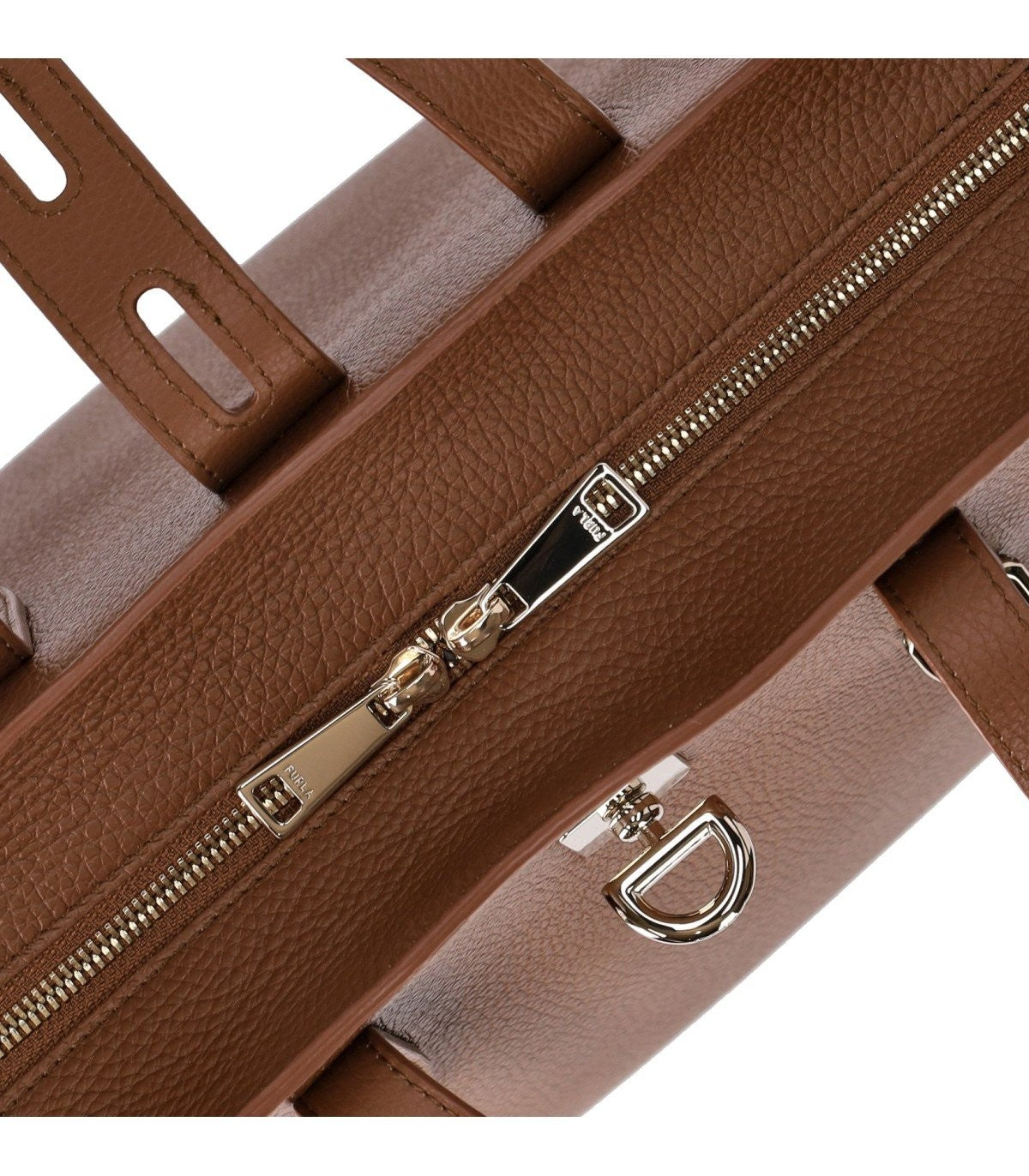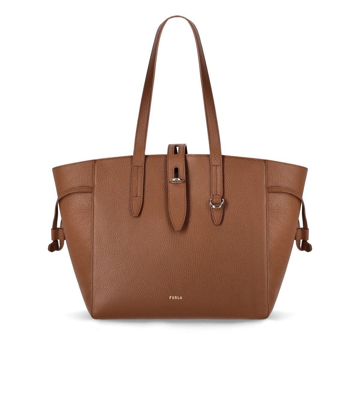 Furla Net M shopping bag made of hammered cognac-colored leather, with an interior equipped with pouch pockets and side bellows. It features golden metal details and a swivel closure. Measures 29x26.5x16 cm. Composition: 100% leather. Interior composition: 50% nylon, 50% polyurethane.