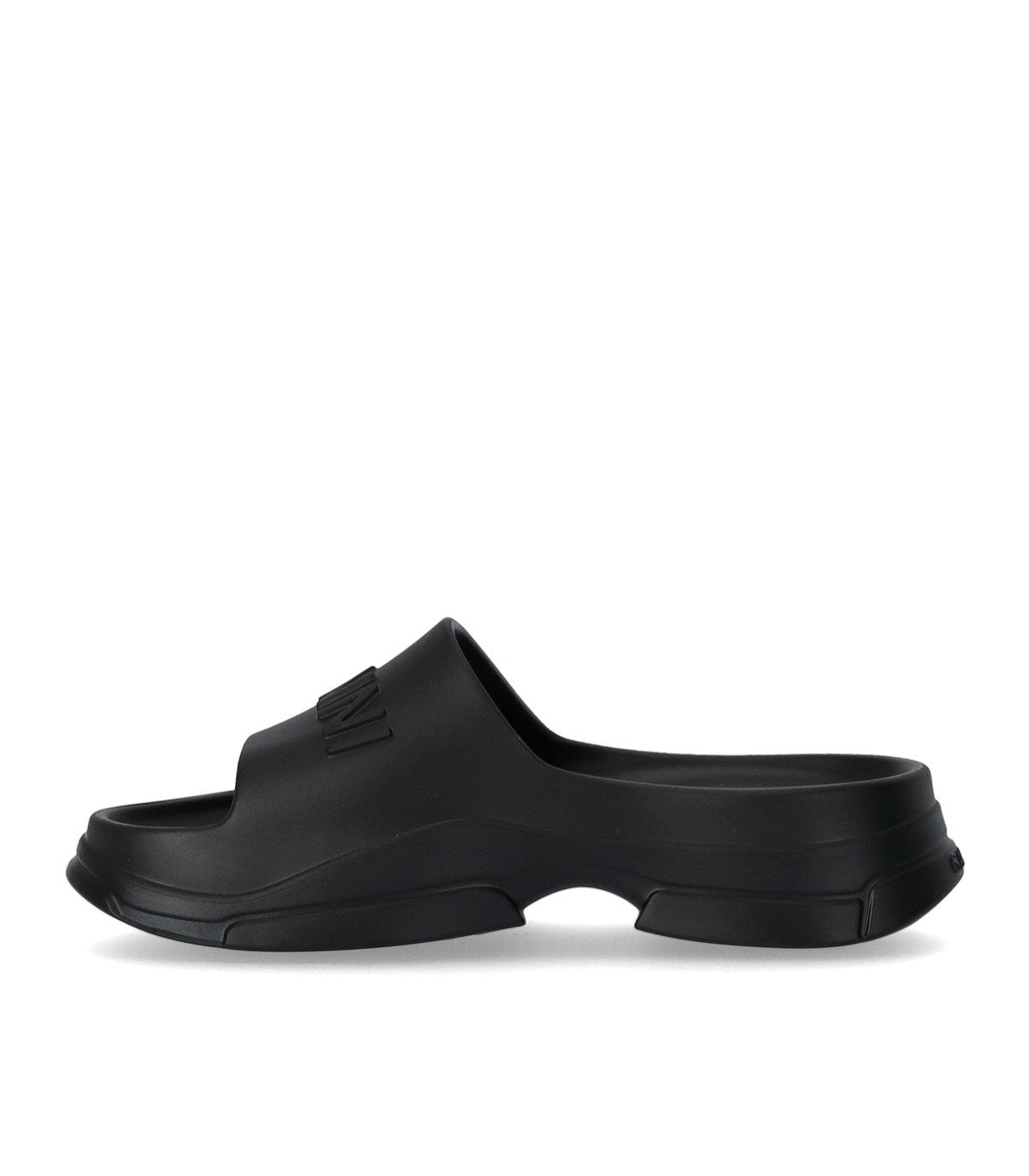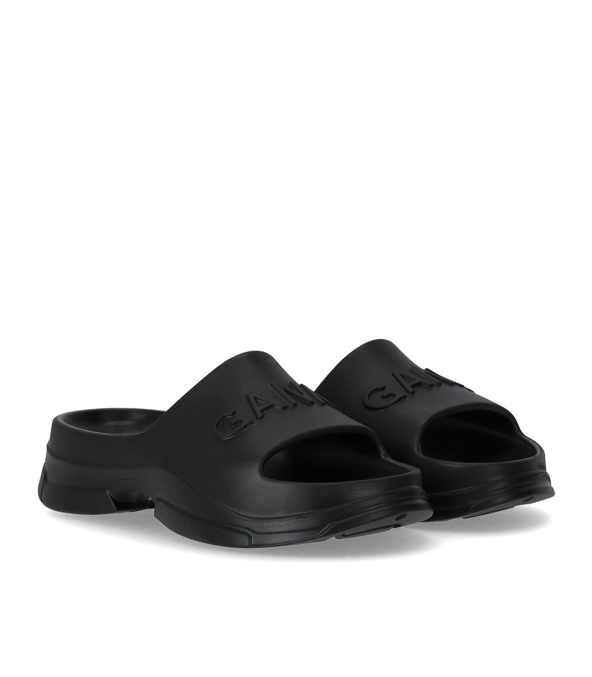 Ganni slide made from sugarcane resin in shades of black. Embossed logo, sole height 5 cm. Composition: 70% sugarcane resin, 30% ethylene vinyl acetate.