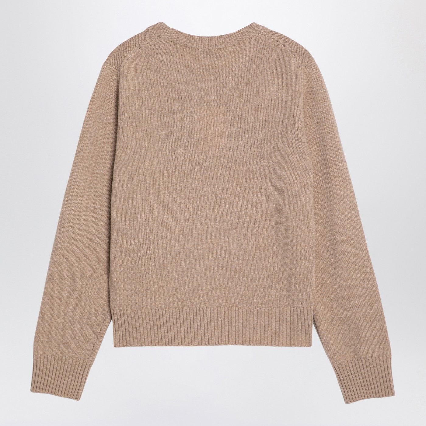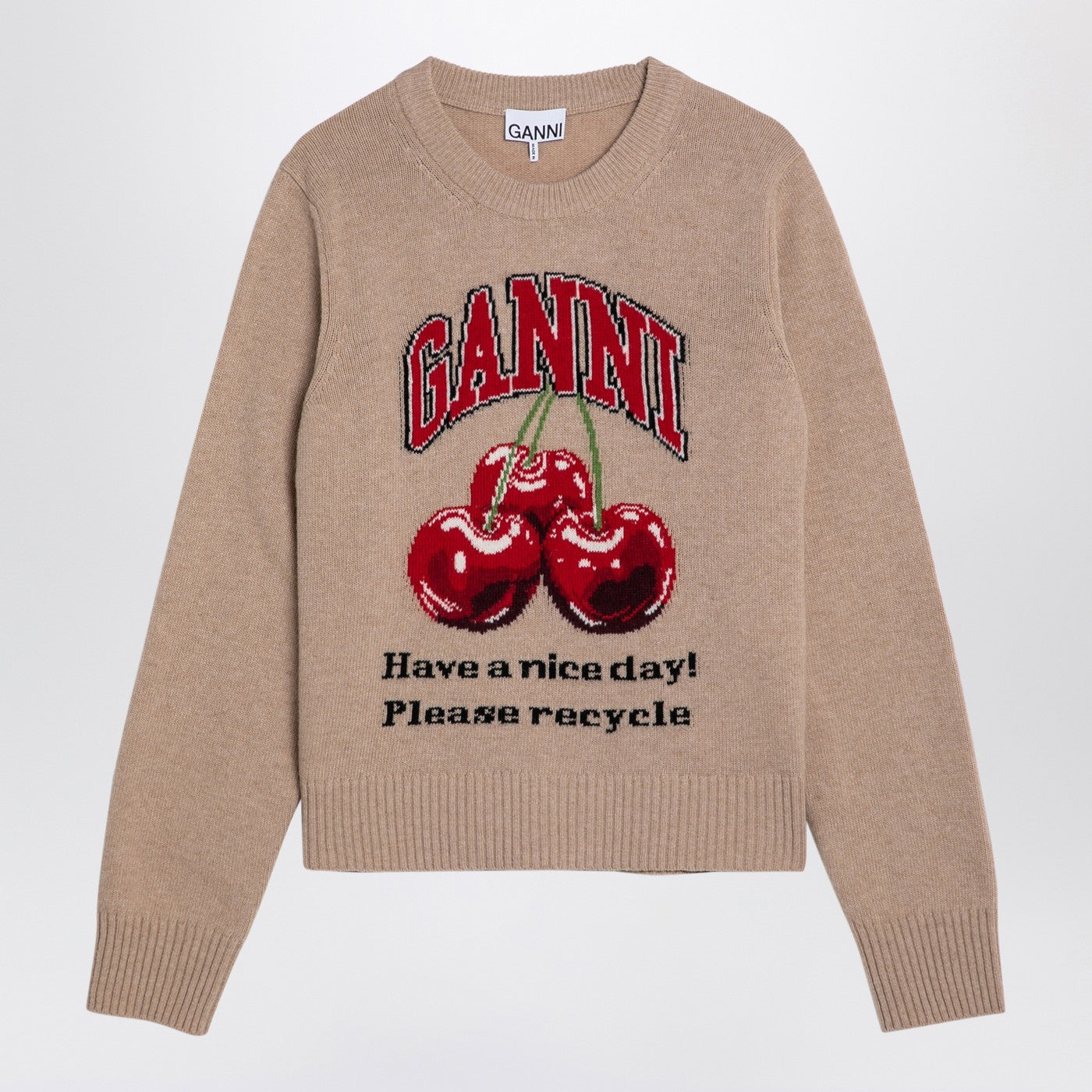 Crewneck jumper by Ganni in camel-coloured recycled wool blend, featuring Cherry inlay and logo on the front, long sleeves, ribbed collar, cuffs and hem.