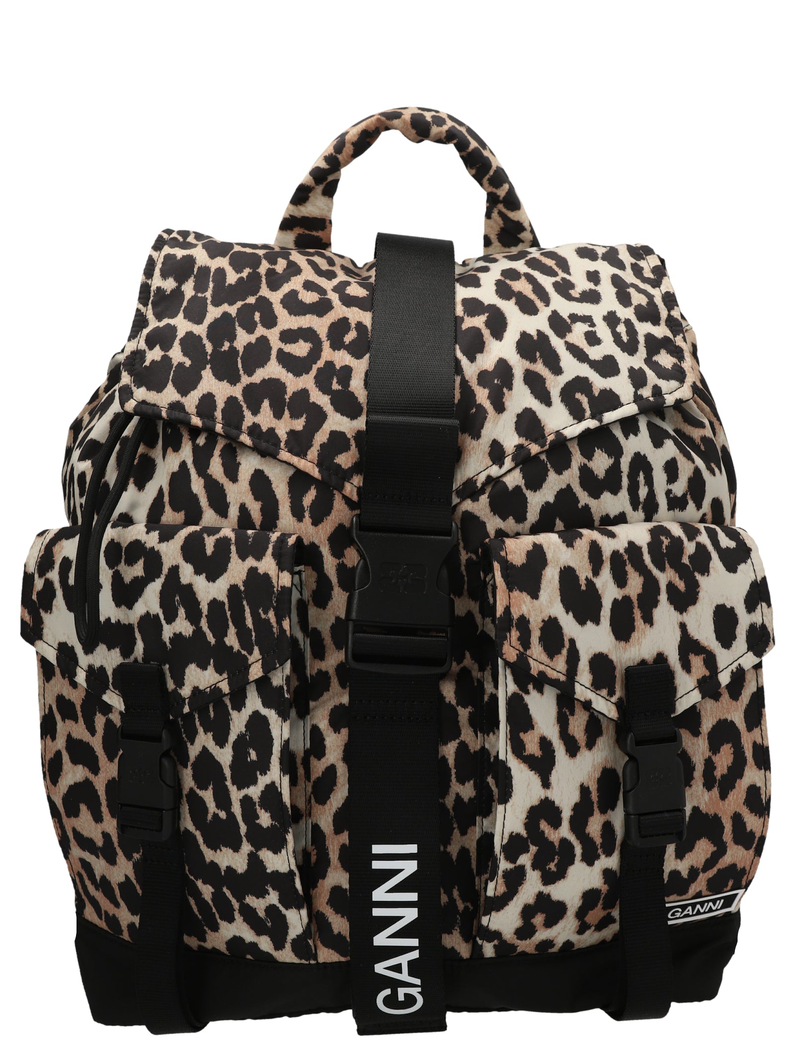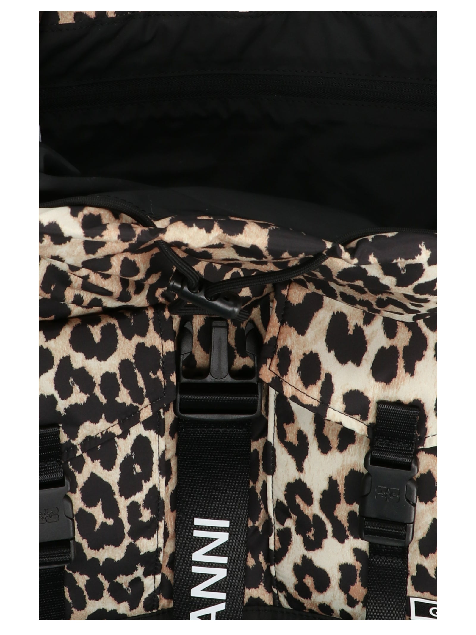 'Leopard Tech' backpack in animal print polyester with adjustable and padded shoulder straps, top handle, front buckle closures, front pockets, logo print.ogo print.