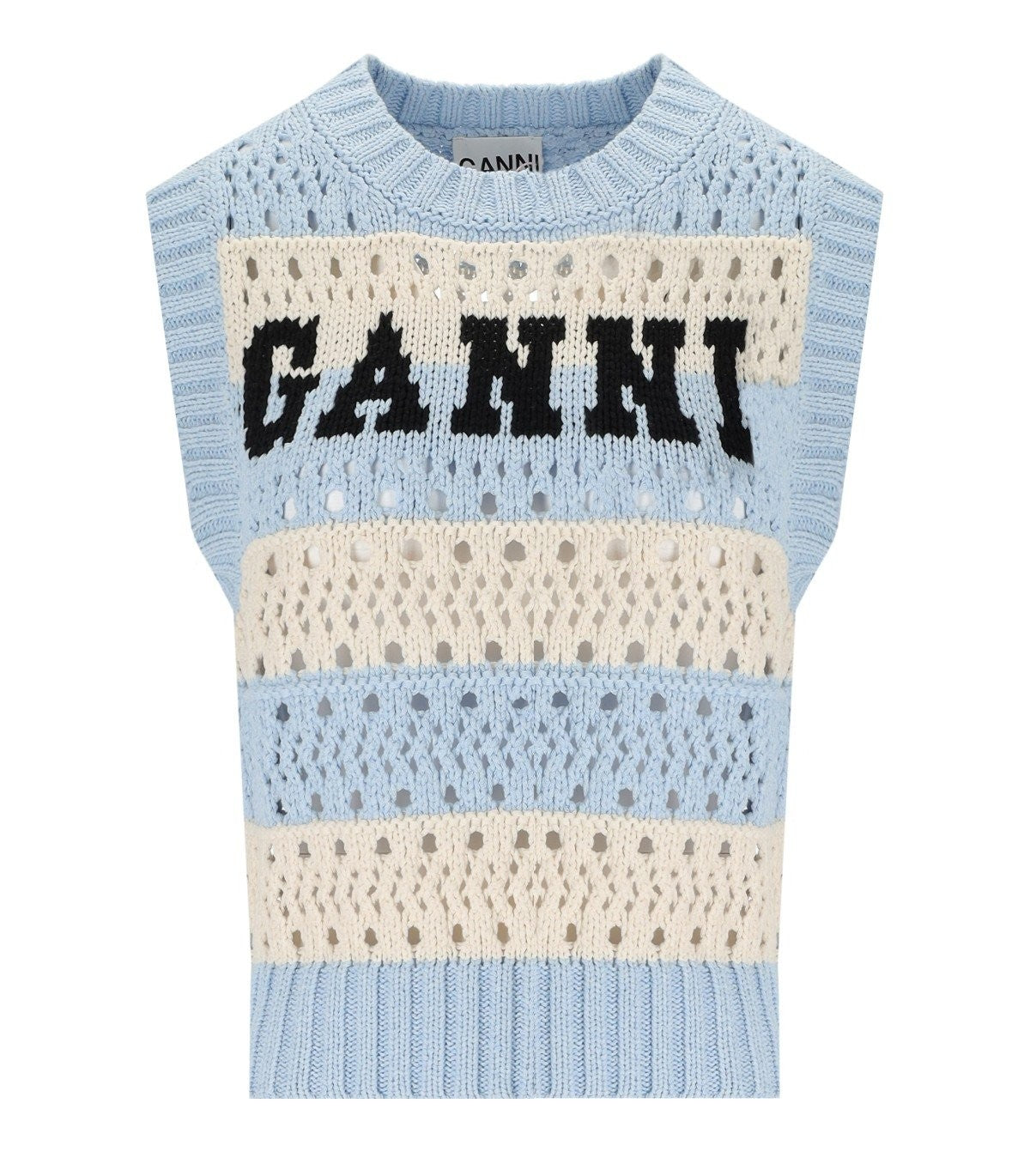 Ganni vest made of recycled cotton blend knitted fabric, featuring horizontal stripes in shades of light blue and white. Characterized by a classic crew neck, it has an embroidered logo on the front. Finished with ribbed detailing on the hem, armholes, and neckline. Regular fit. Composition: 50% recycled cotton, 50% recycled polyester.