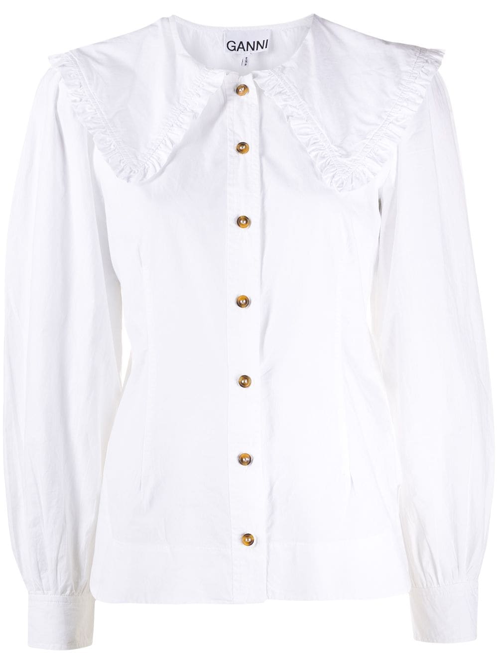 Bright white organic cotton oversized-collar buttoned blouse from GANNI featuring spread collar, front button fastening, long puff sleeves, buttoned cuffs and curved hem.