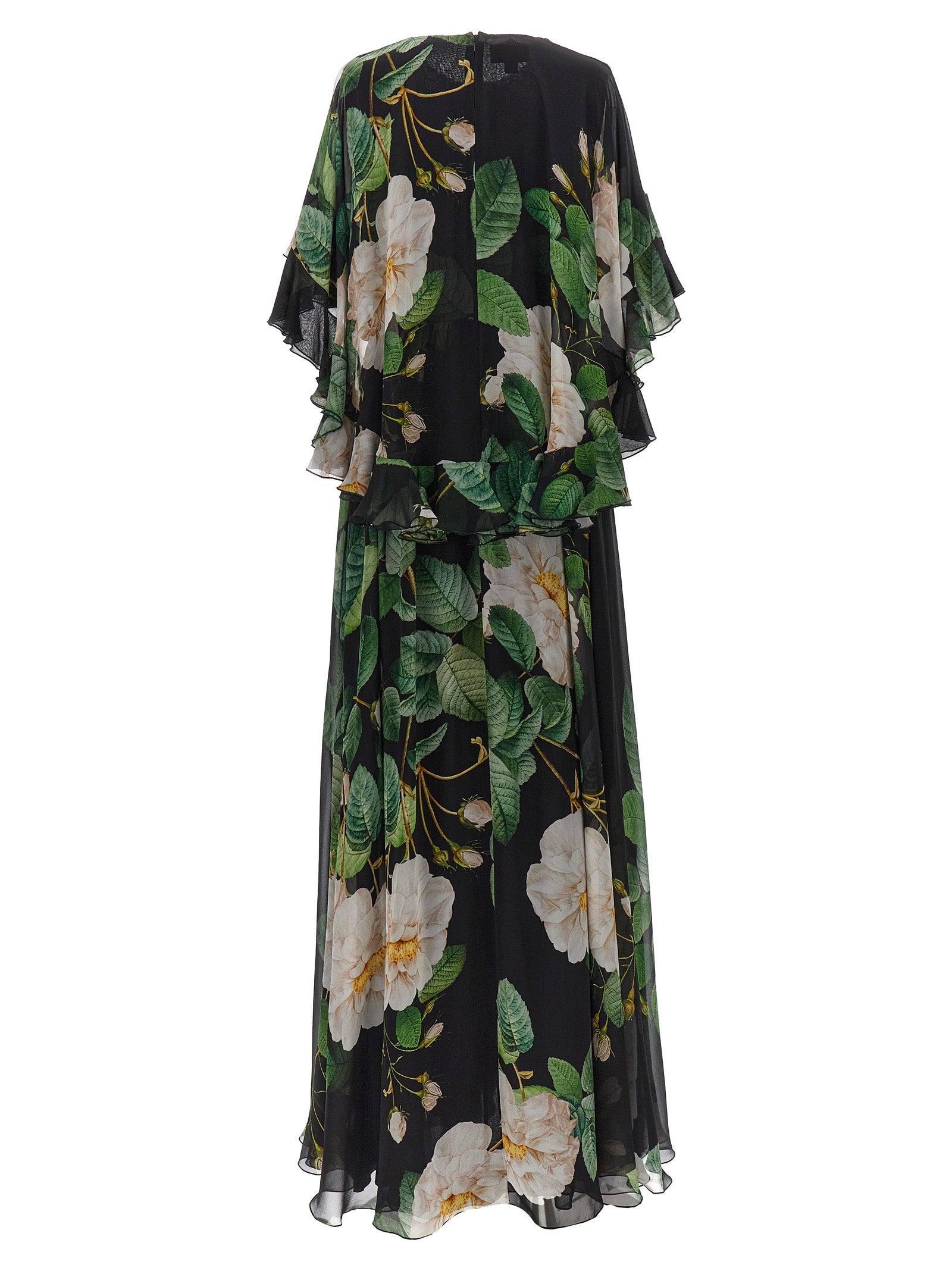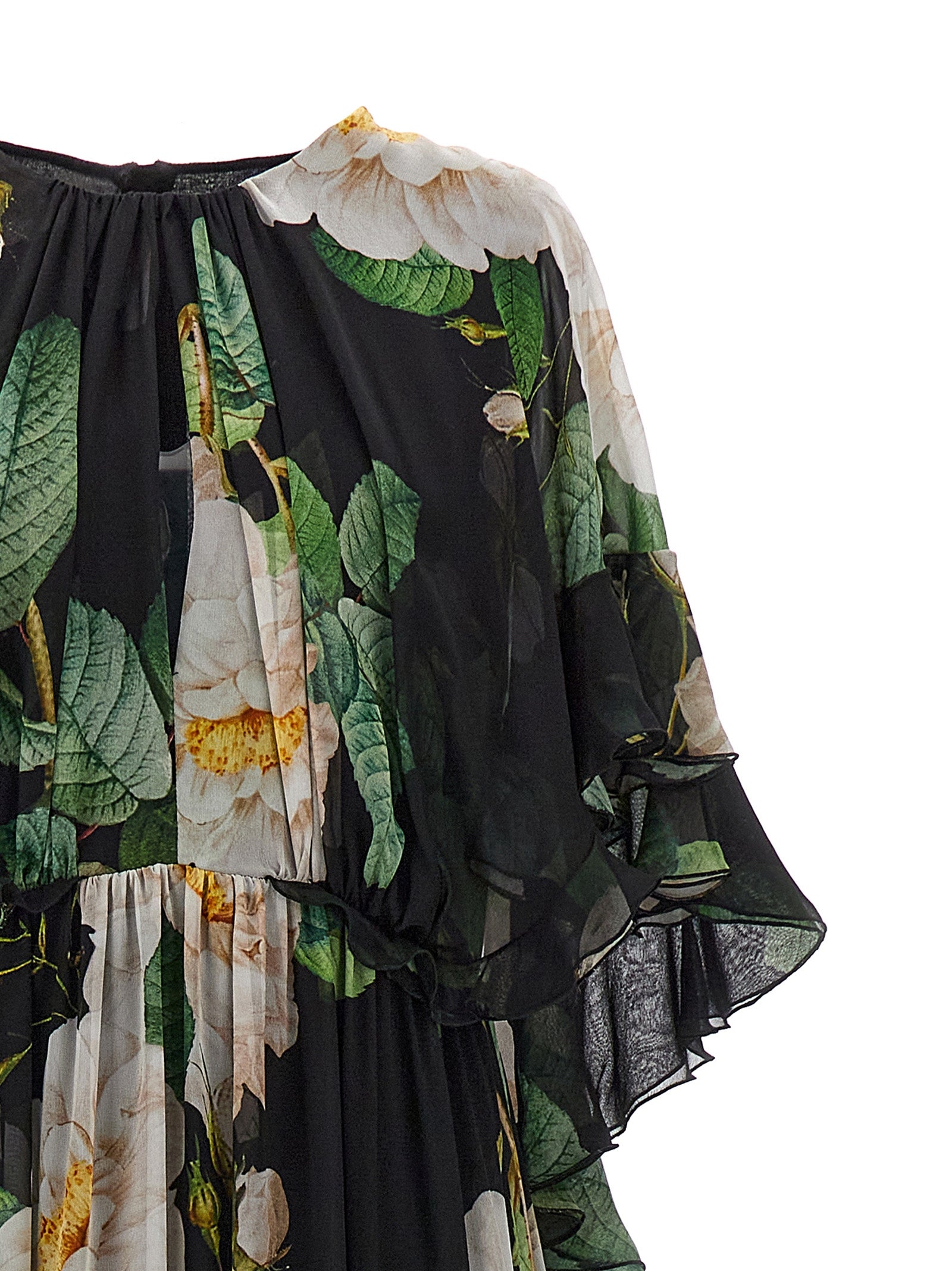 All-over 'Giant Bloom' floral print silk dress, ruffle sleeves, crew neck, back zip closure.