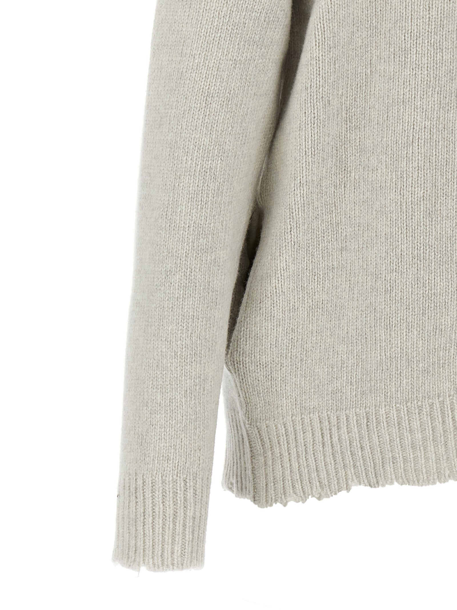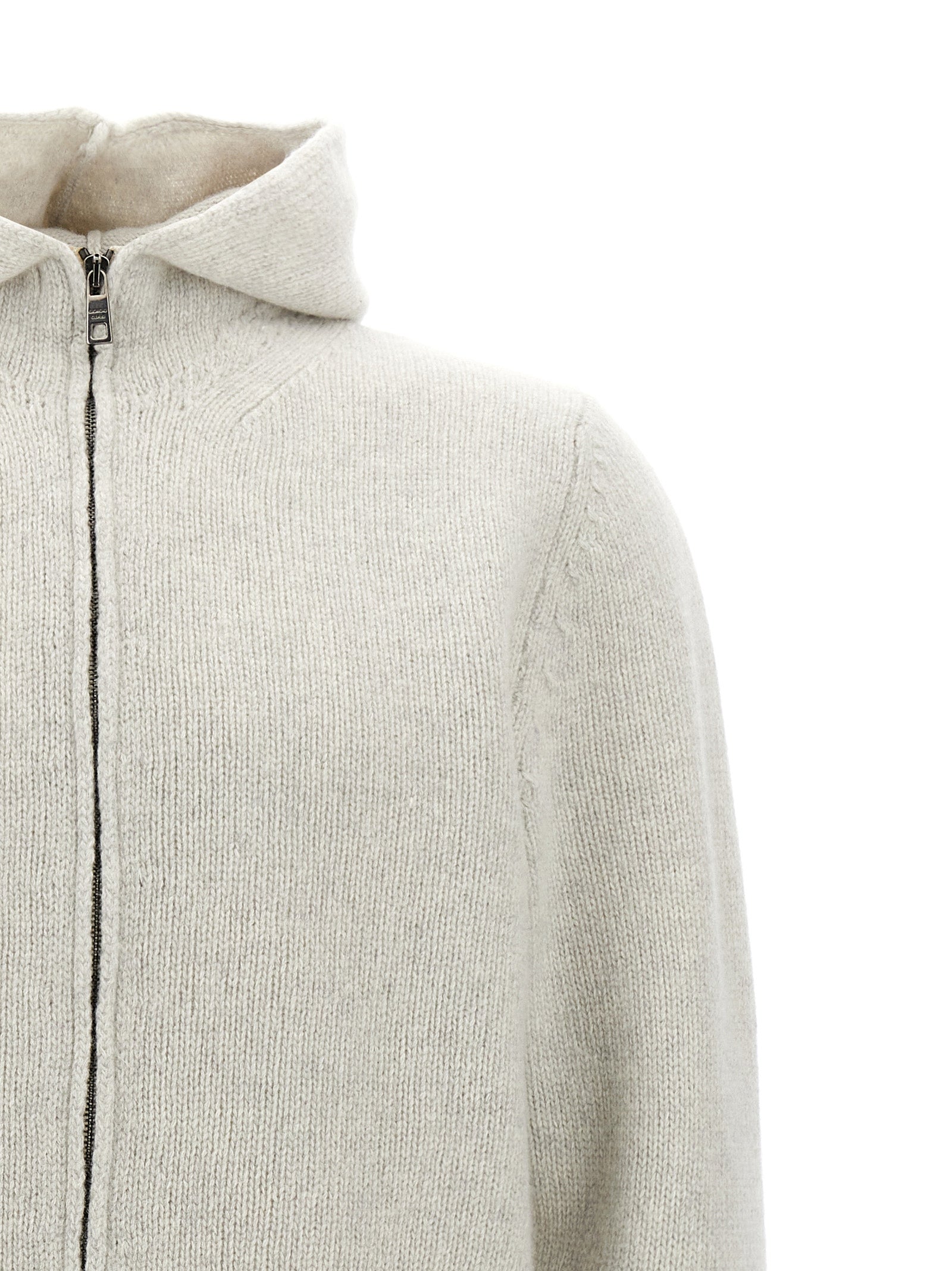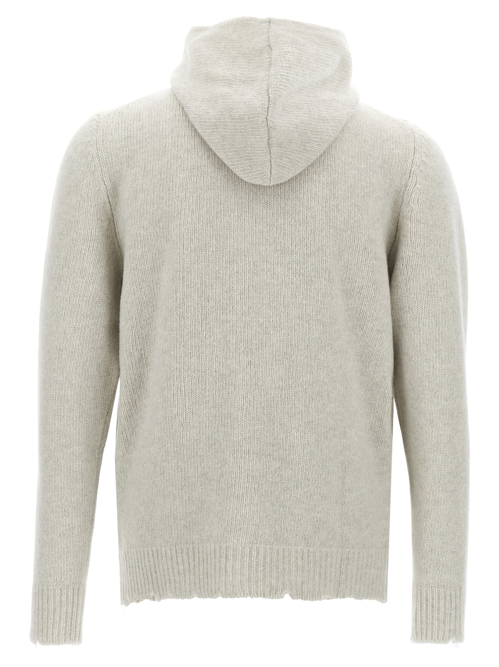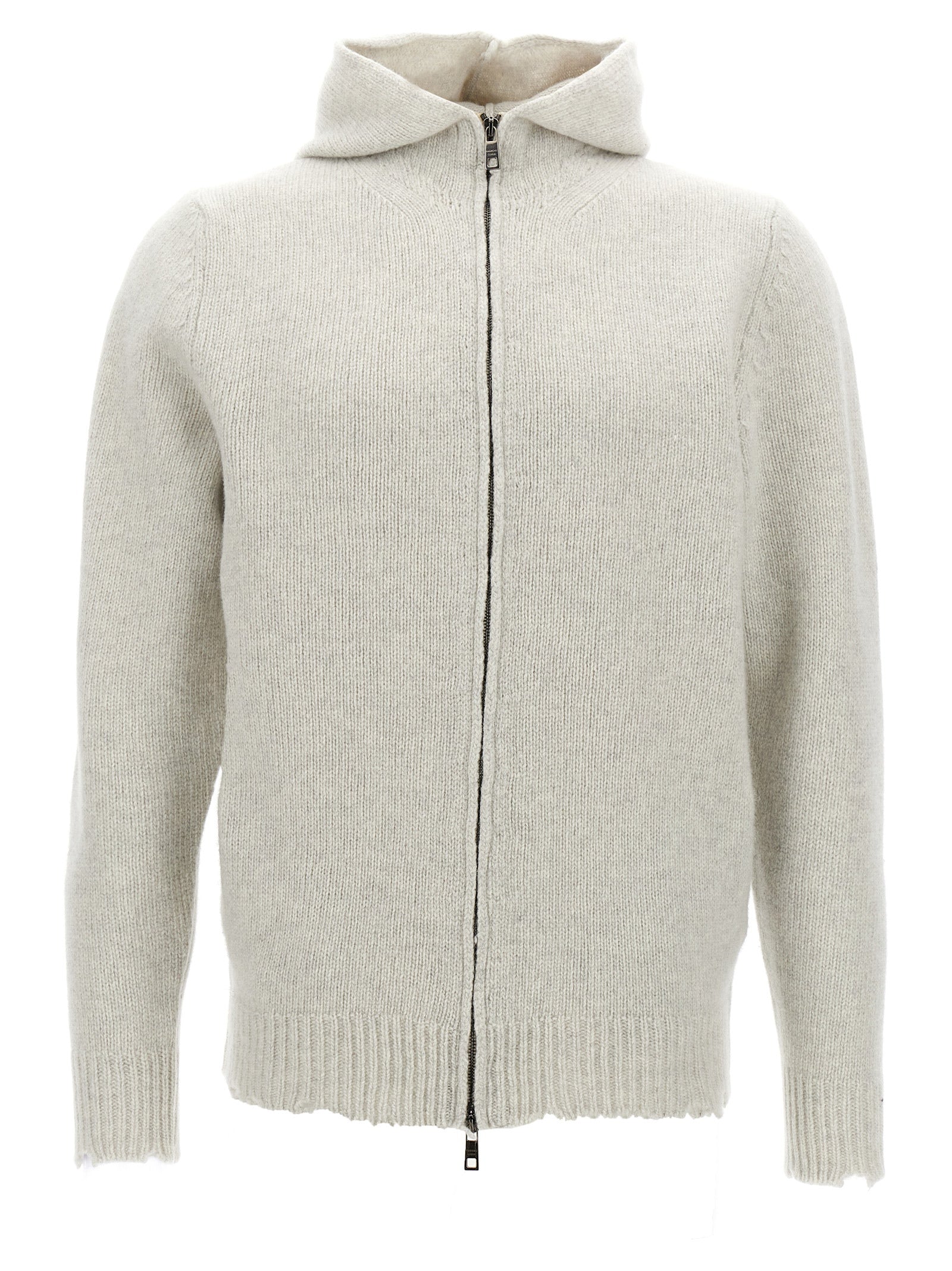 Hooded wool cardigan with destroyed effect details, zip closure, pockets, long cuffed sleeves.